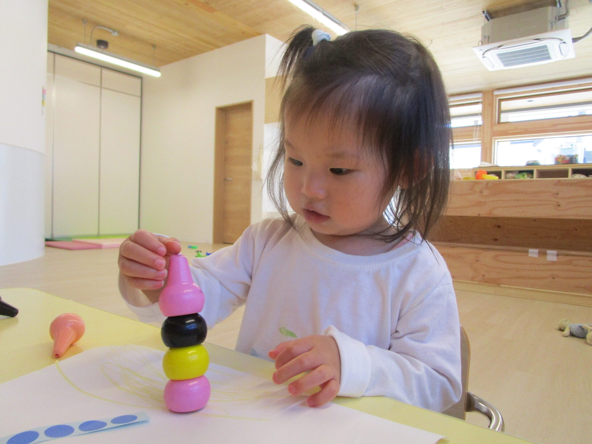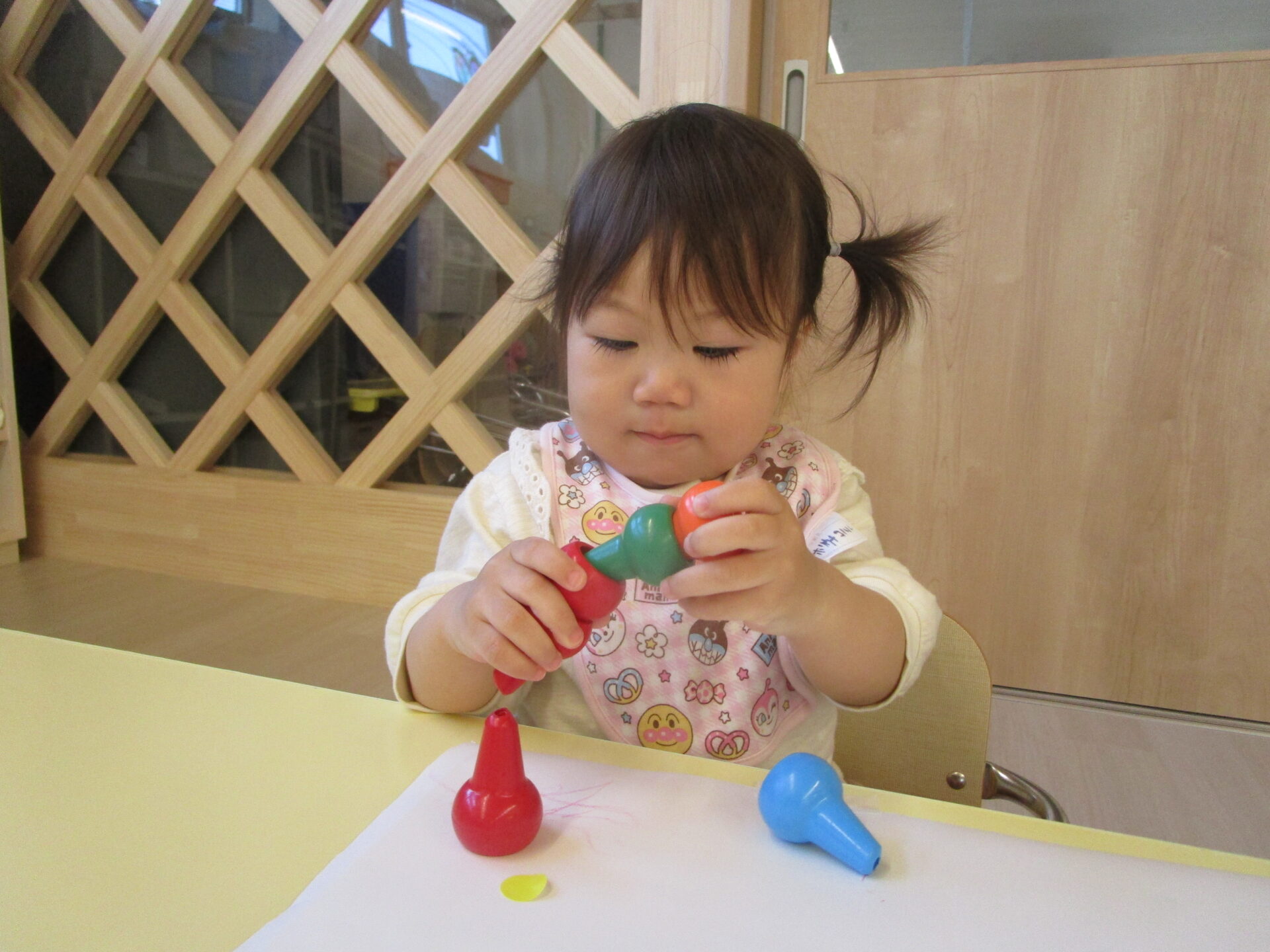 表現遊びのひとつとして、クレヨンでのお絵かきを楽しんでいますが、お絵かき遊びからクレヨンを積み重ねて遊ぶことを発見し、それから倒さずにまっすぐ持つことへ・・・と、遊びが発展するなかで指先を使った動きが巧みになってきています。