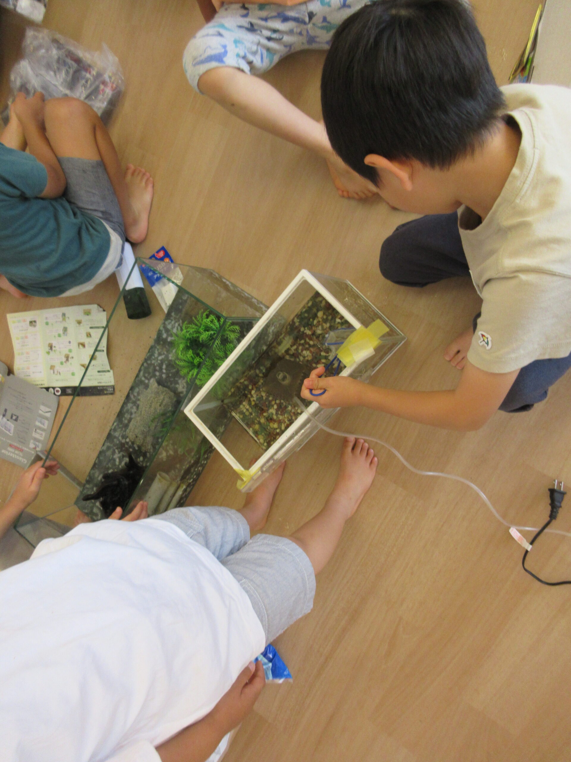園に戻ると、早速水槽作りを始めていました。