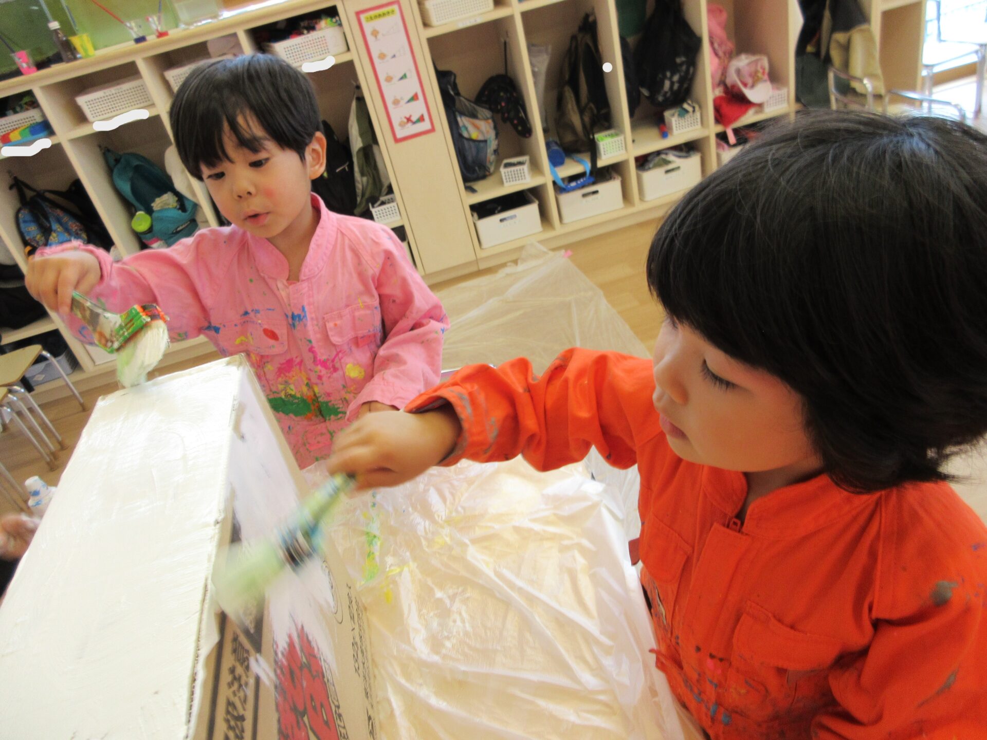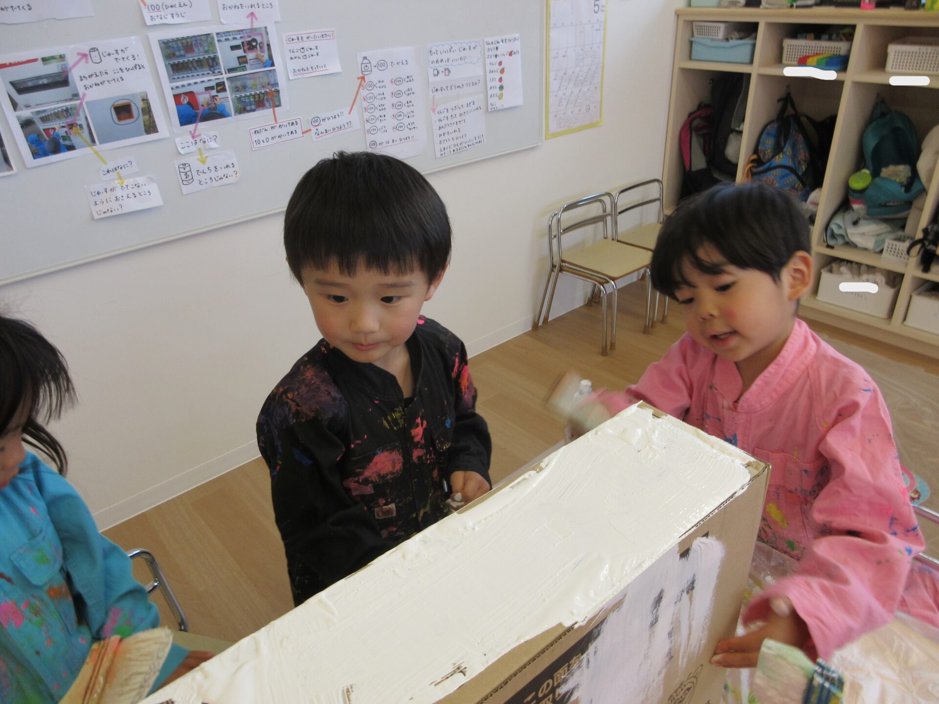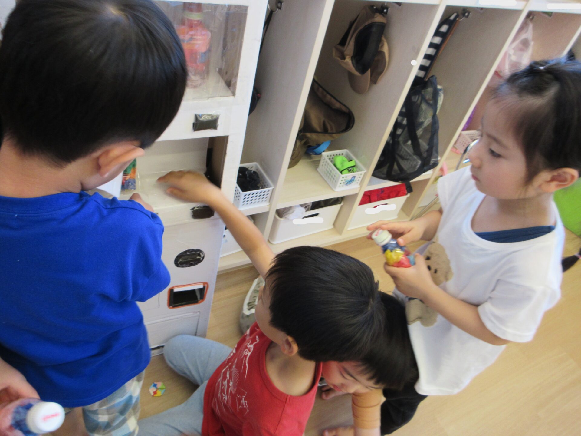 自動販売機に興味を持ち、保育者が作った自動販売機で遊んでいるうちに、「もっと、こうしよう!」と、自分たちで自動販売機を作っちゃいました。
