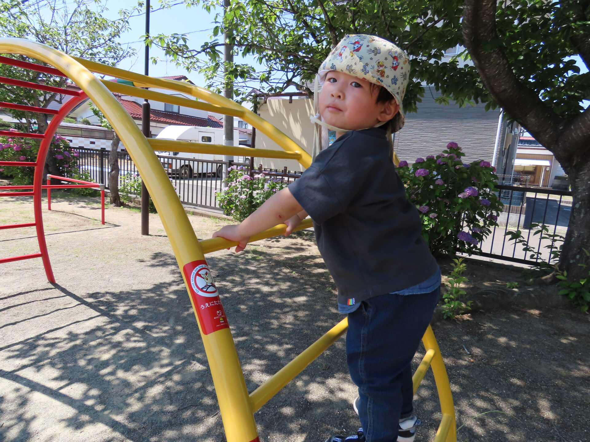 園から公園までは大人の足で10分もかからない場所にありますが、2歳児のこどもたちにとっては、なかなかの距離です。