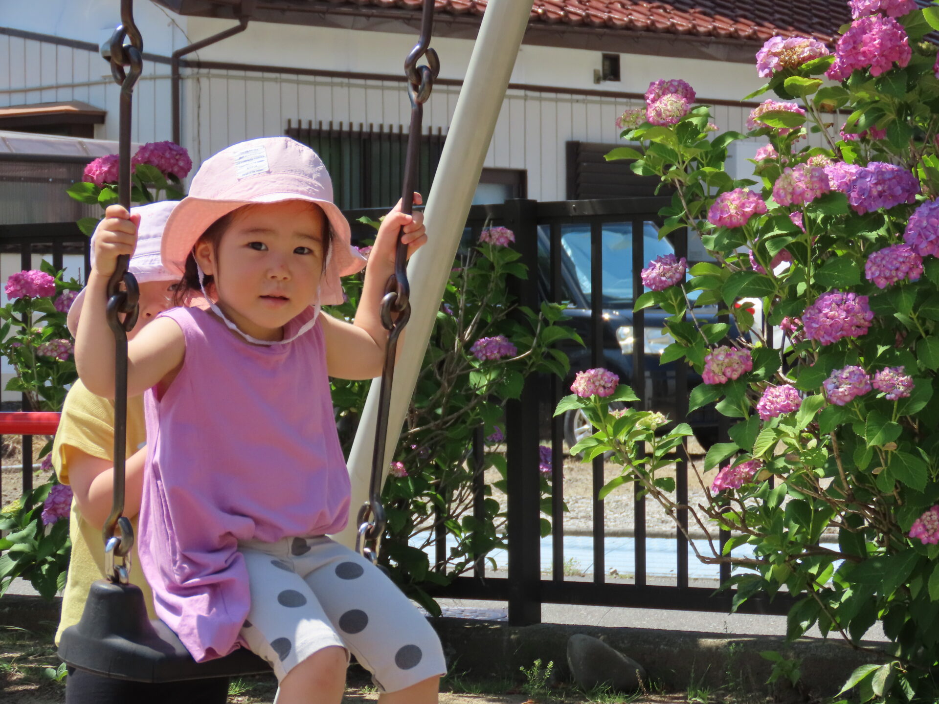 ブランコでは、お友だちに押してもらって乗ります。