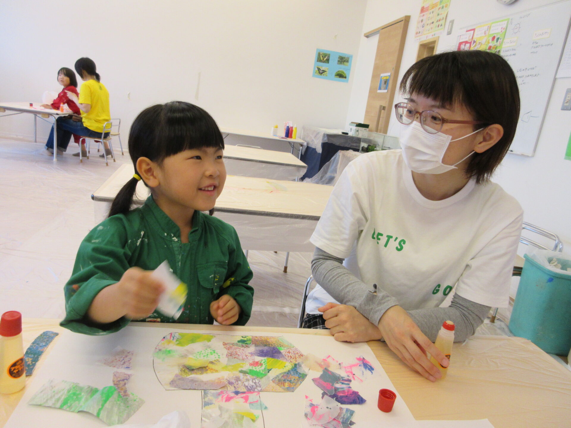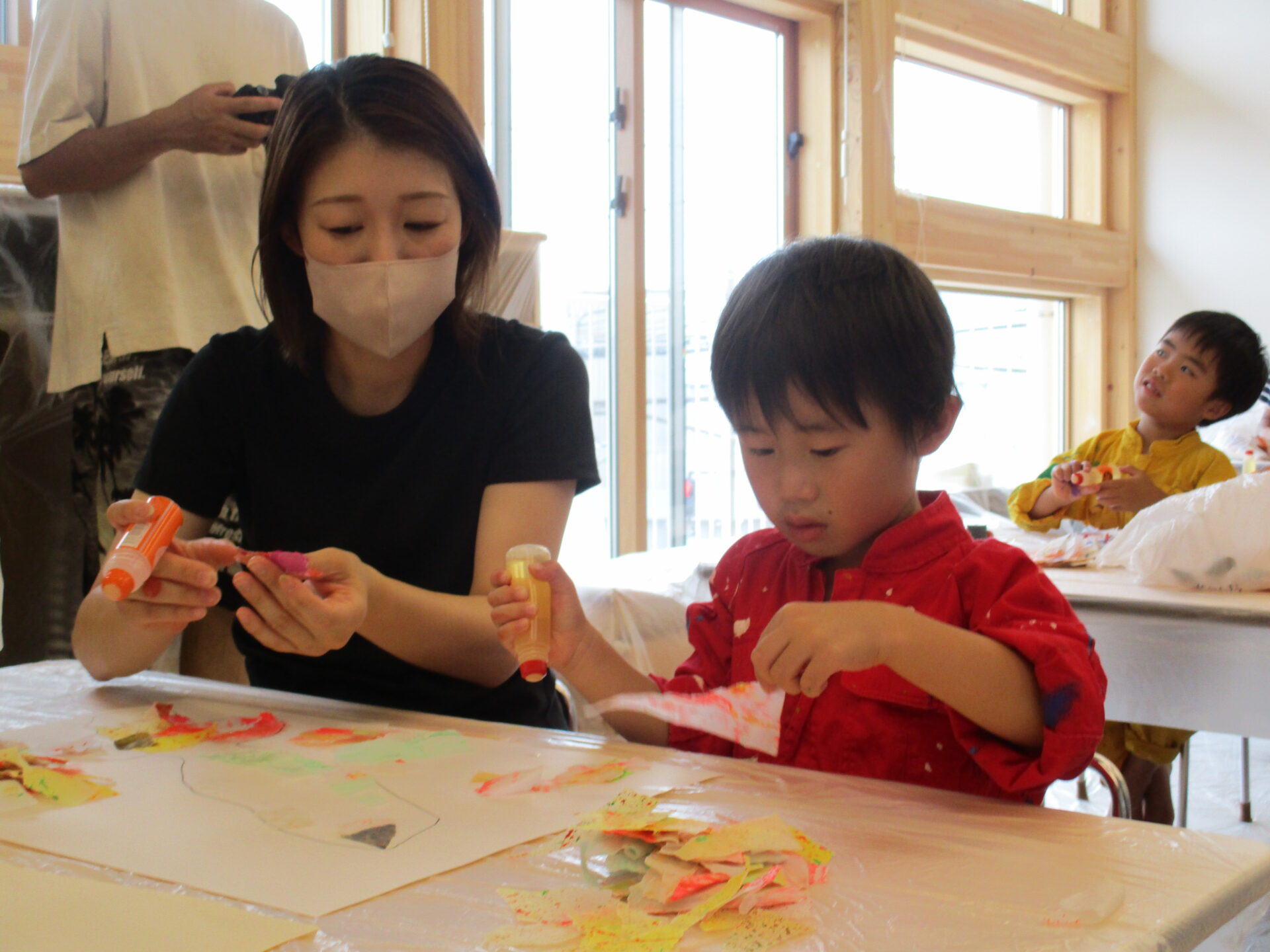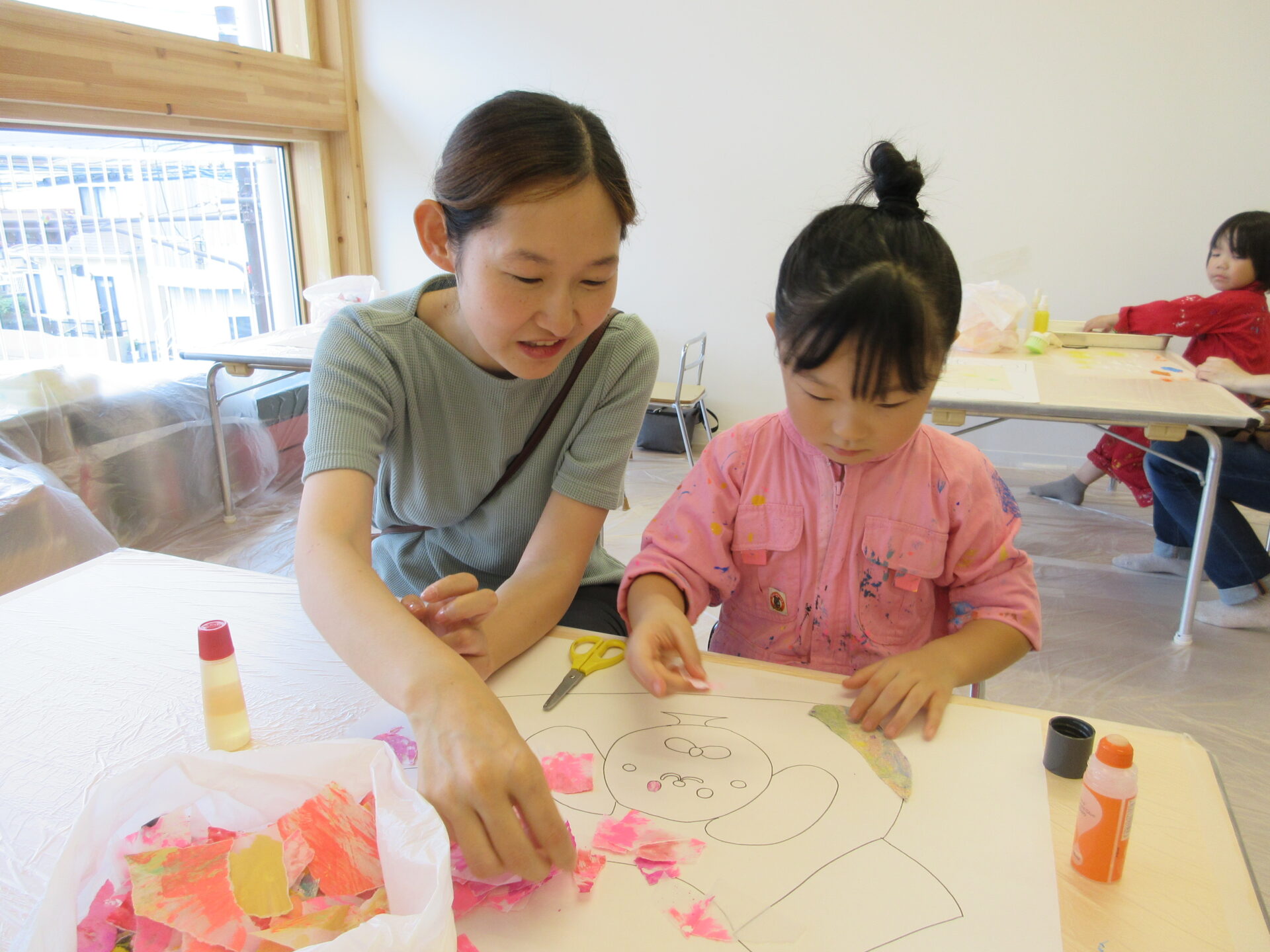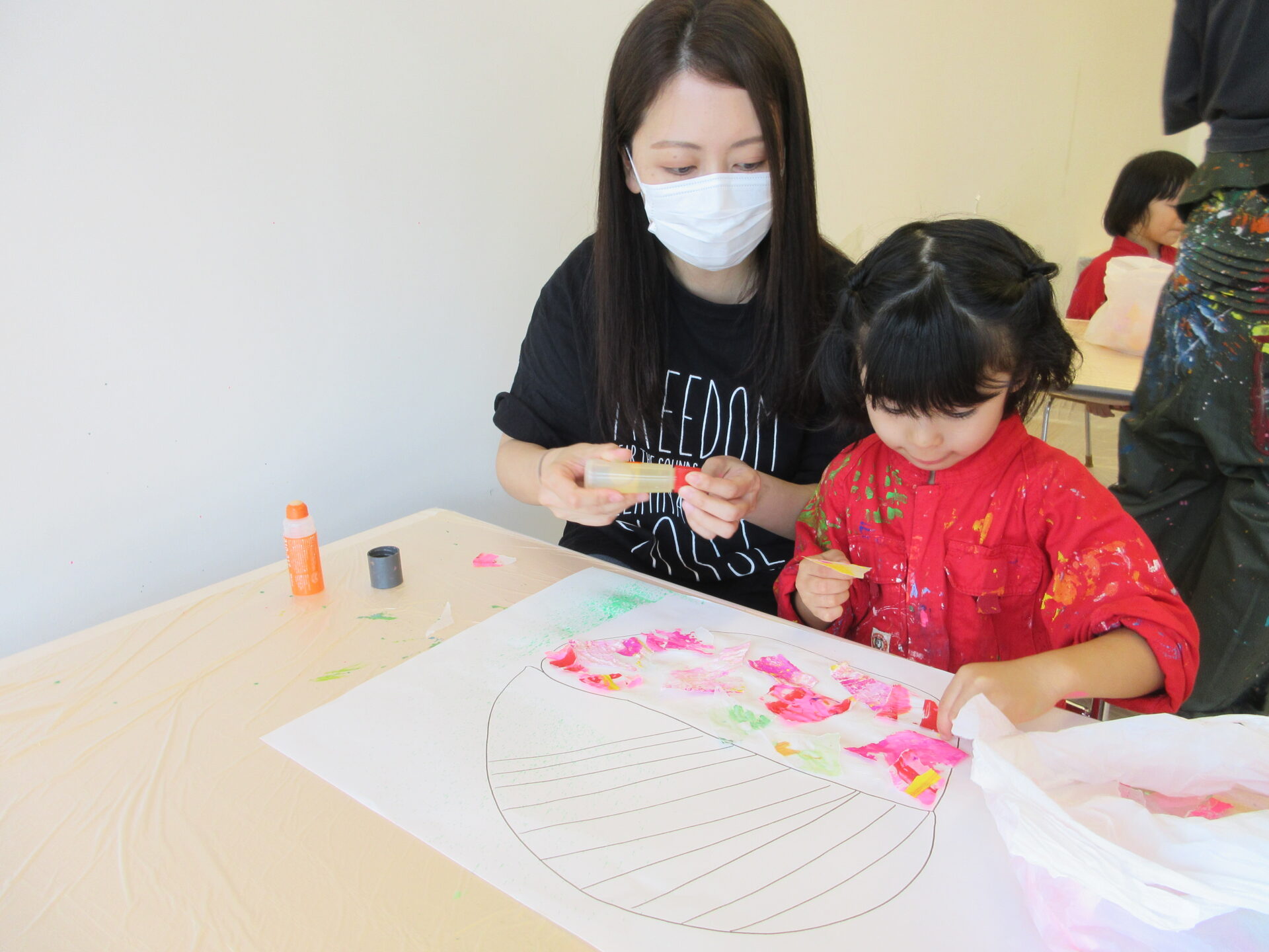アートイベント第1部は、こどもたちが事前に作っていたオリジナルシートを使ってちぎり貼りの活動を親子で行いました。