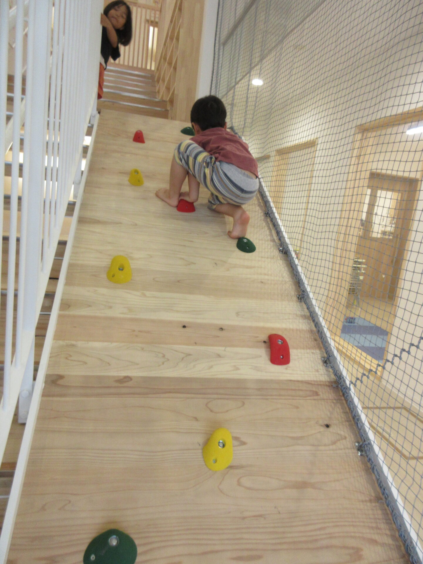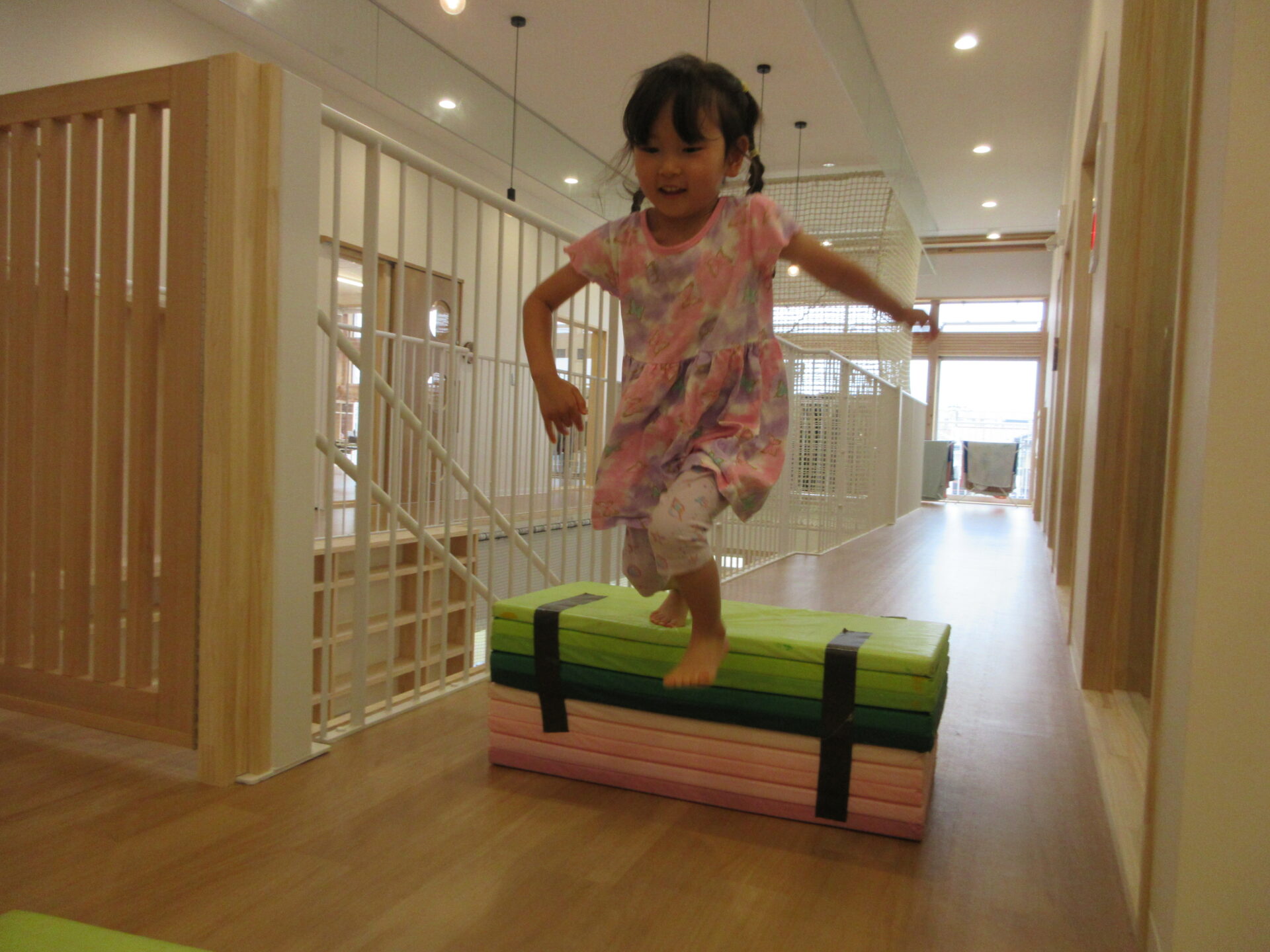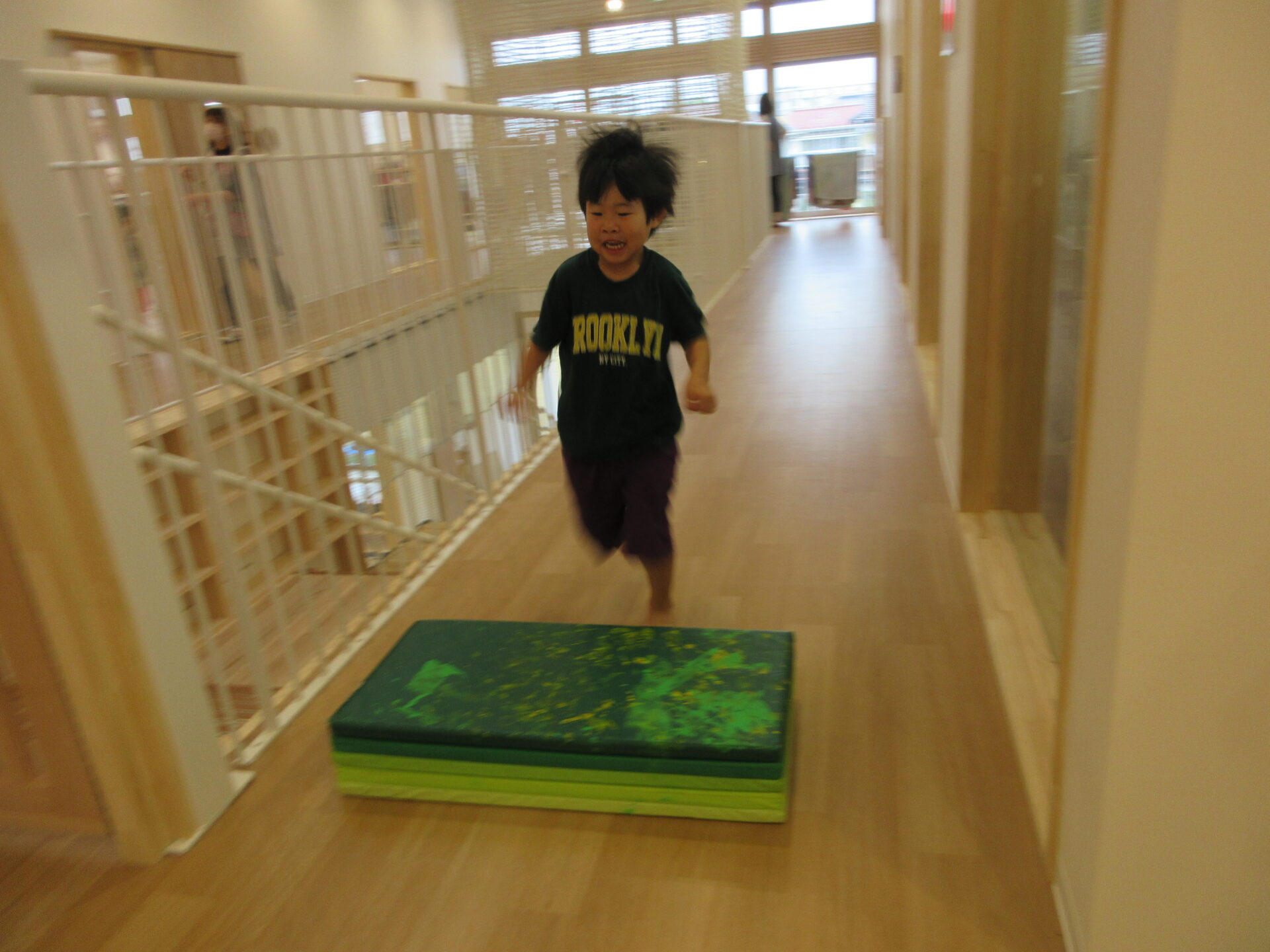 2階の廊下はぐるぐる走ることが楽しいスペースのため、チャレンジポイントを設定することで、より運動遊びを楽しめるようにしています。