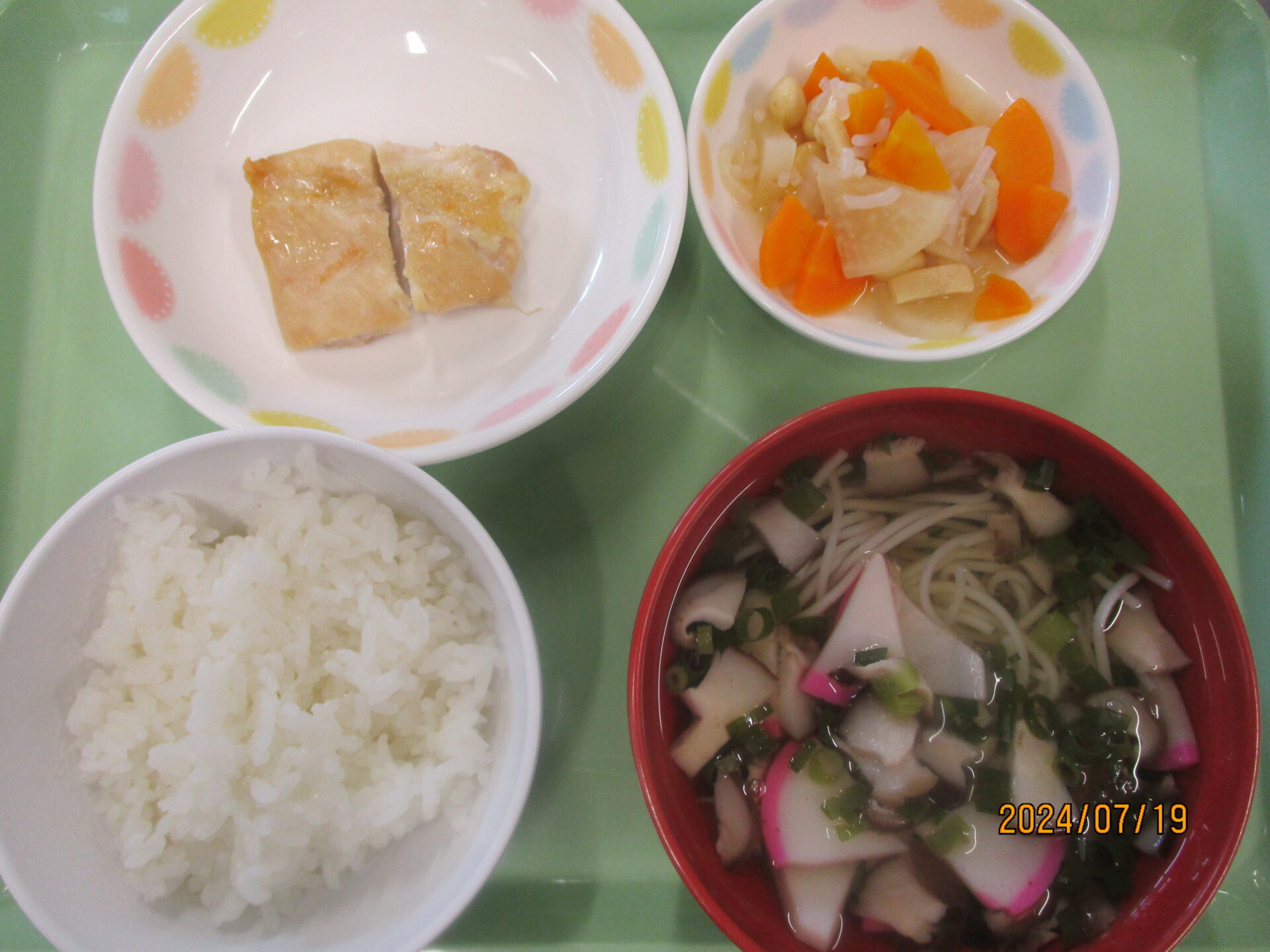 7月の郷土料理のテーマは「徳島県」です。献立は「鶏もも塩焼き・おでんぶ・ふしめん汁」です。