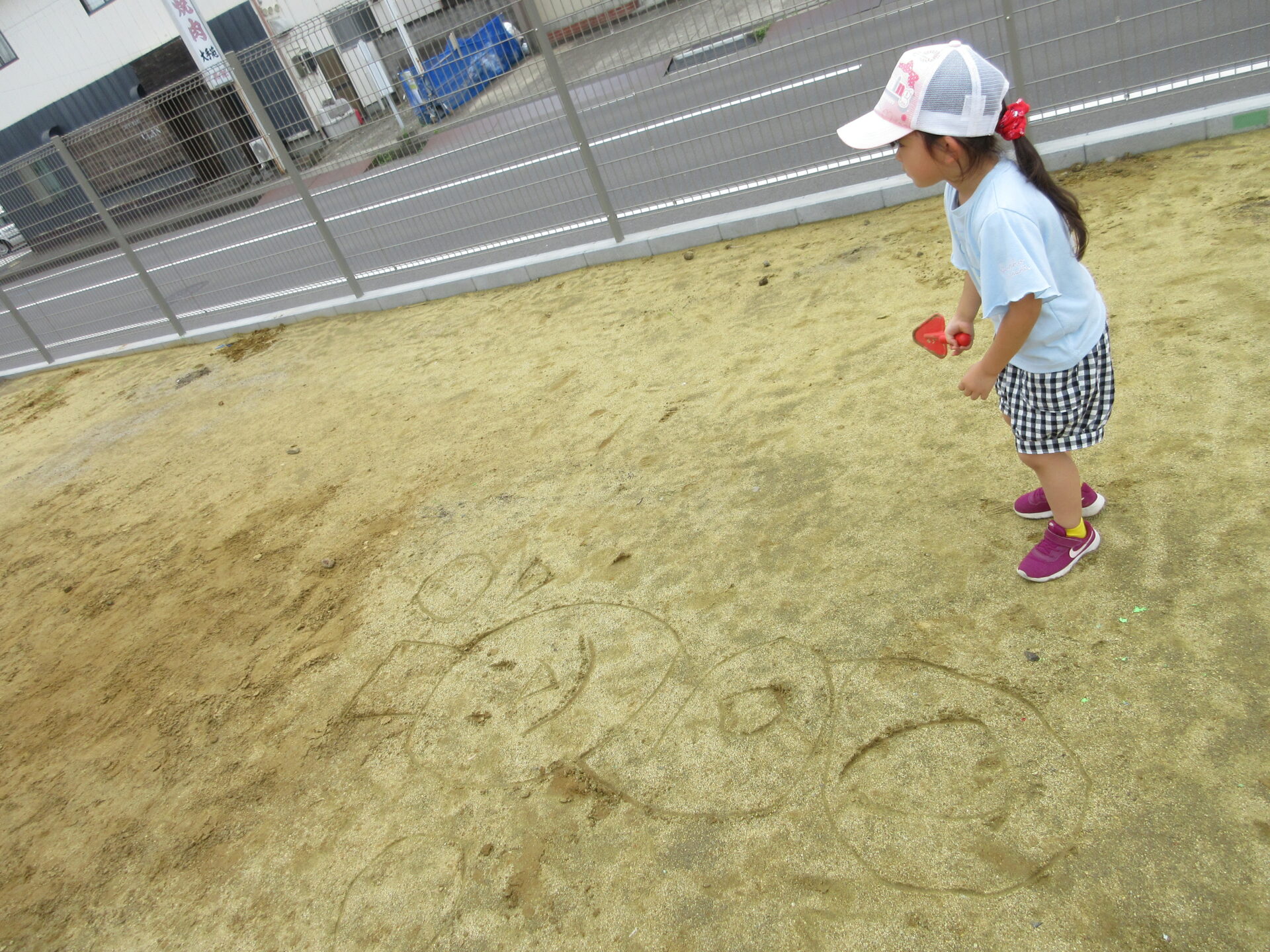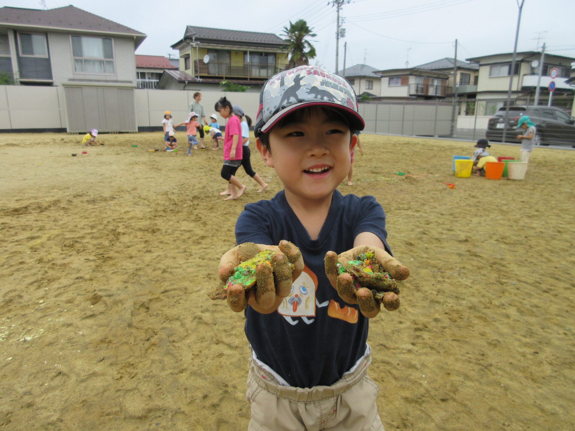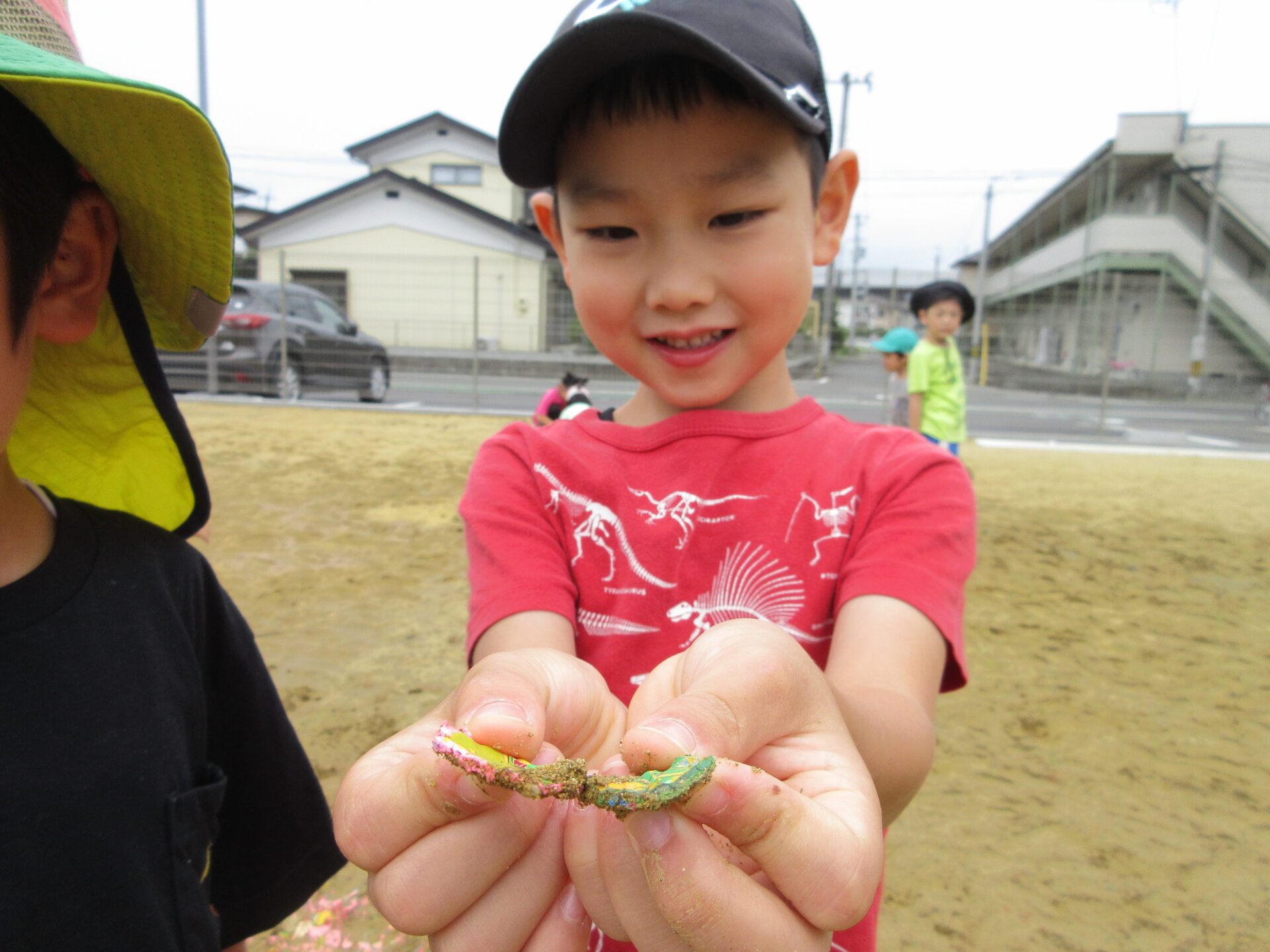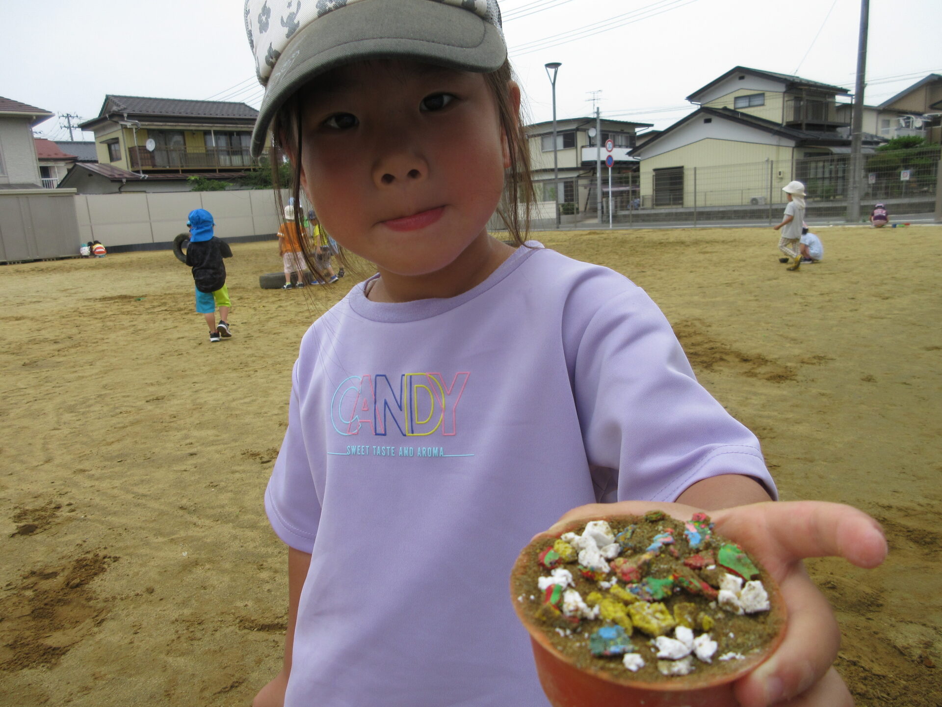 7/6(土)に行った5歳児親子での手倉田アートイベントのあと、園庭にきれいなラインが出現しました。見つけたこどもたちは一目散にカラフルな地面にかけより、絵の具のかけらを手にしていました。
