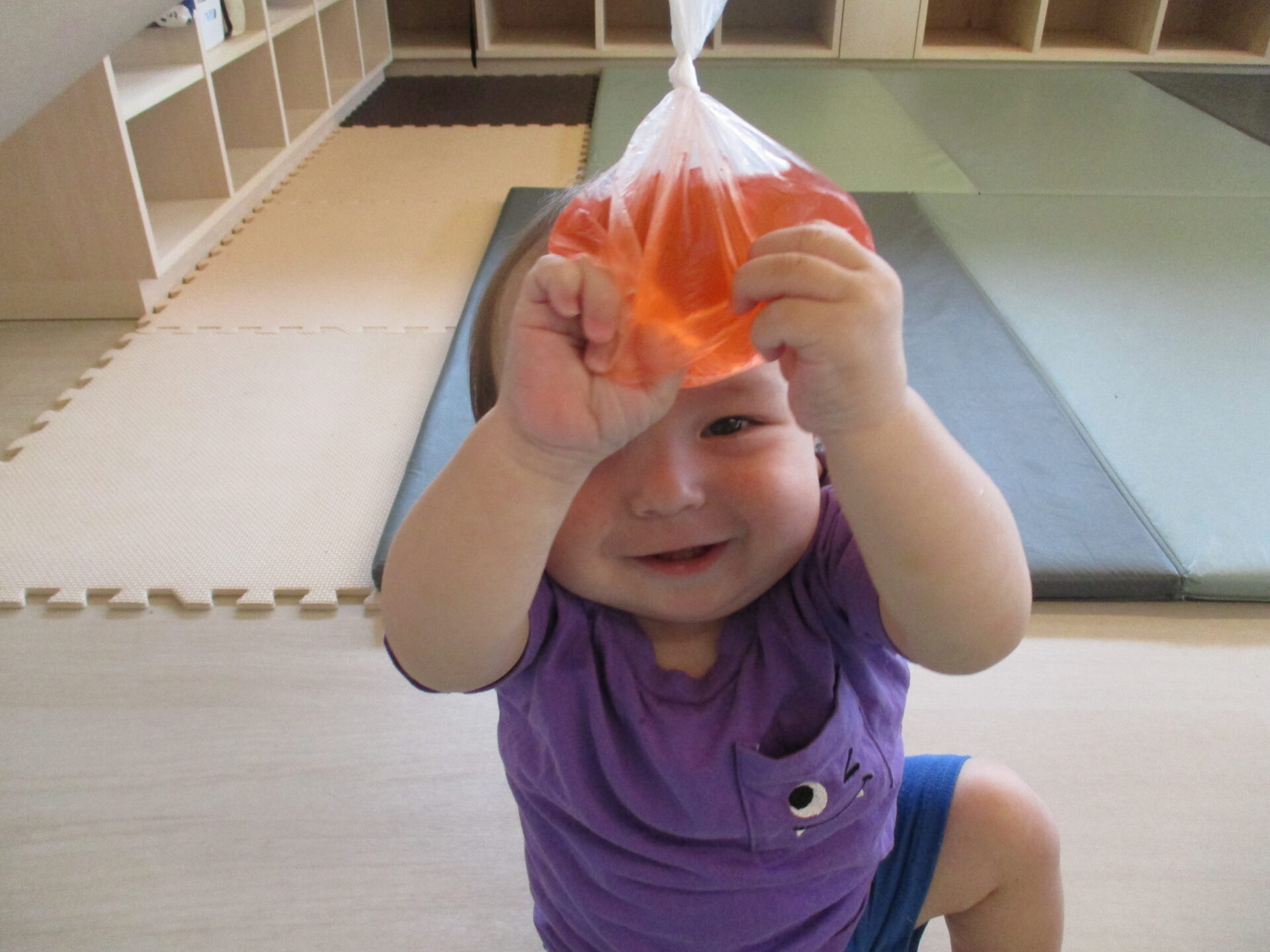 記録的な暑さが続き、戸外での活動の時間が限られてしまいますが、室内で涼みながら感触遊びを楽しんでいます。色水が入ったビニール袋を手にすると両手で握ってぷにぷにしたり、頬ずりしたりなど、思い思いに感触を楽しんでいます。