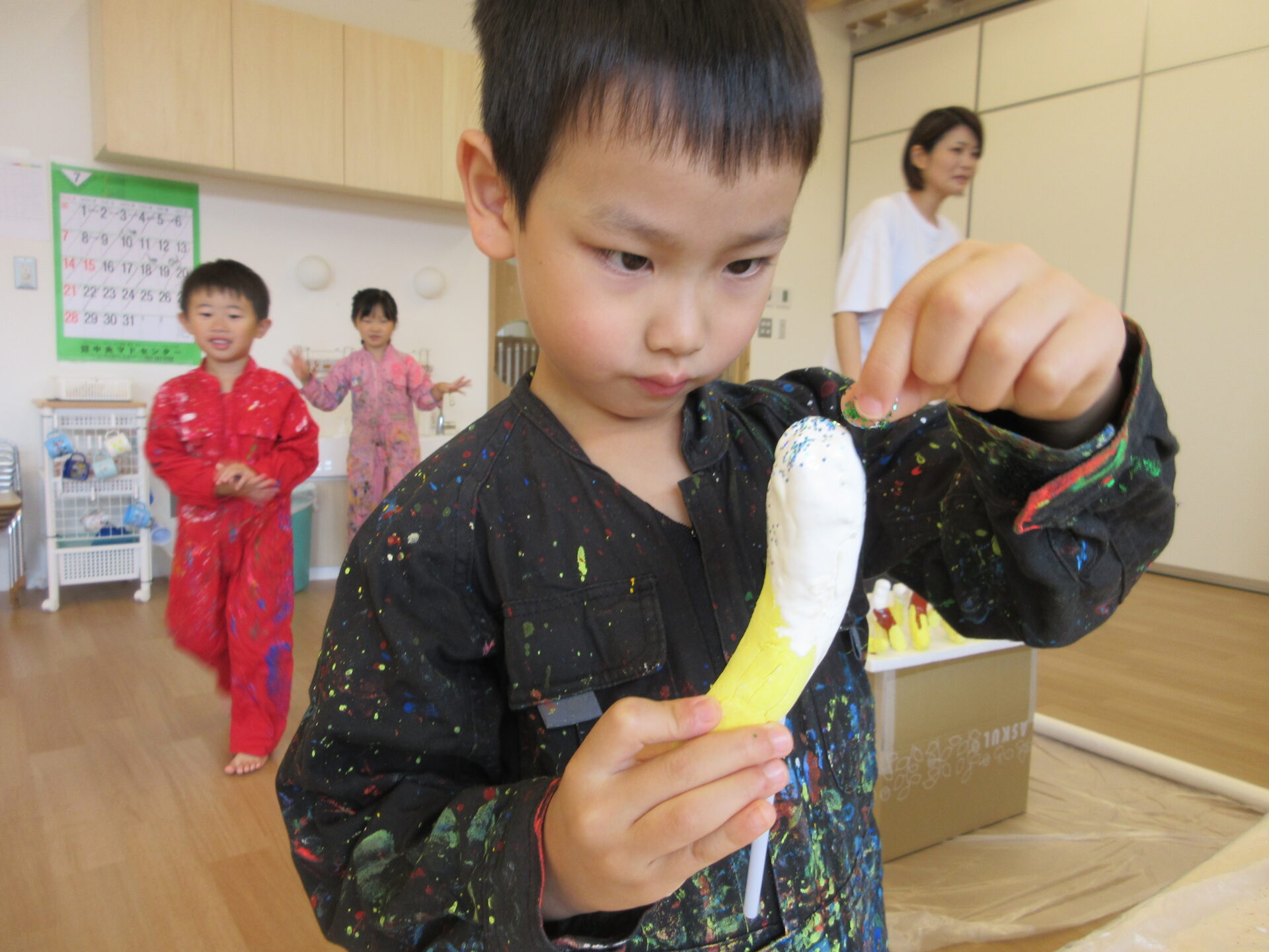 くじら組(5歳児)のこどもたちは、あることを計画しています。その準備のために、みんなでつくるもの、つくる数、つくる方法と話し合いを重ね、1品ずつ作ることに夢中になっています。