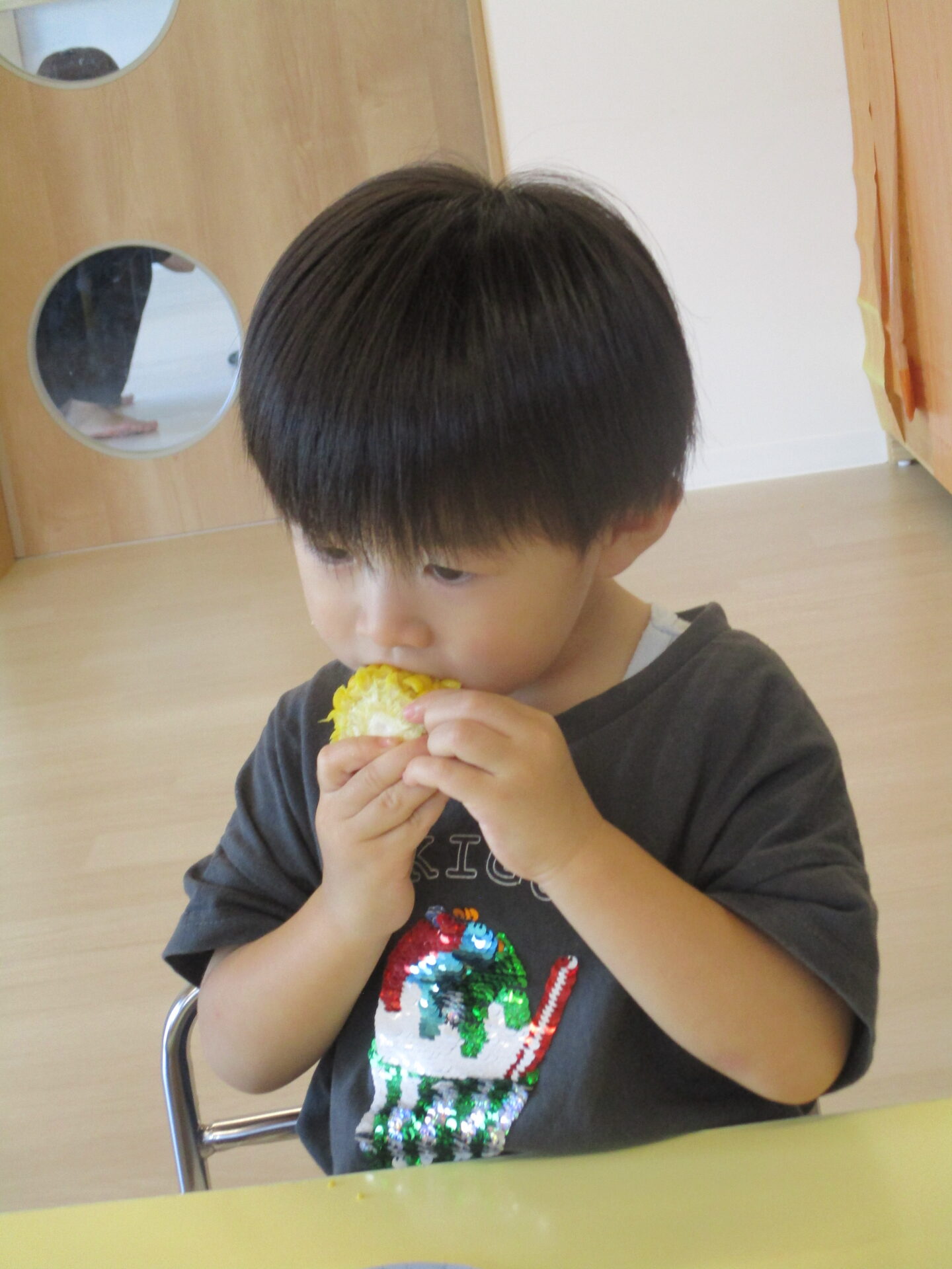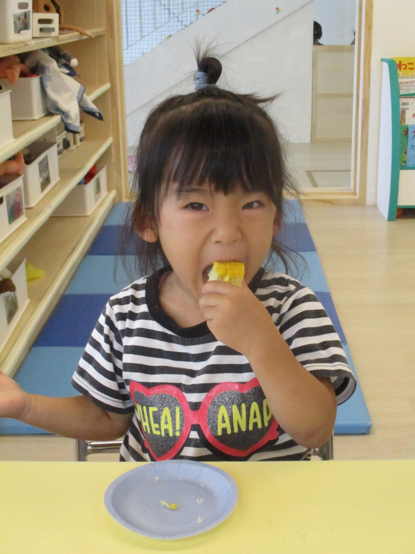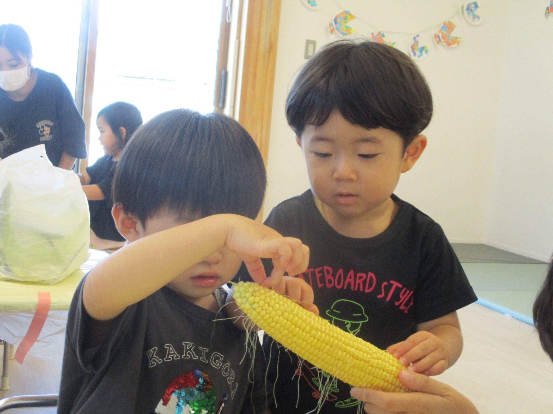 普段はコーンが苦手なお友だちも、みんなで剥いたとうもろこしを自分から一口食べる様子が見られていました。