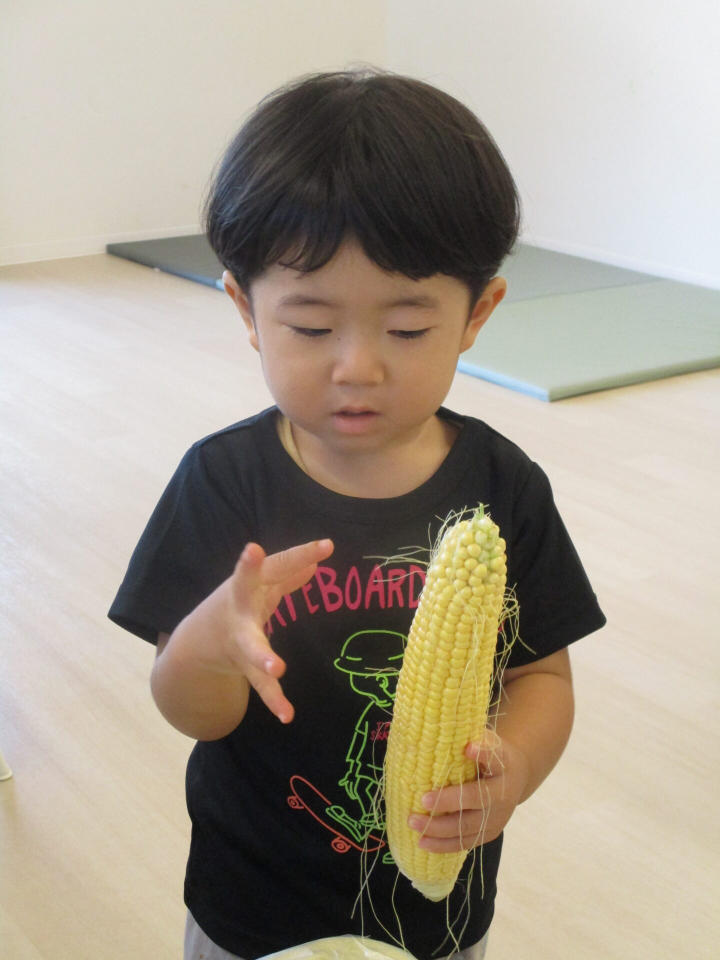 あめ組(2歳児)のこどもたちが大好きな絵本「とうもろこしくんがね・・・」を何度もみんなでみることを楽しんでいるうちに、「とうもろこし、みたい!」「さわってみたい!」と興味が高まってきました。給食材料を納入していただいている業者さんにお願いし、皮付きのとうもろこしを届けてもらいました。
