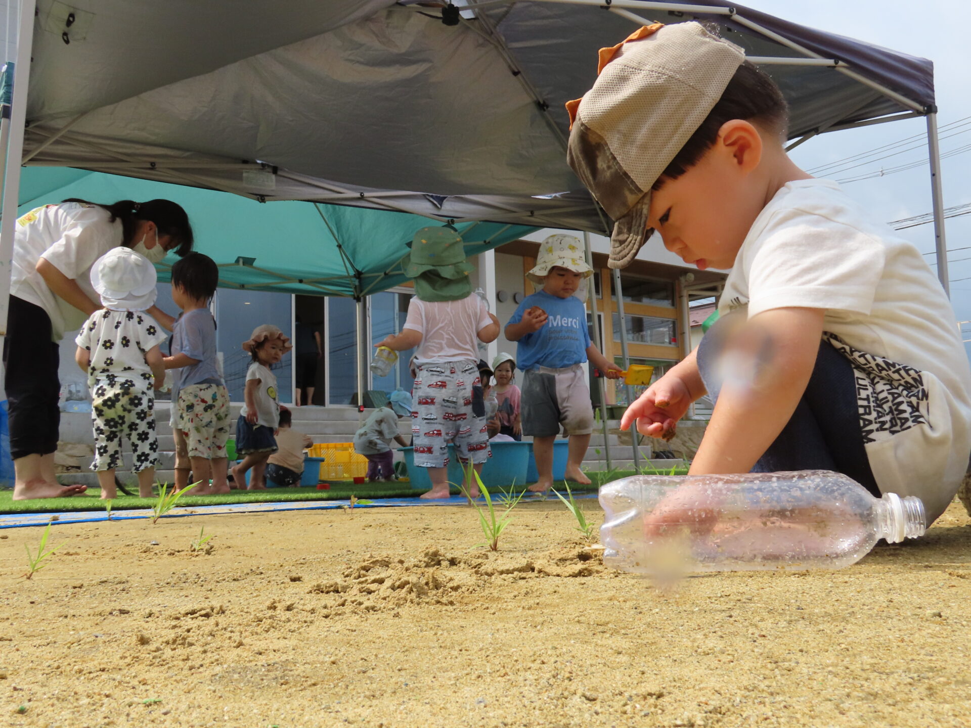 水遊びコーナーの周りでは、砂と泥の感触も楽しんでいます。こどもたちのペースで夏ならではの遊びを安全に楽しんでいきたいと思います。