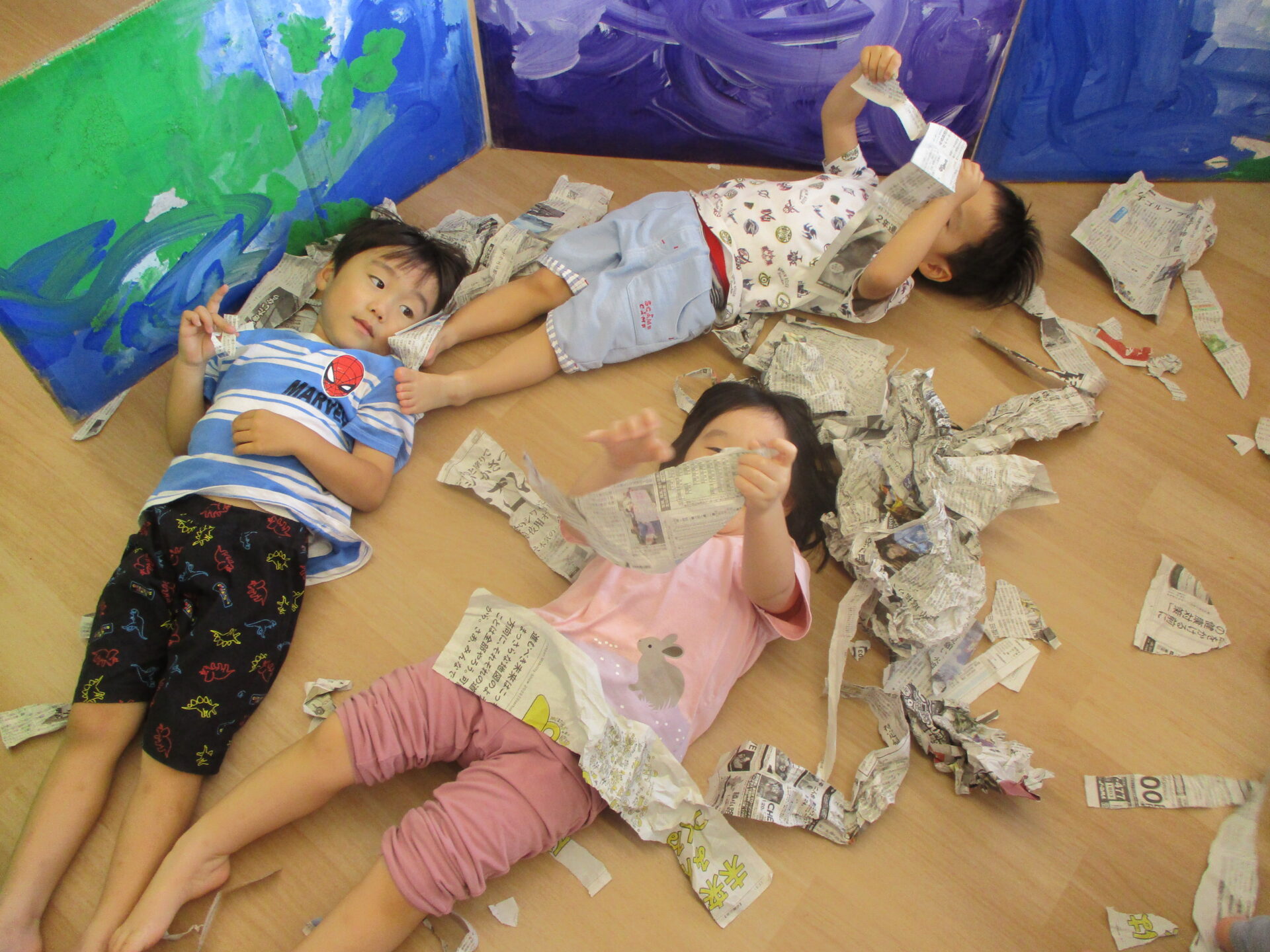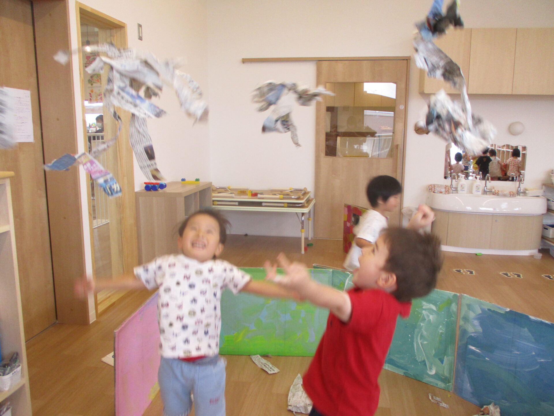 作って遊ぶ以外にもビリビリ破いた新聞紙を空中に投げて大はしゃぎでした。