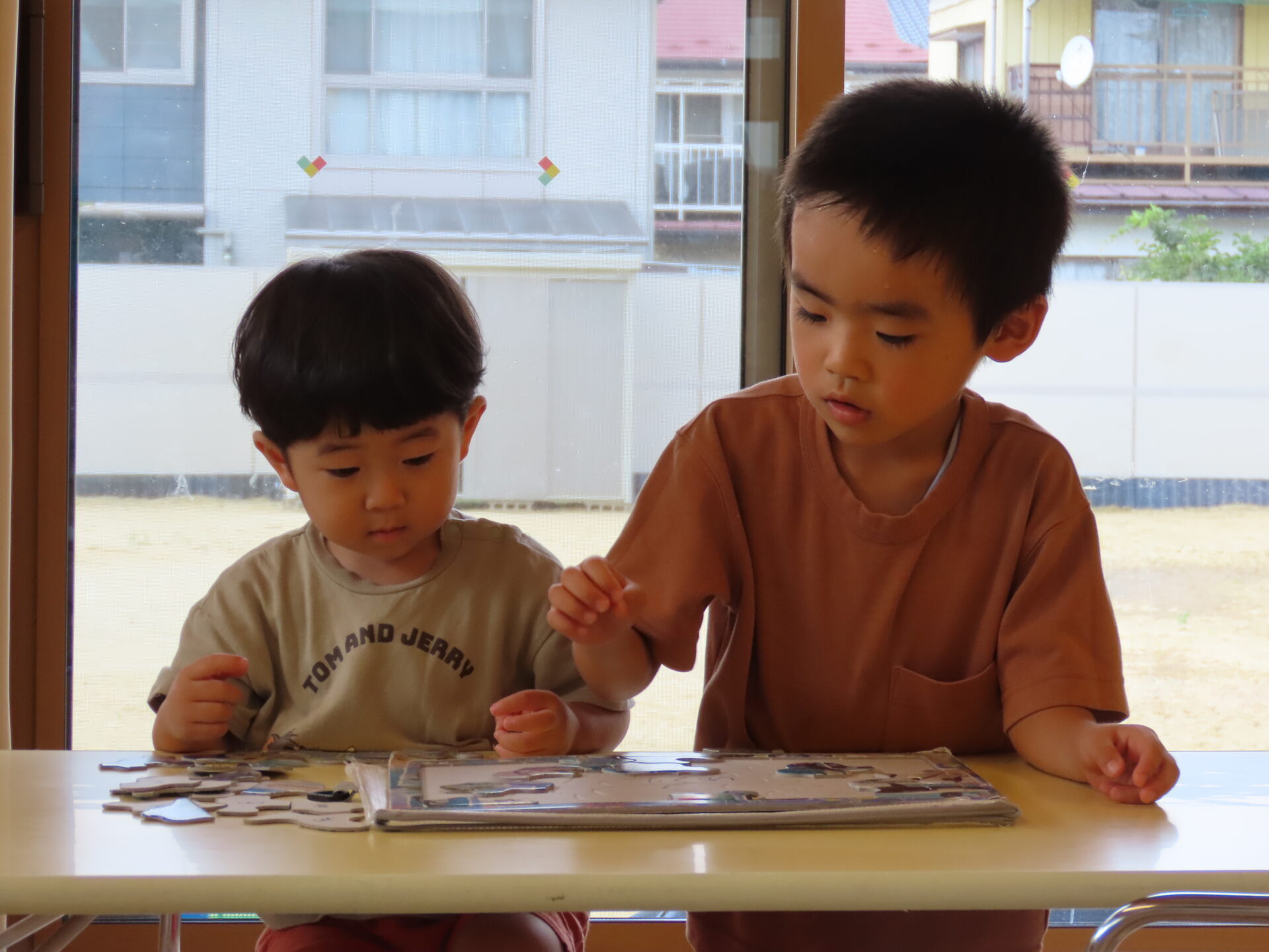 5歳児のAくんが、2歳児のBくんにピースの置き場所を知らせ、Bくんが自分でできるようにサポートしていました。