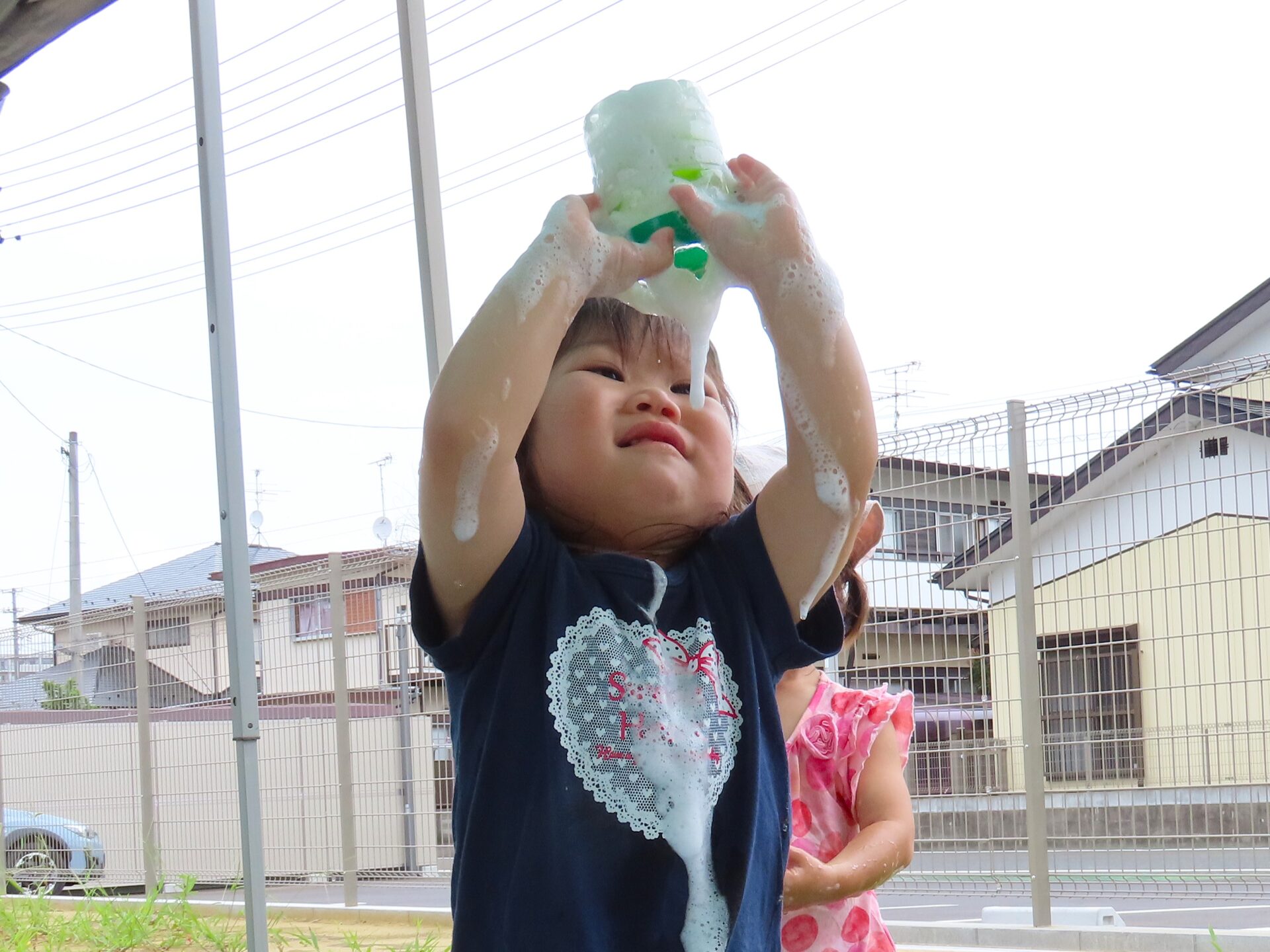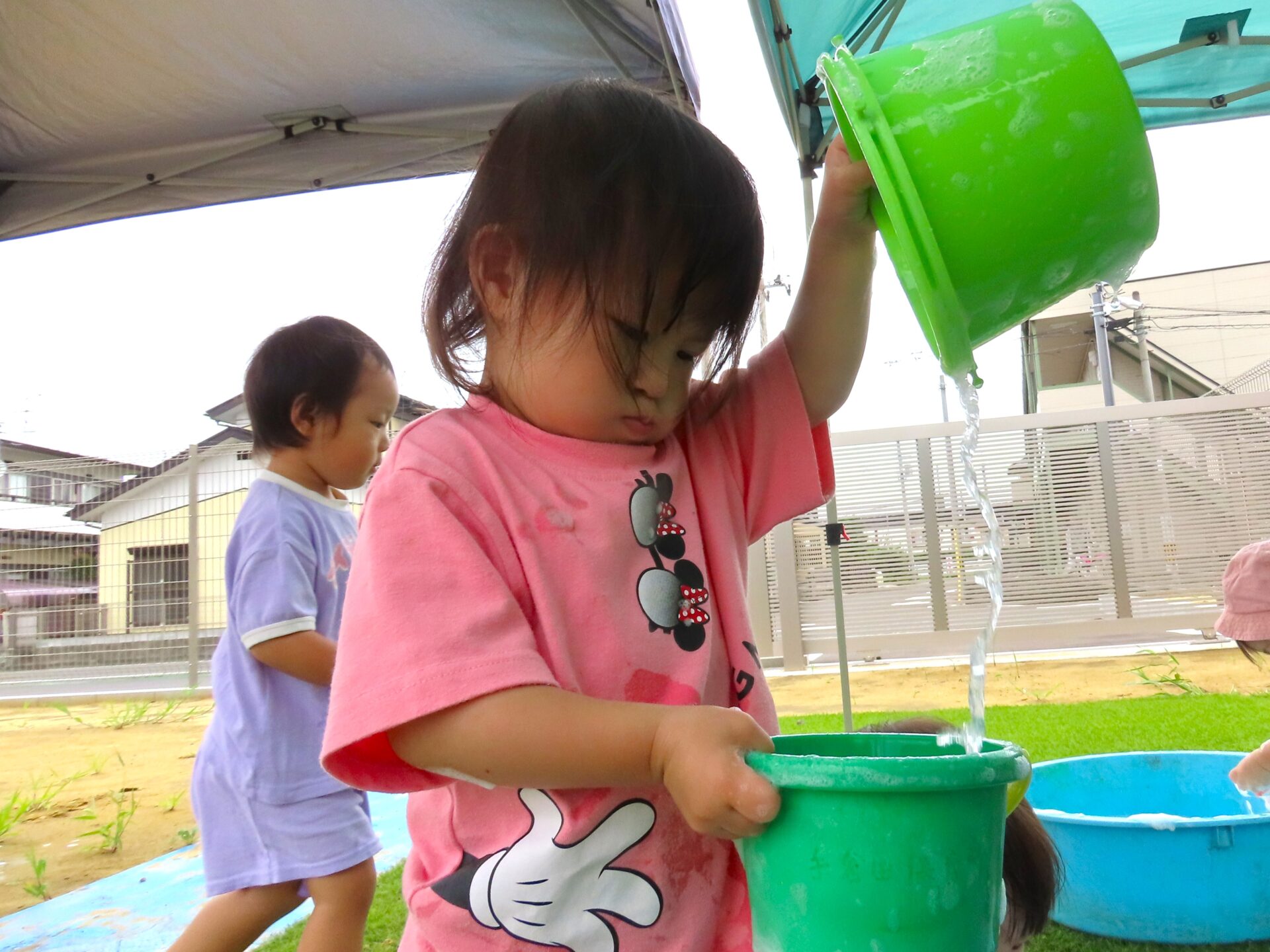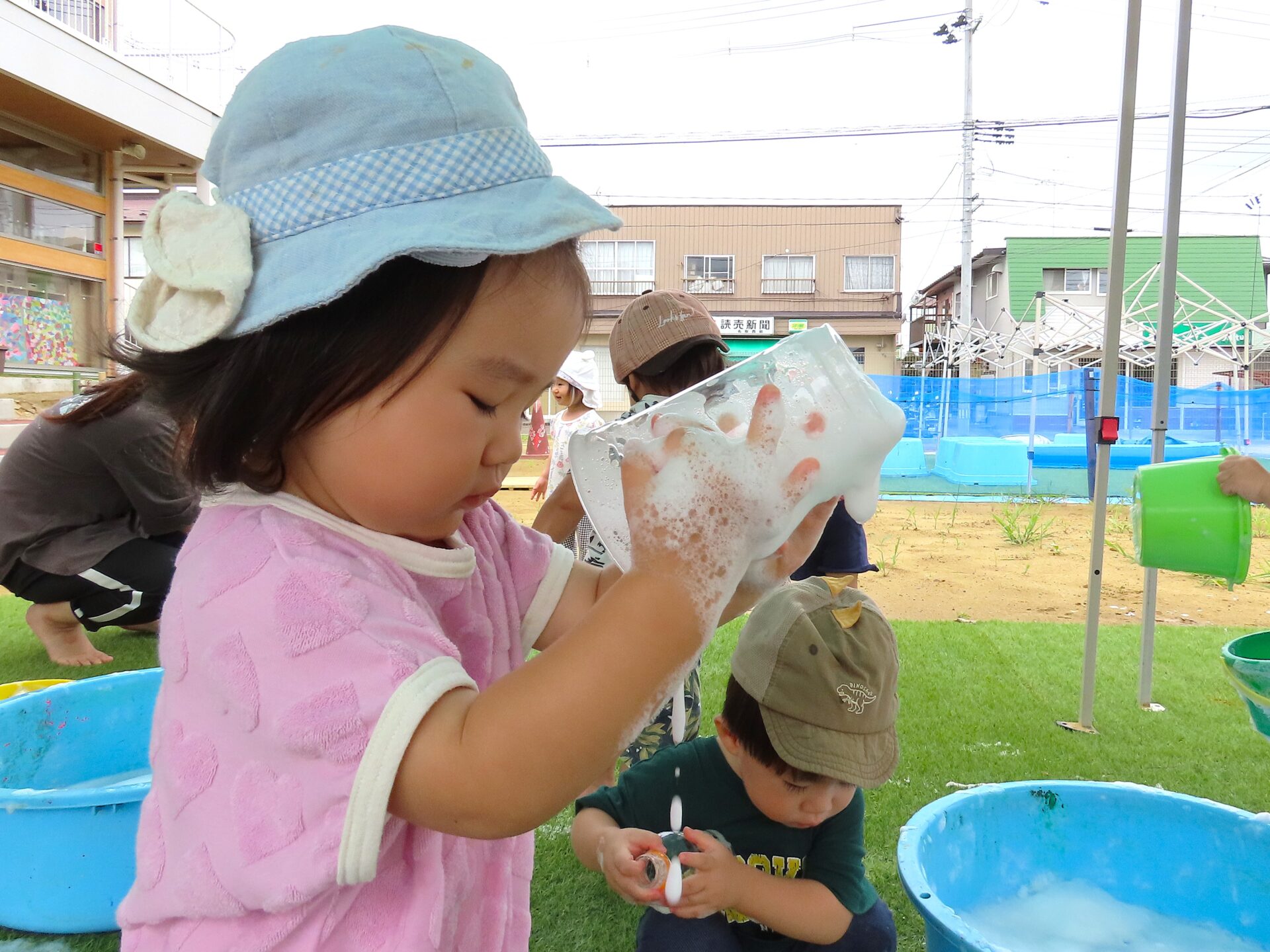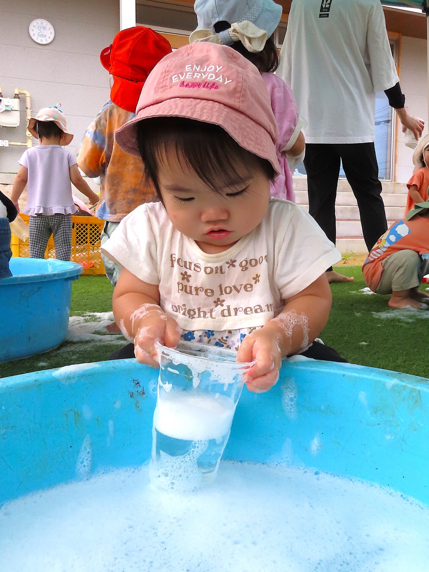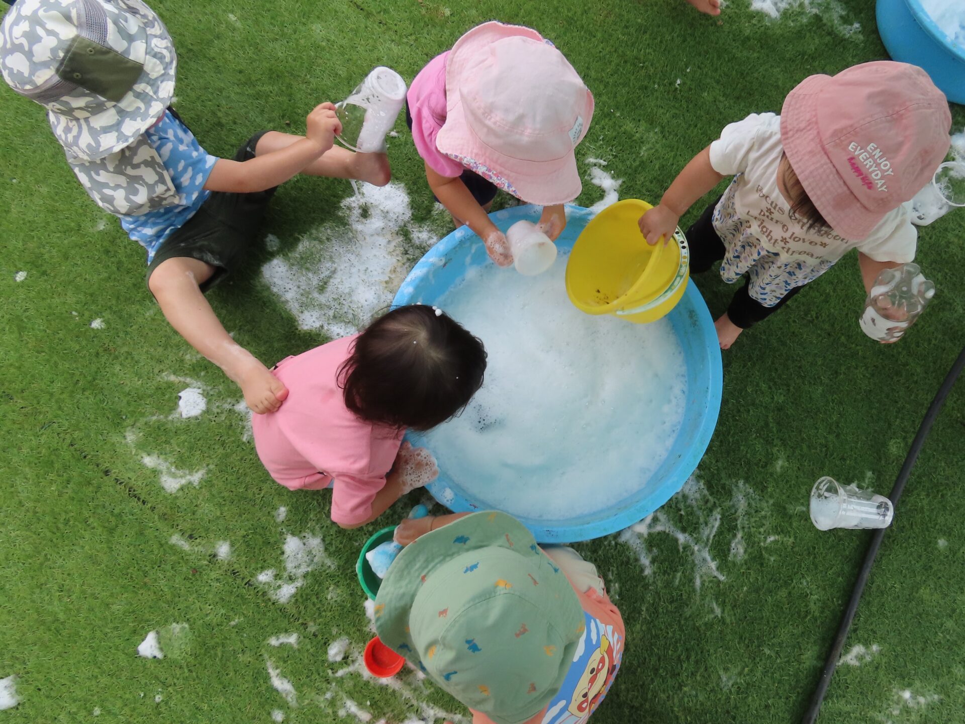高いところから水を入れたりなど、思い思いに水や泡に触れることを楽しんでいました。