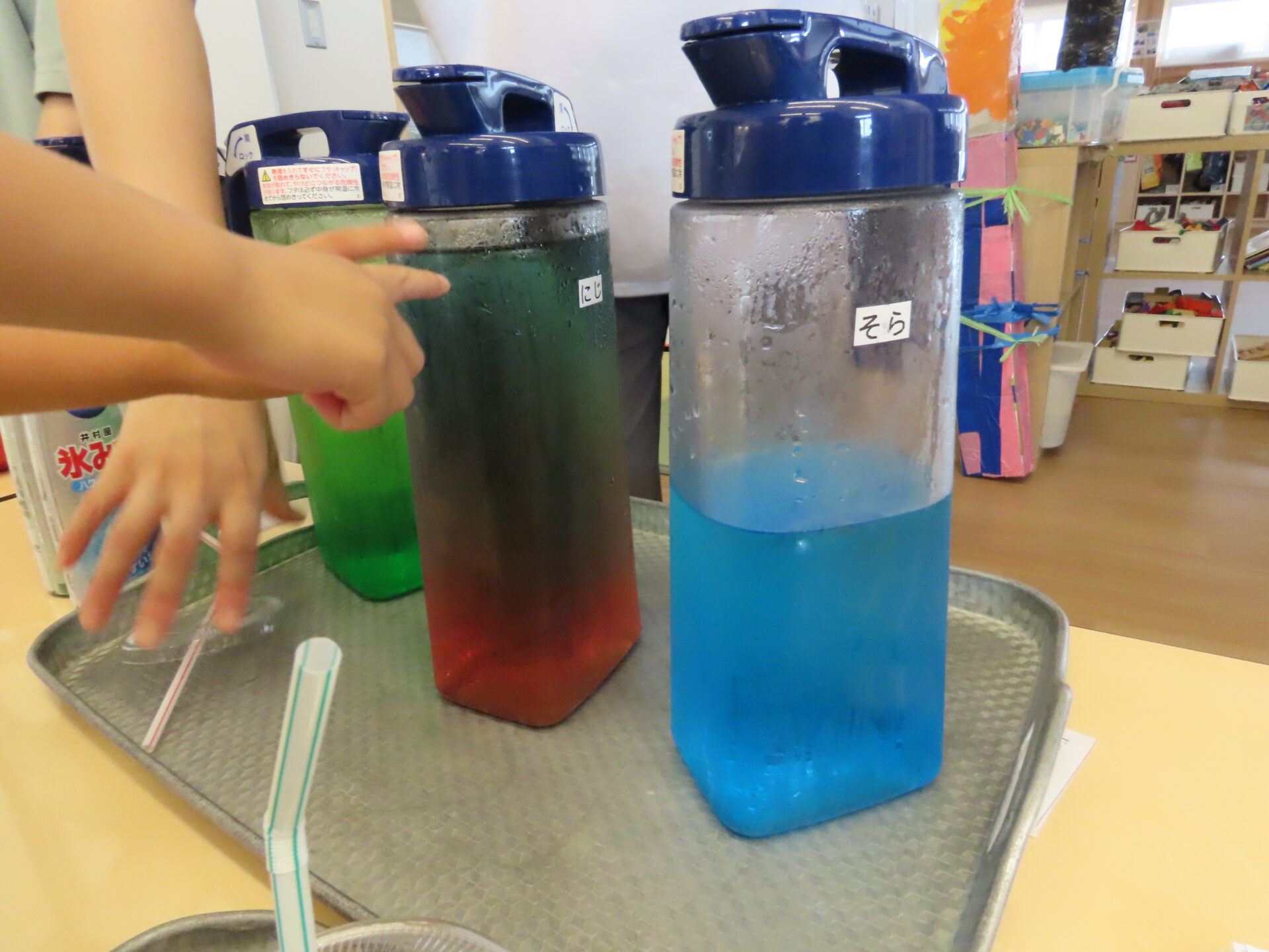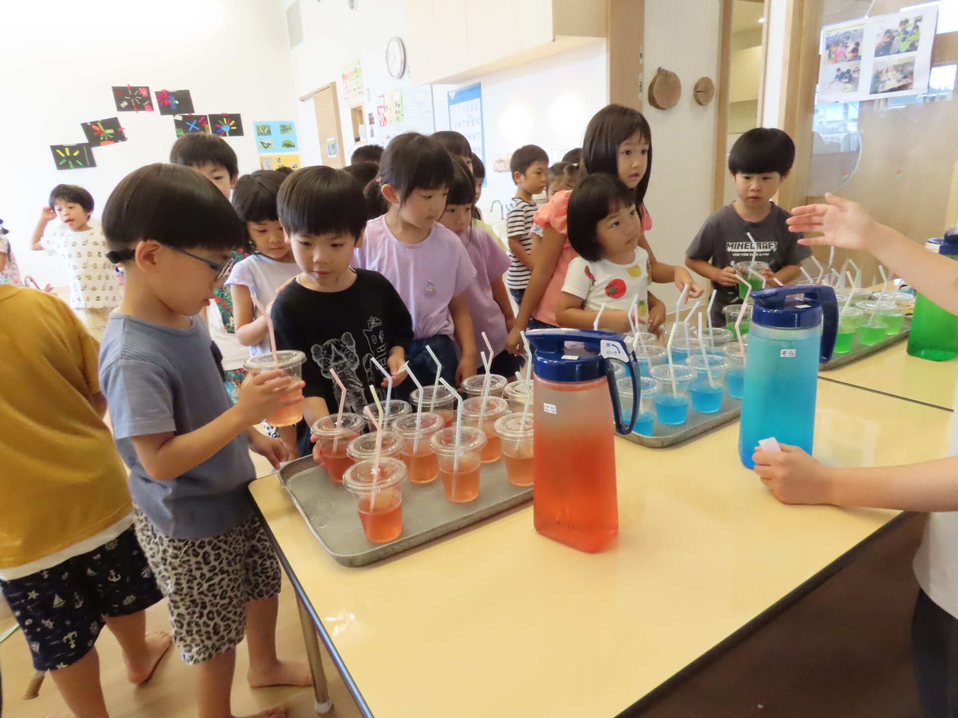 「くじらまつりお疲れ様!好きな色のジュースを選んでね」と園長先生がこどもたちに差し入れを持ってきました。