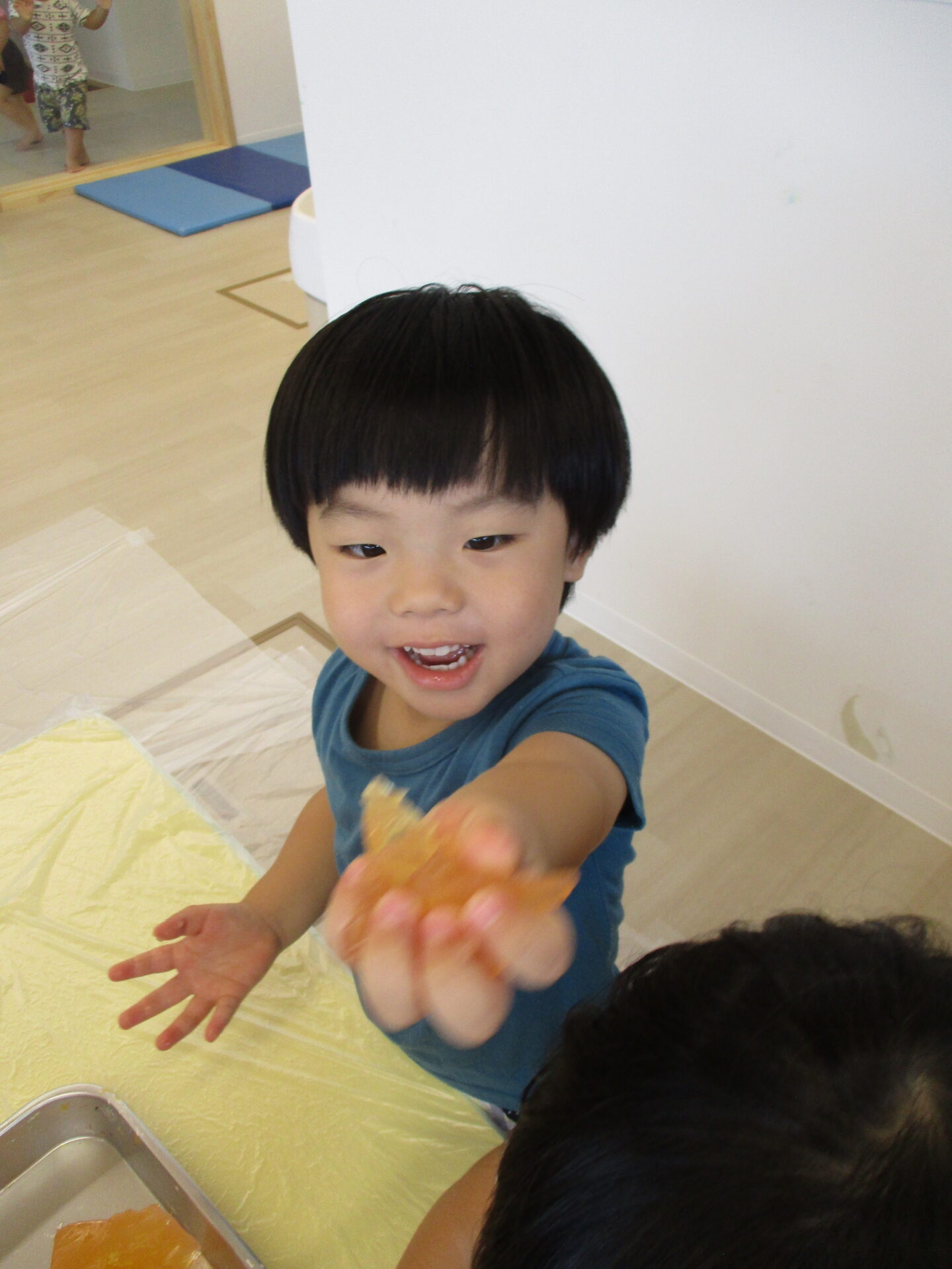 Aくんが寒天を両手で持ち上げようと夢中になっていました。つるつるした感触に苦戦し、なかなか持ち上げられず…。しばらく様子を見ていると・・・