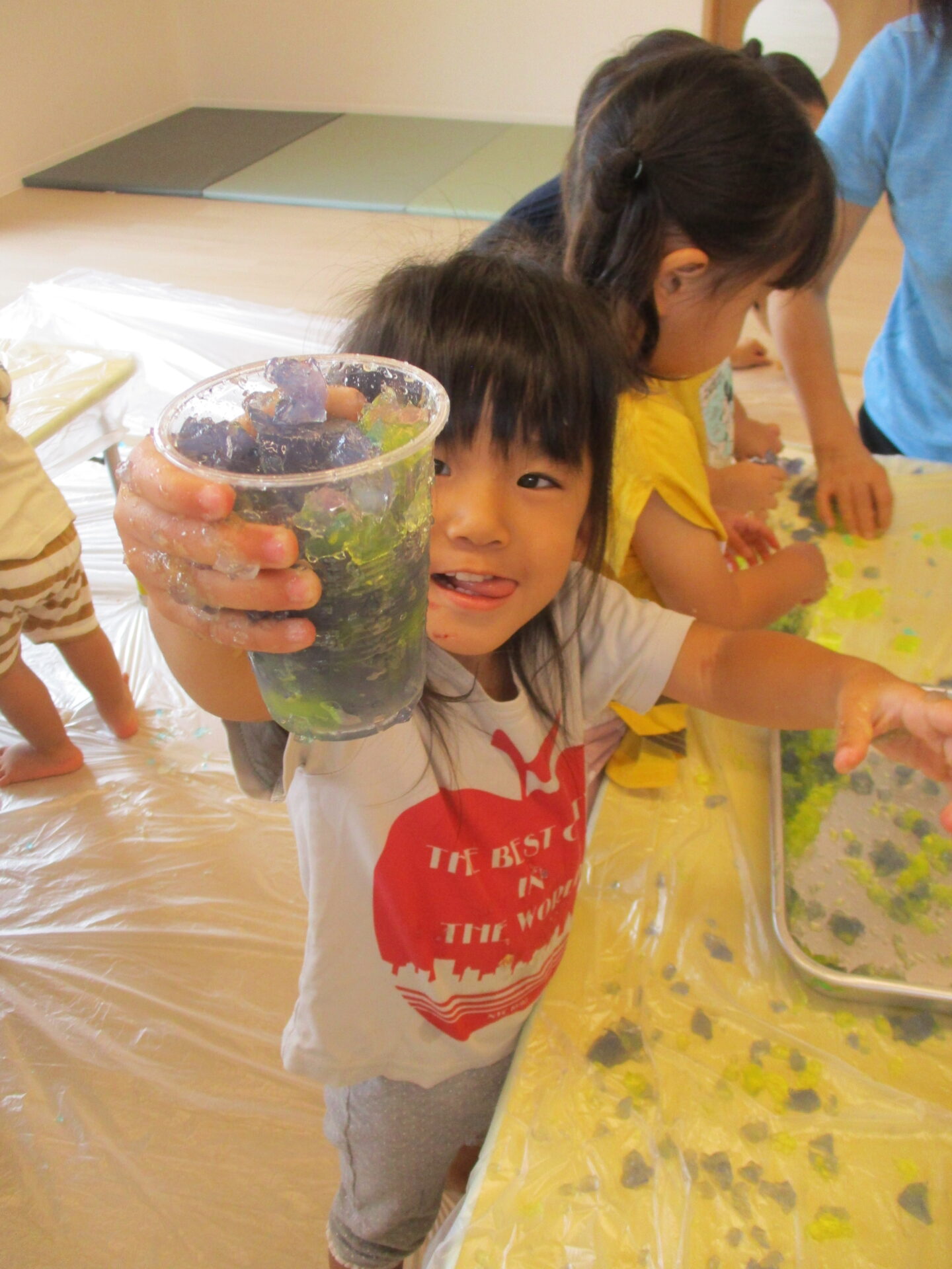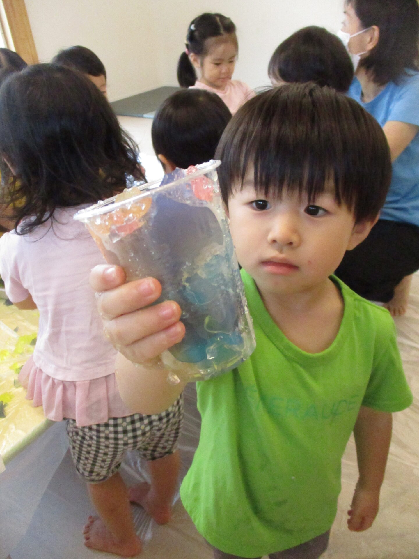 すると、潰した寒天をコップの中に入れ、「トロピカルジュース」と、ジュース作りに遊びを広げながら寒天遊びを楽しんでいました。