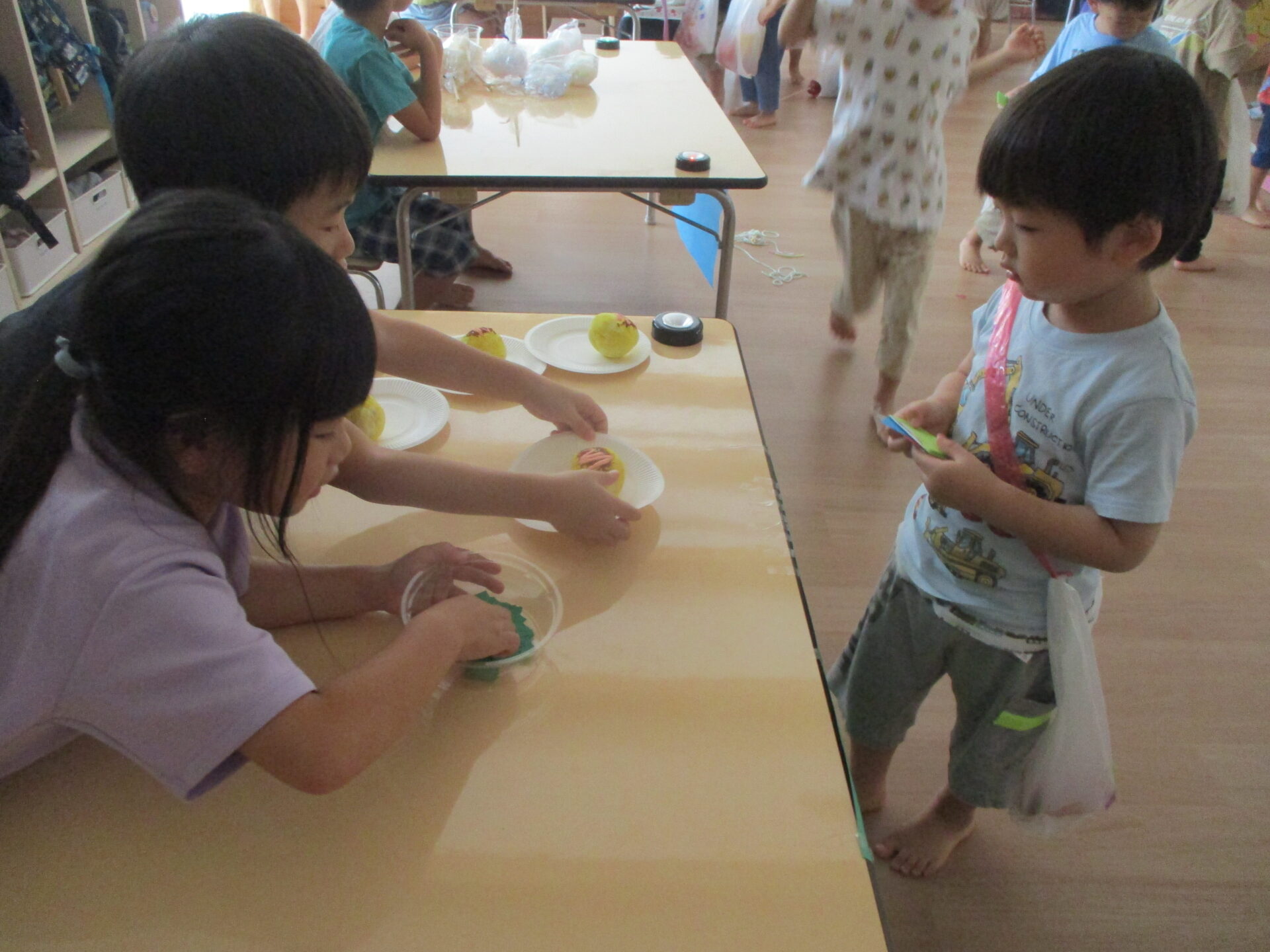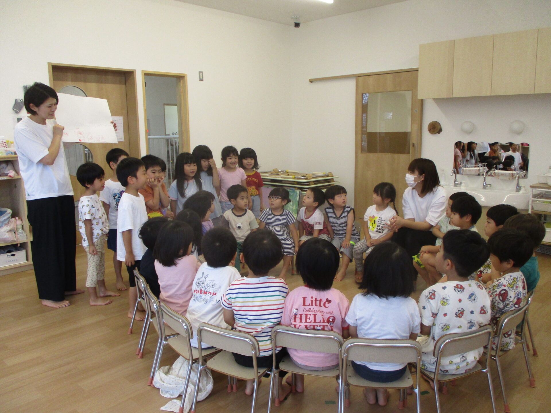 くじら組(5歳児)のこどもたちが、にじ組(3歳児)をくじらまつりに招待してくれました。