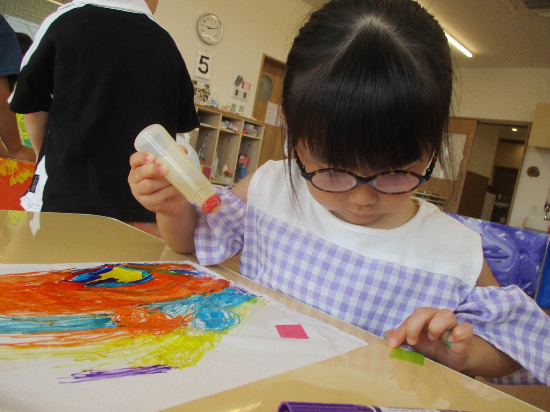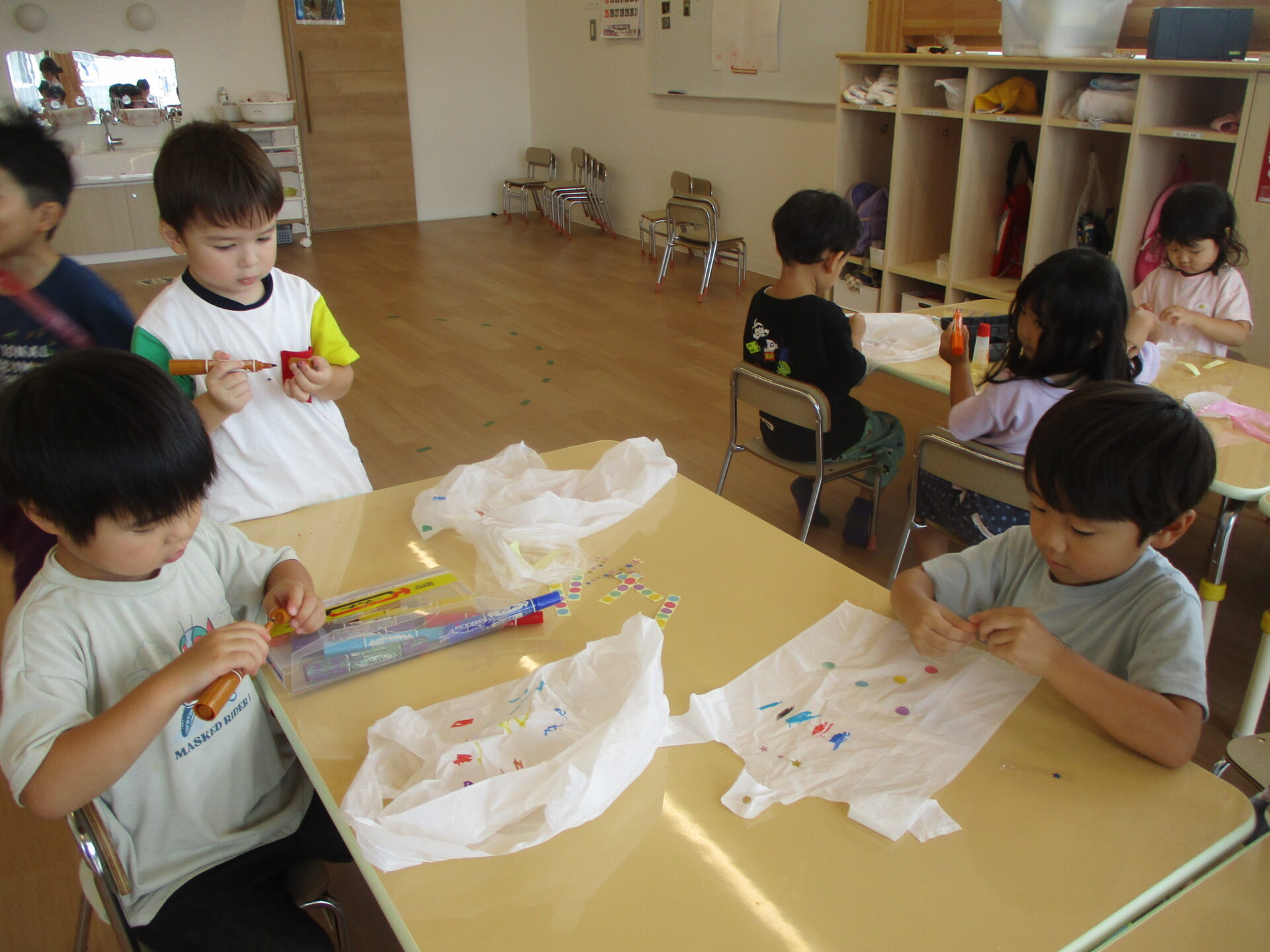 マジックで描いたり、シールを貼ったりして、オリジナルショップバッグを作りました。