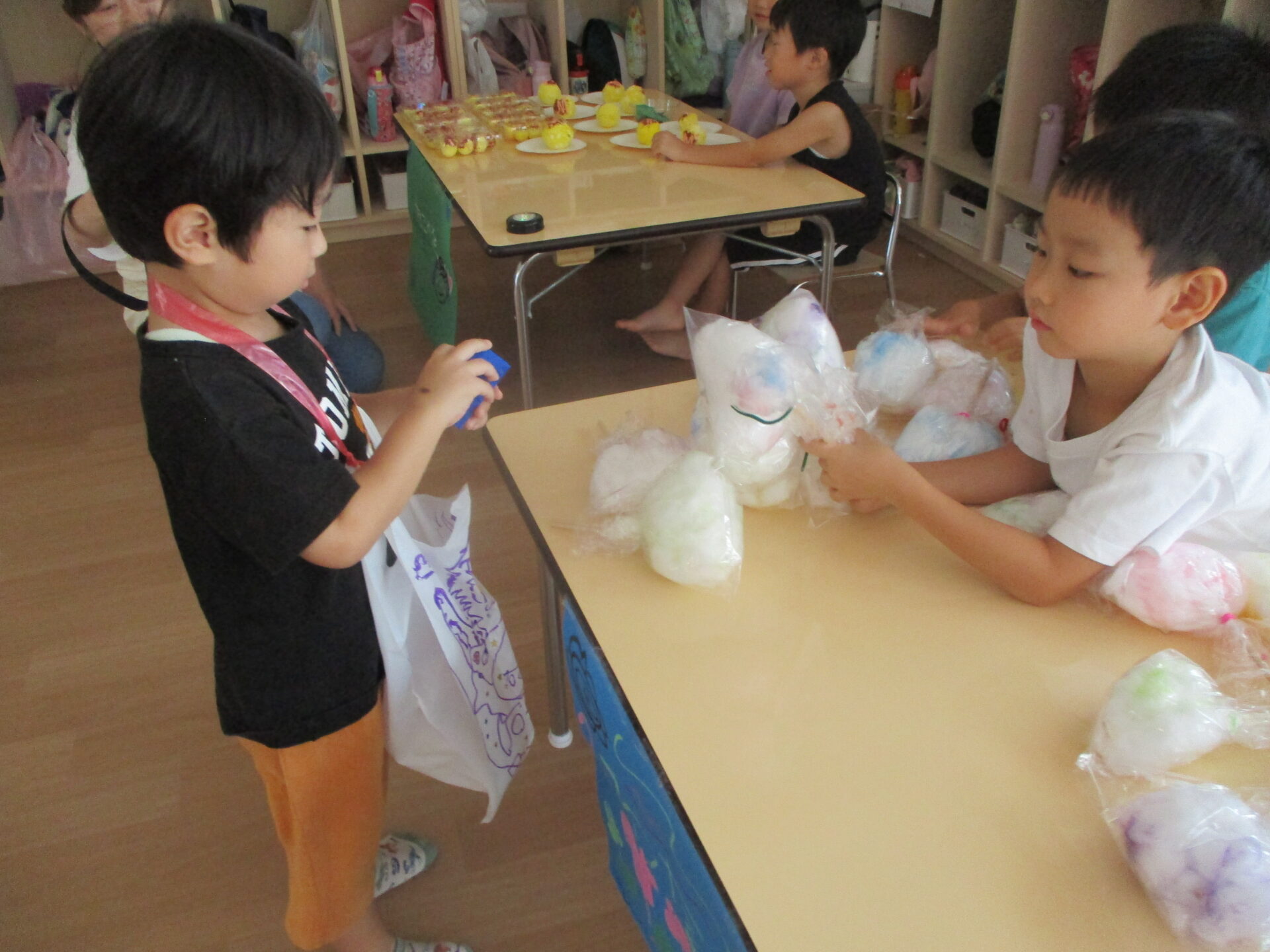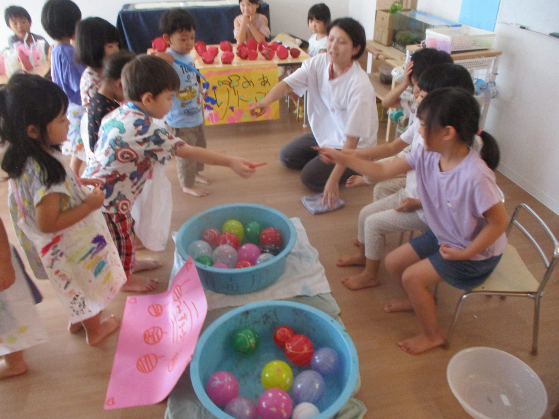 くじら組(5歳児)から発信された「くじらまつり」に、3~4歳児が誘われて参加することで、いろいろな遊びを知ったり、異年齢の交流が深まる機会になりました。