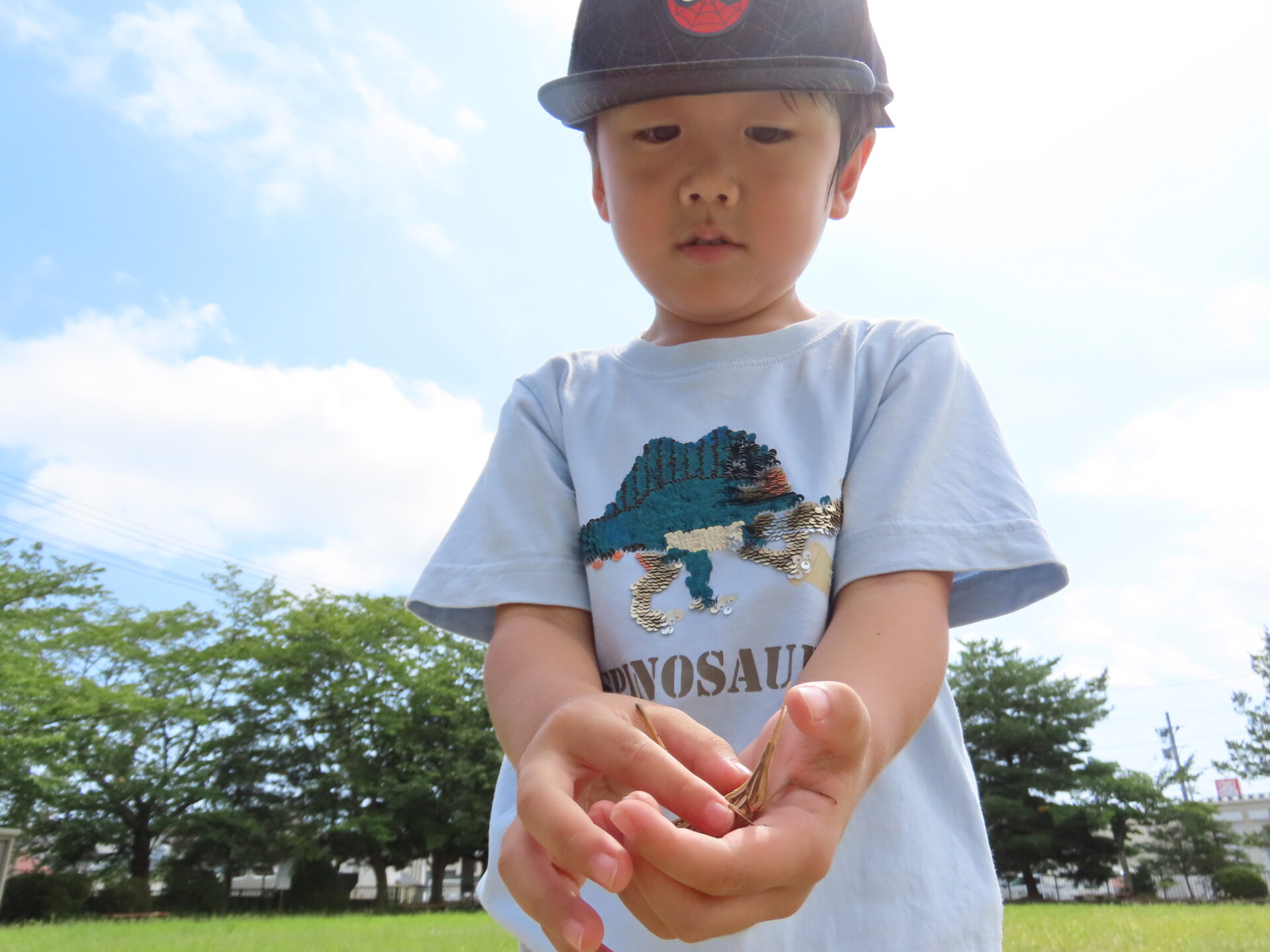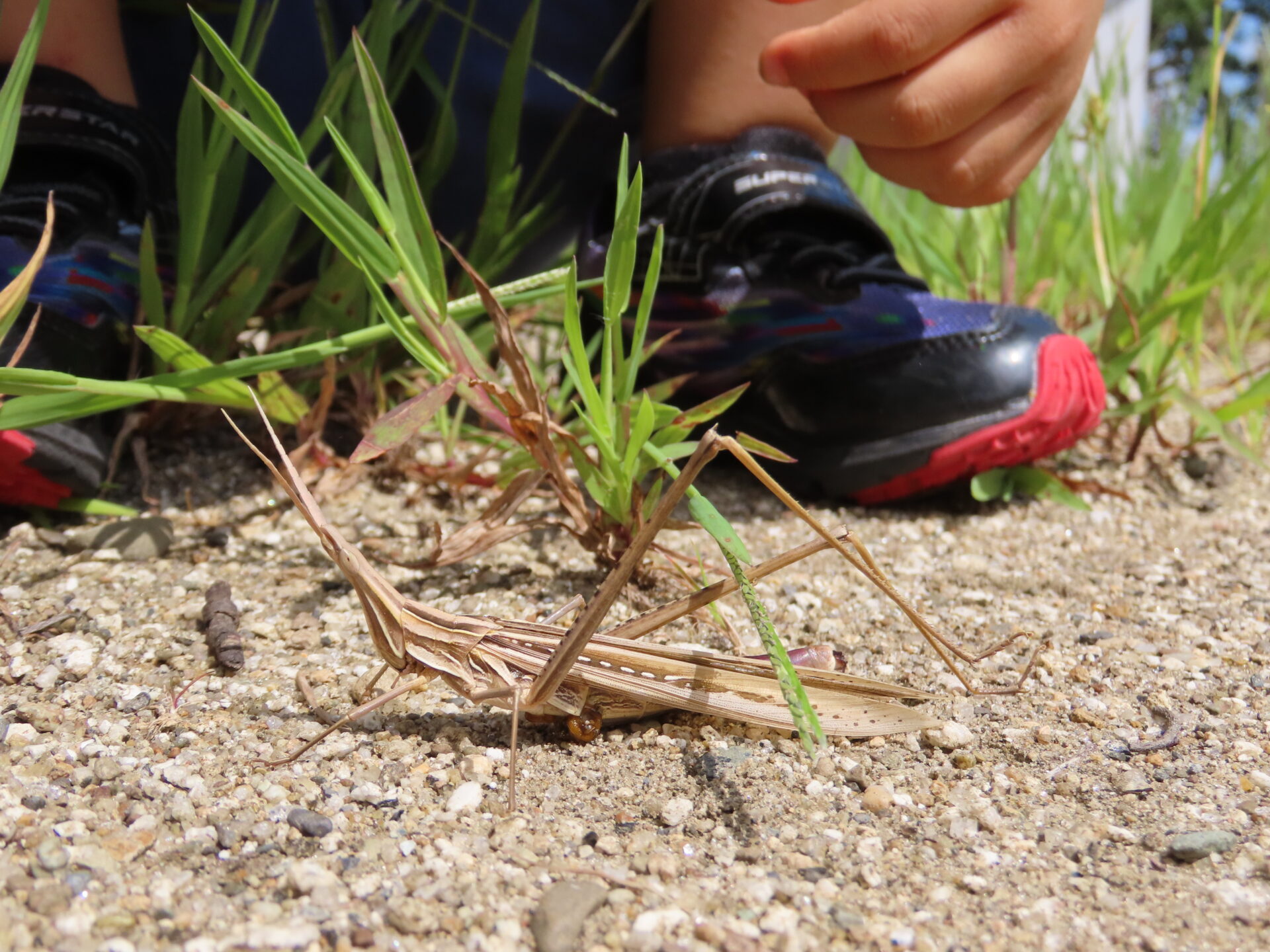 「ばっただ!」、「おおきいね!」と大喜びです。