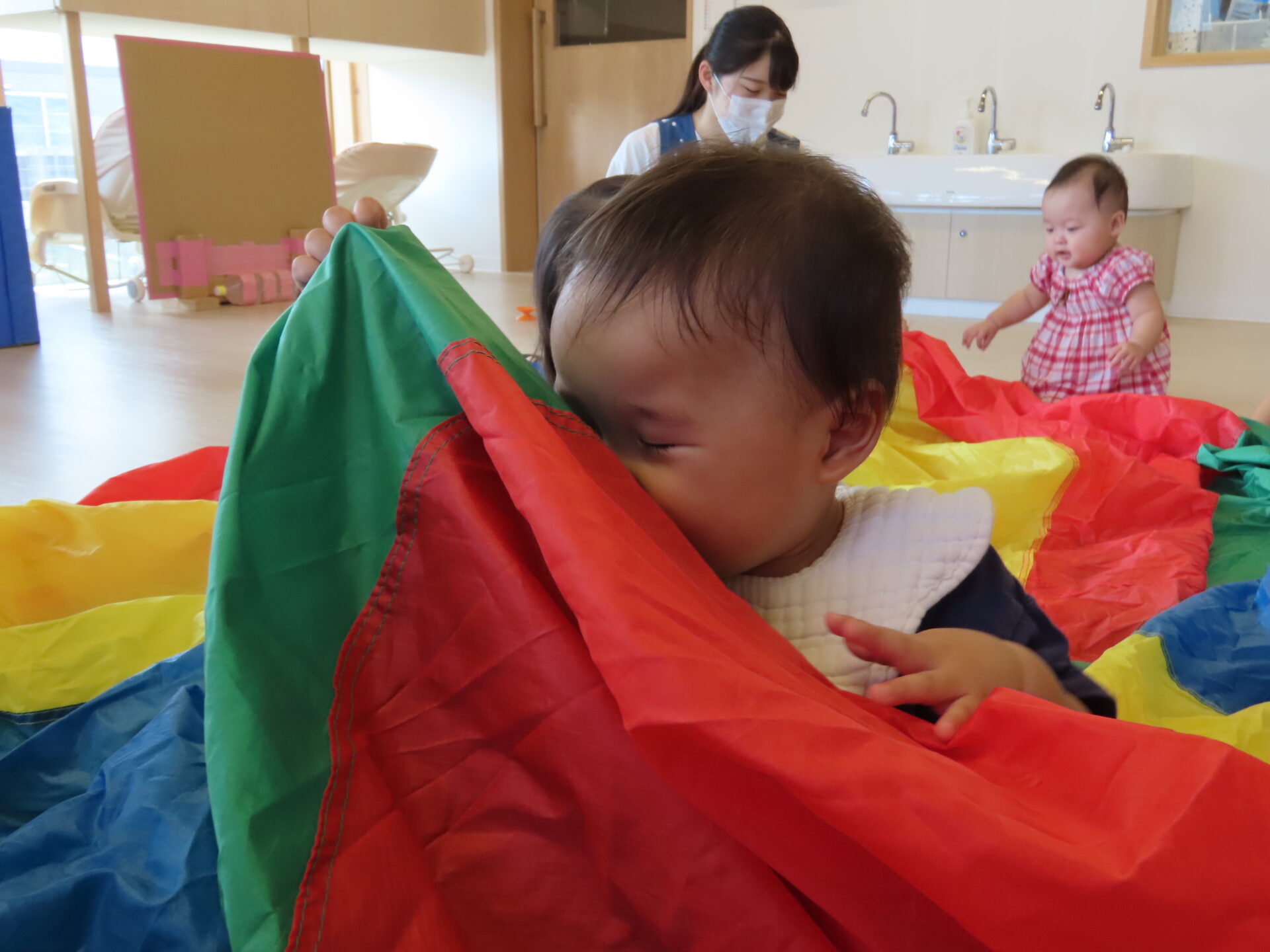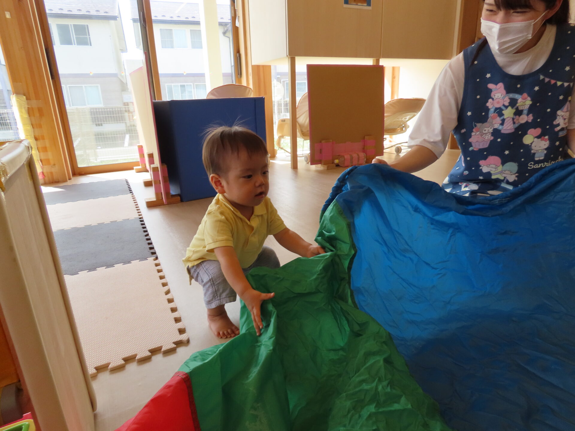 うみ組(0歳児)のこどもたちとバルーン遊びを行いました。