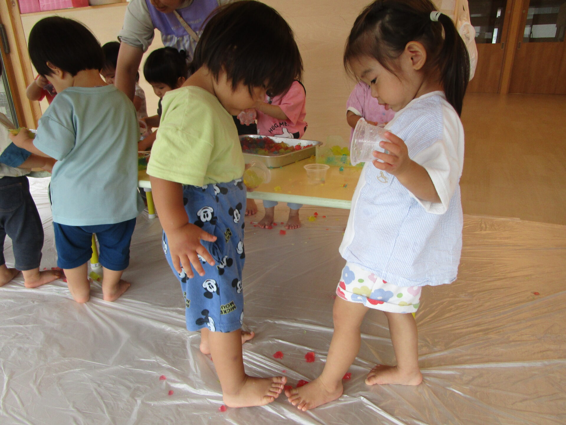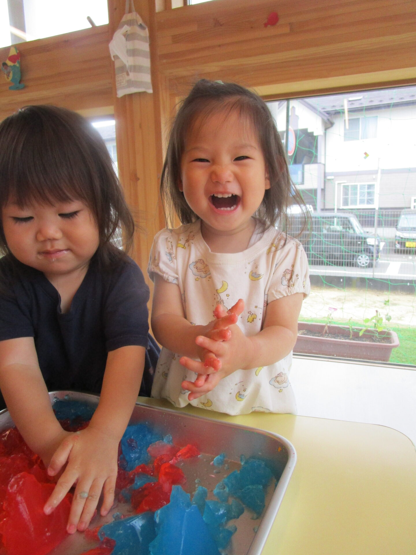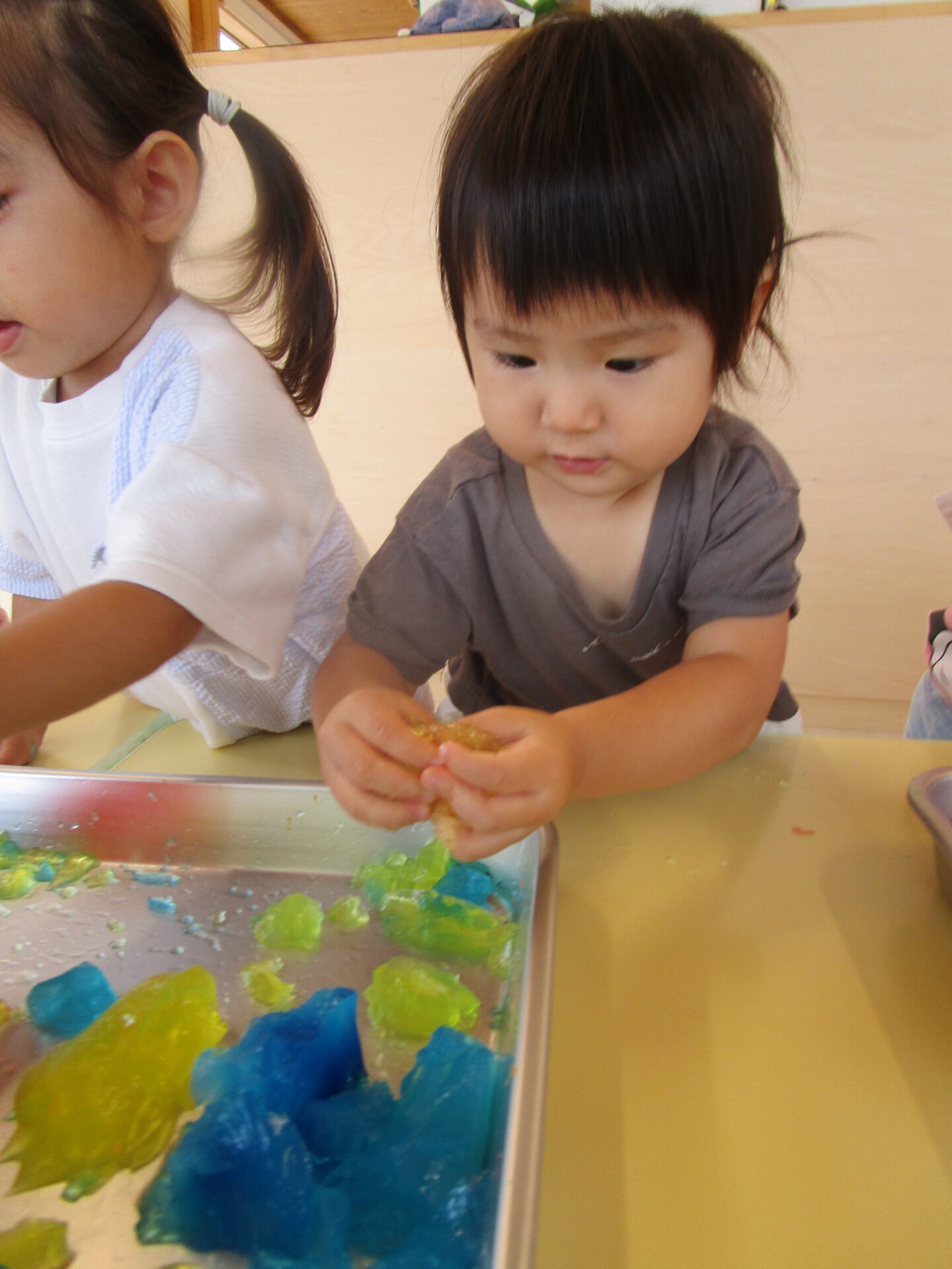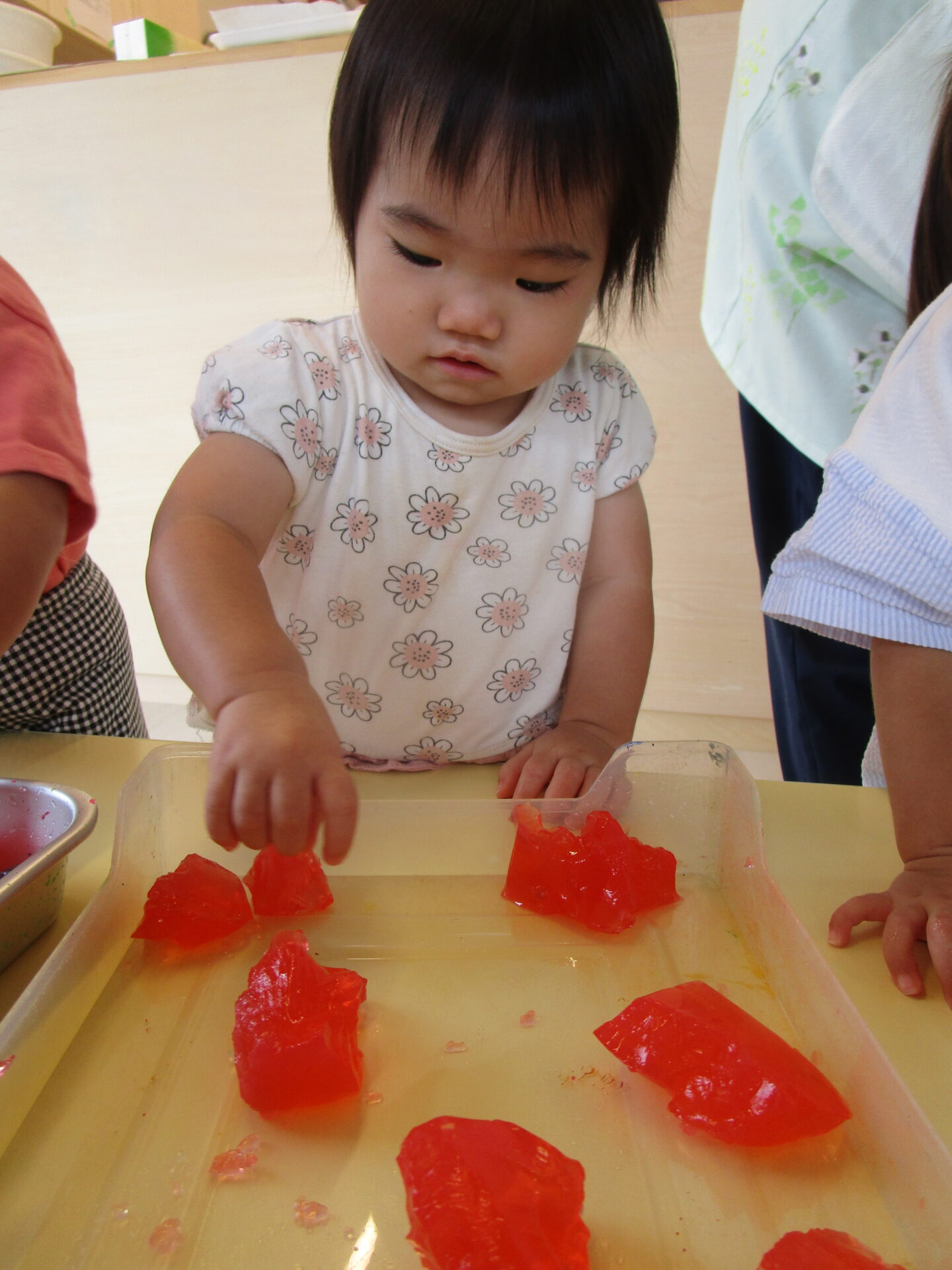 だいち組(0・1歳児)のこどもたちと寒天遊びを楽しみました。