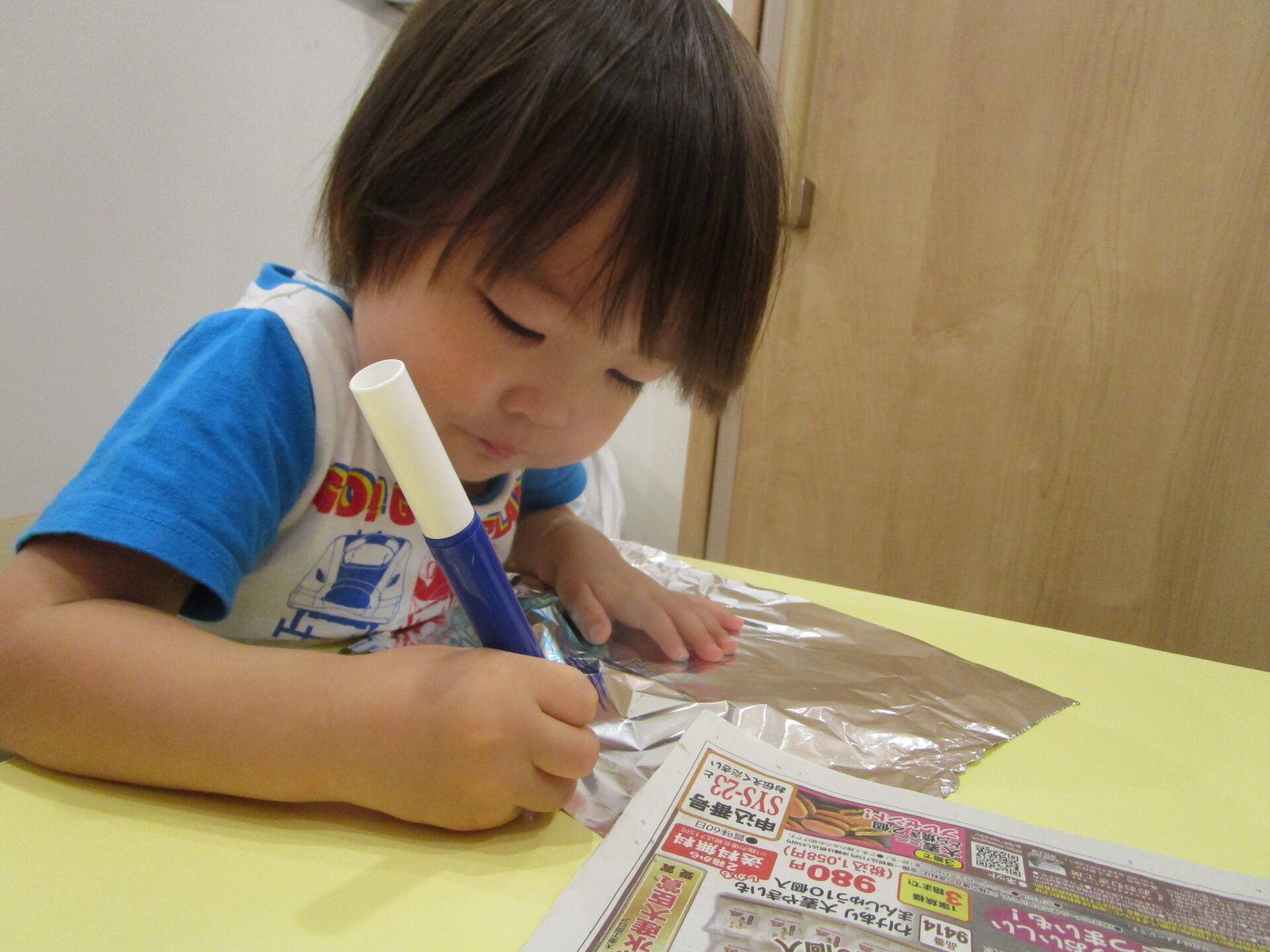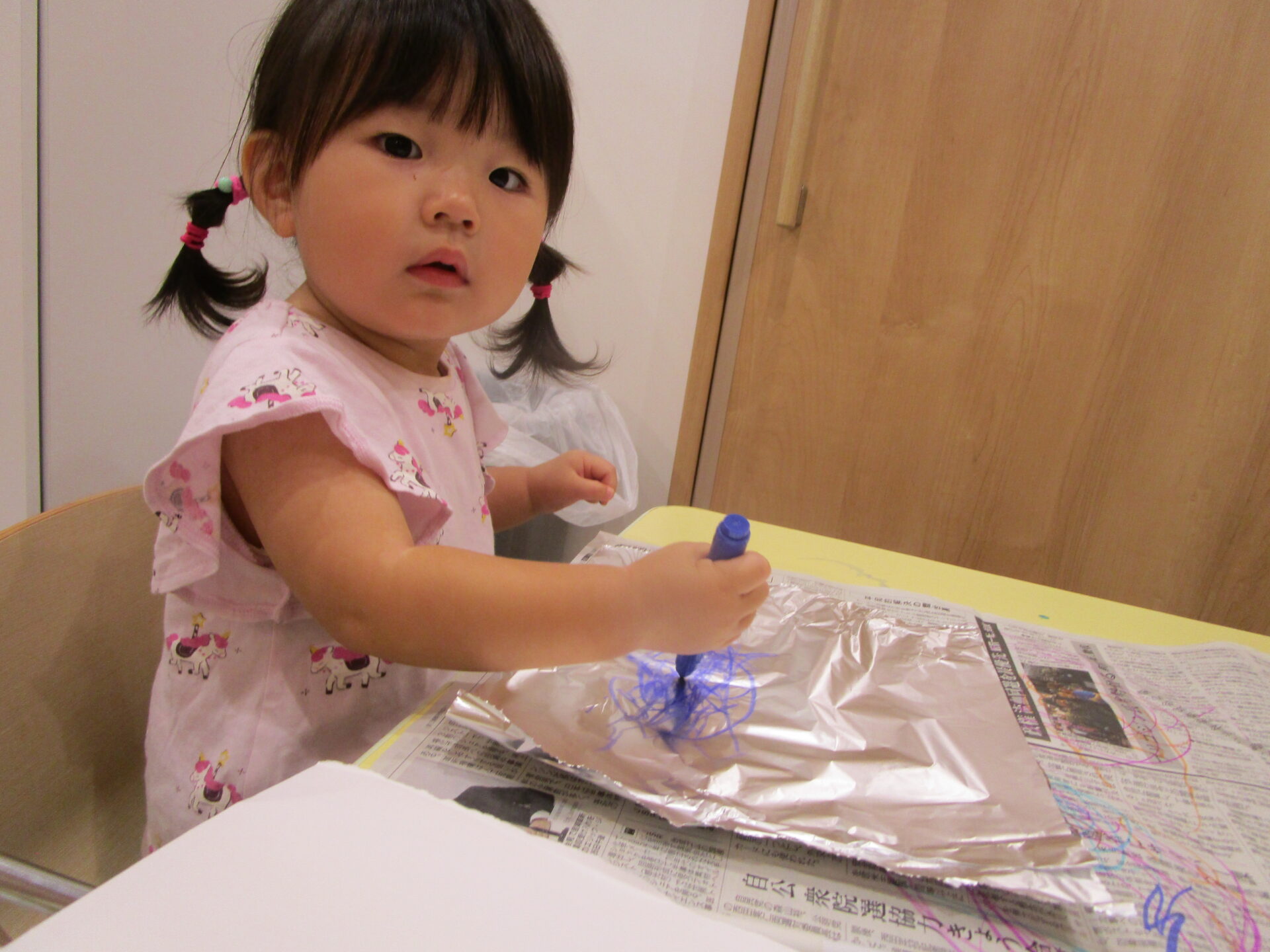 紙に描くことも楽しいのですが、キラキラホイルに油性ペンが滑る感触も面白いようで夢中になって描くことを楽しんでいました。夢中になっている表情がとても愛おしいです。