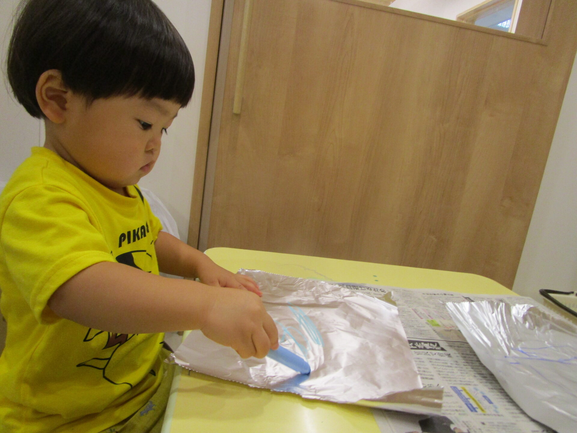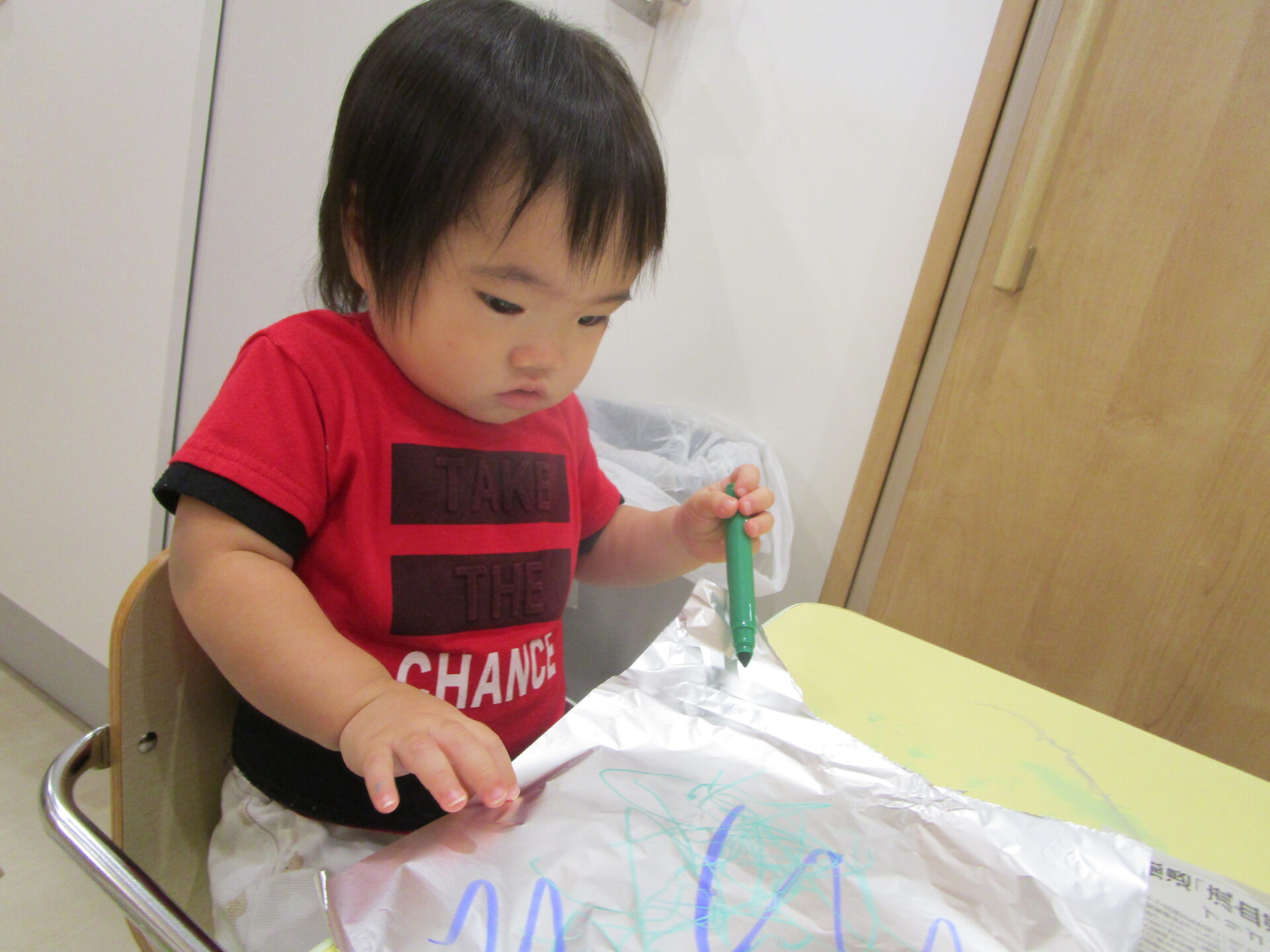 だいち組の1歳児のこどもたちとアルミホイルにお絵描きをしました。