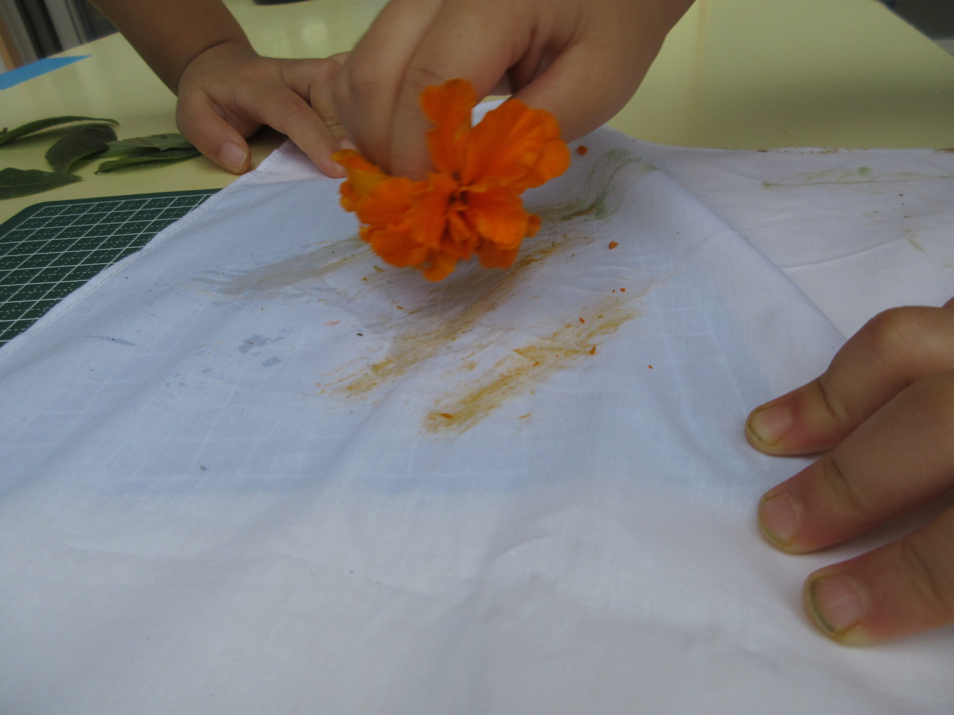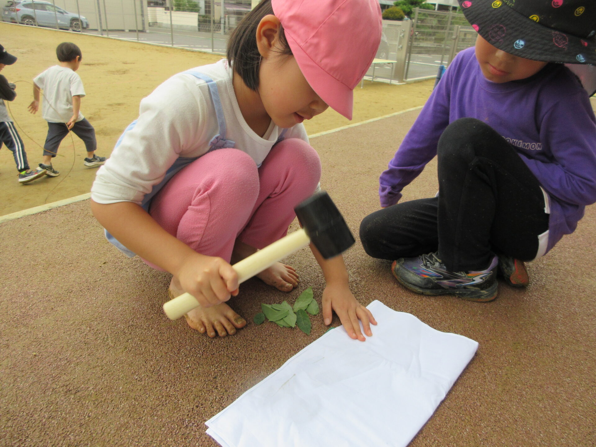 その葉っぱを集めたAちゃんは、綿ハンカチに葉っぱを挟みハンマーでトントントン。