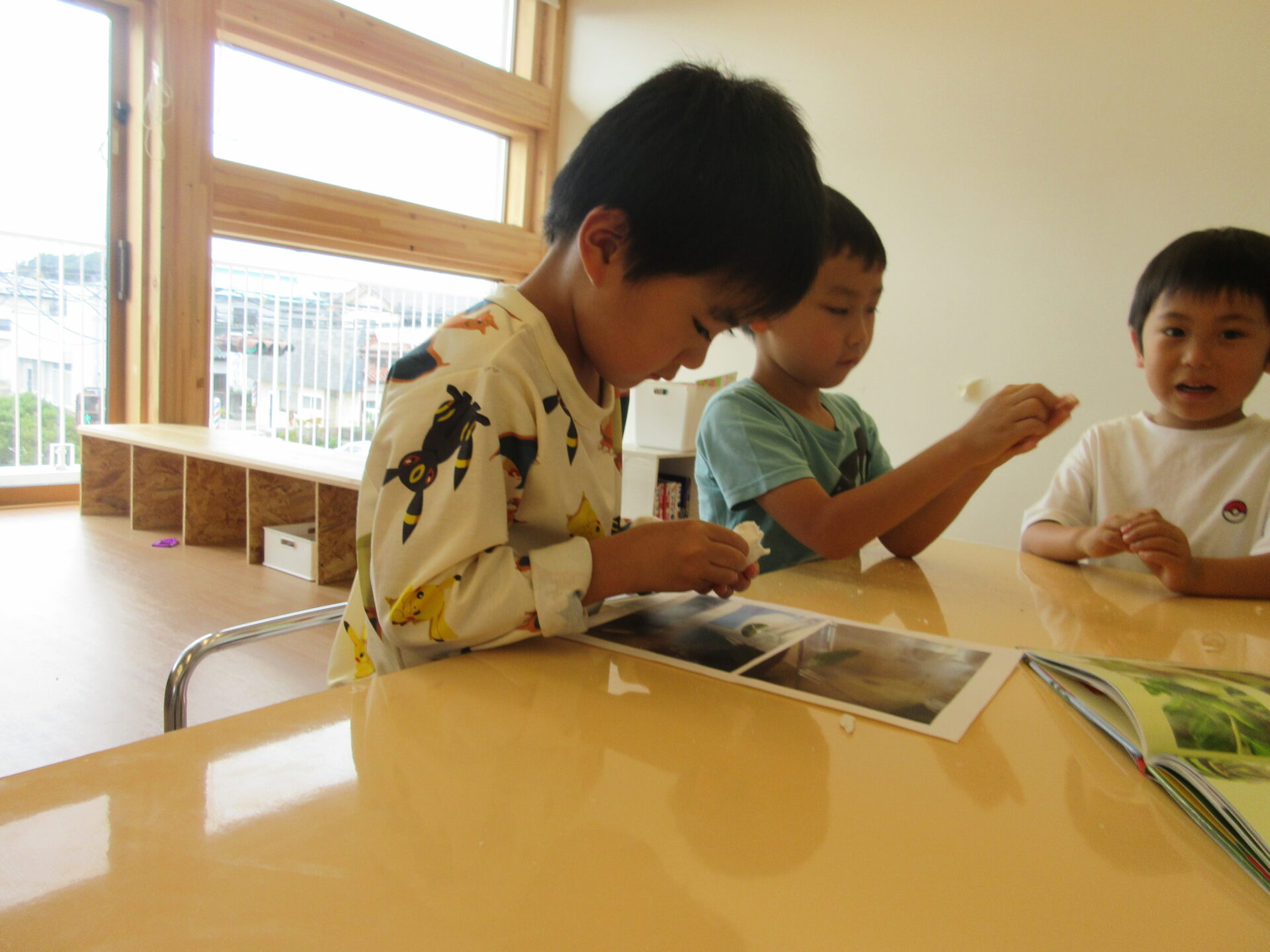幼虫が変化する様々な状態を観察したことを思い出したり、図鑑で確認しながら夢中になって作ることを楽しんでいます。