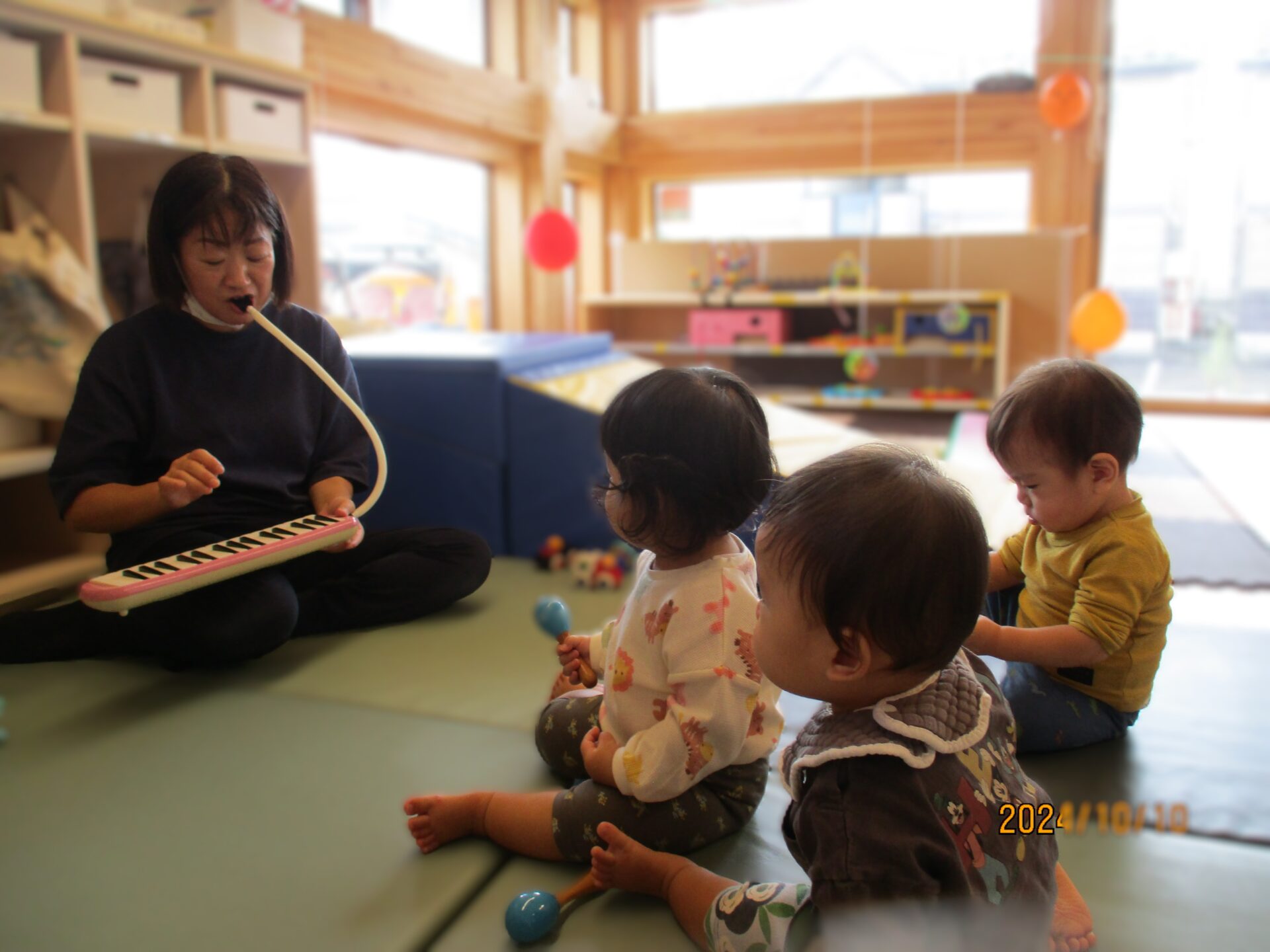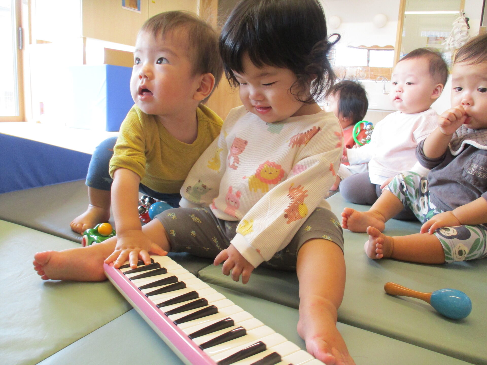 保育者が鍵盤ハーモニカで「きらきら星」を演奏すると、うみ組(0歳児)のこどもたちは体を左右に揺らして、音楽を身体で感じています。