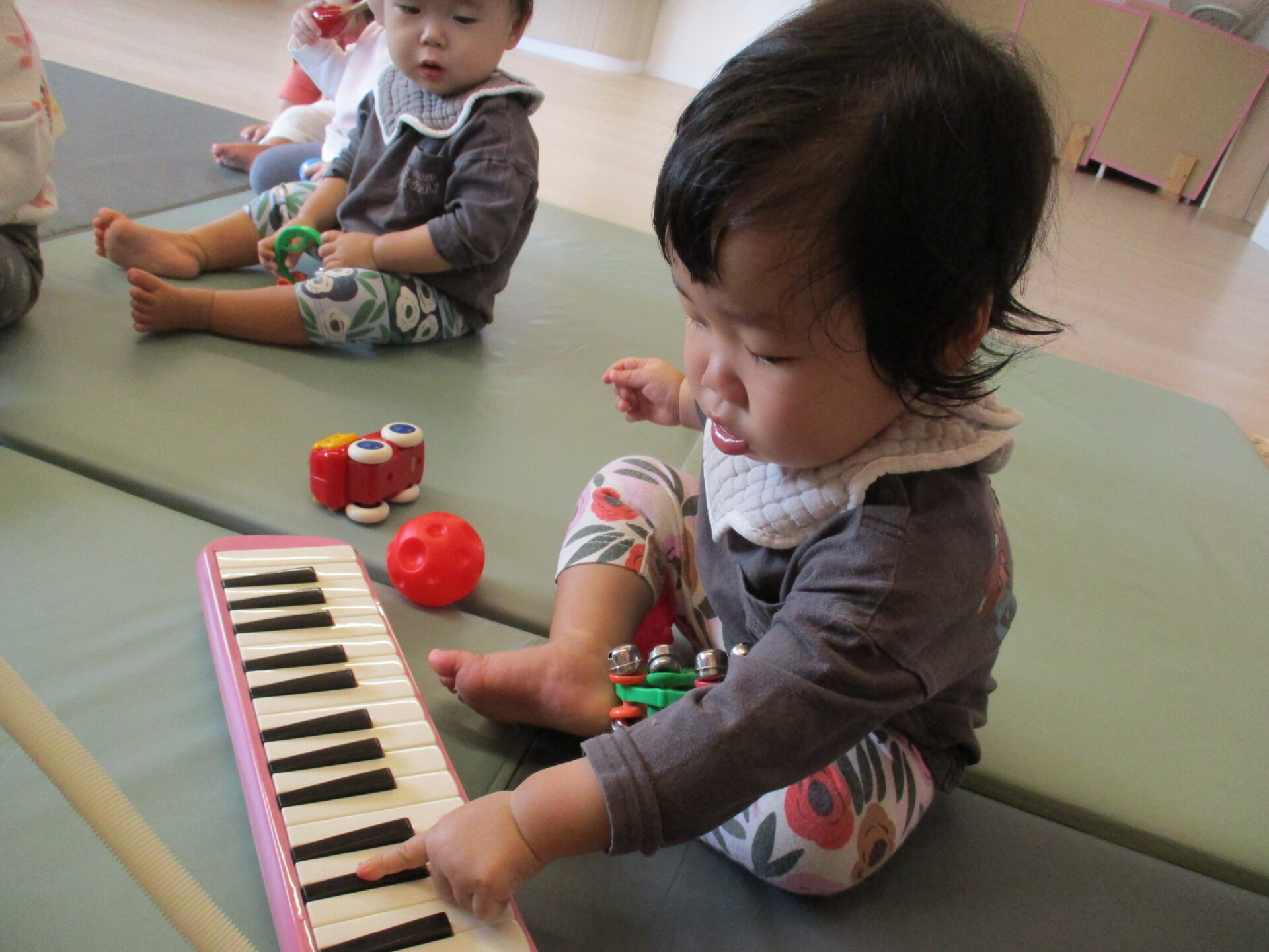 保育者の顔を見ながら、そーっと手を伸ばして鍵盤ハーモニカに触ったり・・・