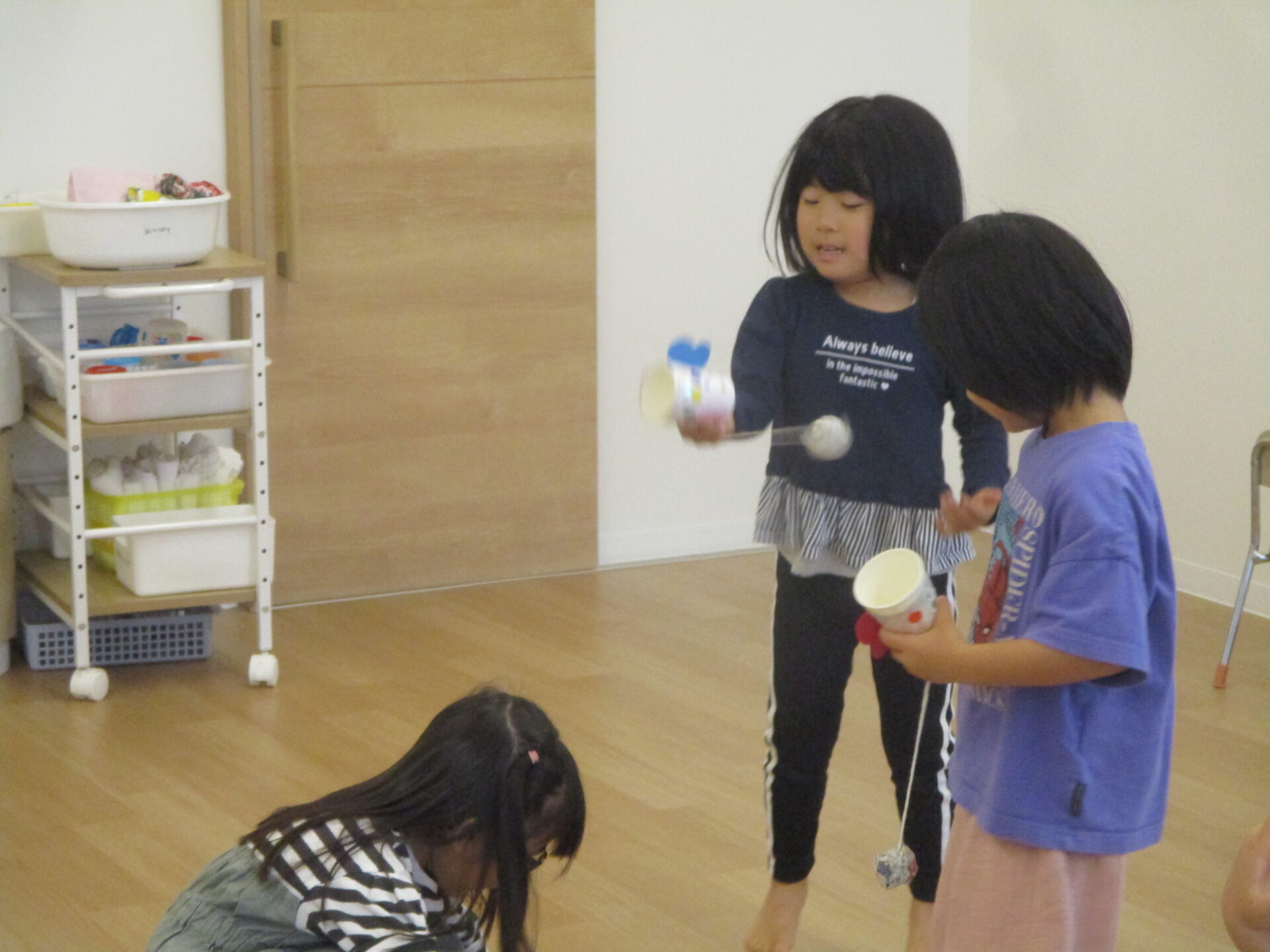みんな夢中になって作った紙コップけん玉に早速チャレンジ!
