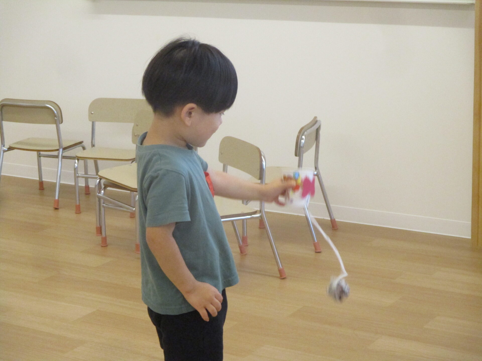 にじ組(3歳児)クラスでも、保育実習生がこどもたちが作って遊べる「紙コップけん玉作り」を提案してくれました。