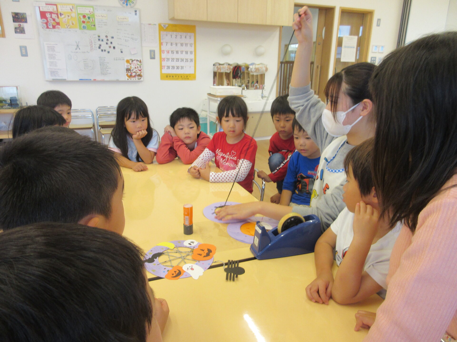 保育士を目指し、保育実習に来園している保育学生が、くじらくみ(5歳児)のこどもたちと一緒に遊びたいと「ハロウィンリースづくり」を提案してくれました。