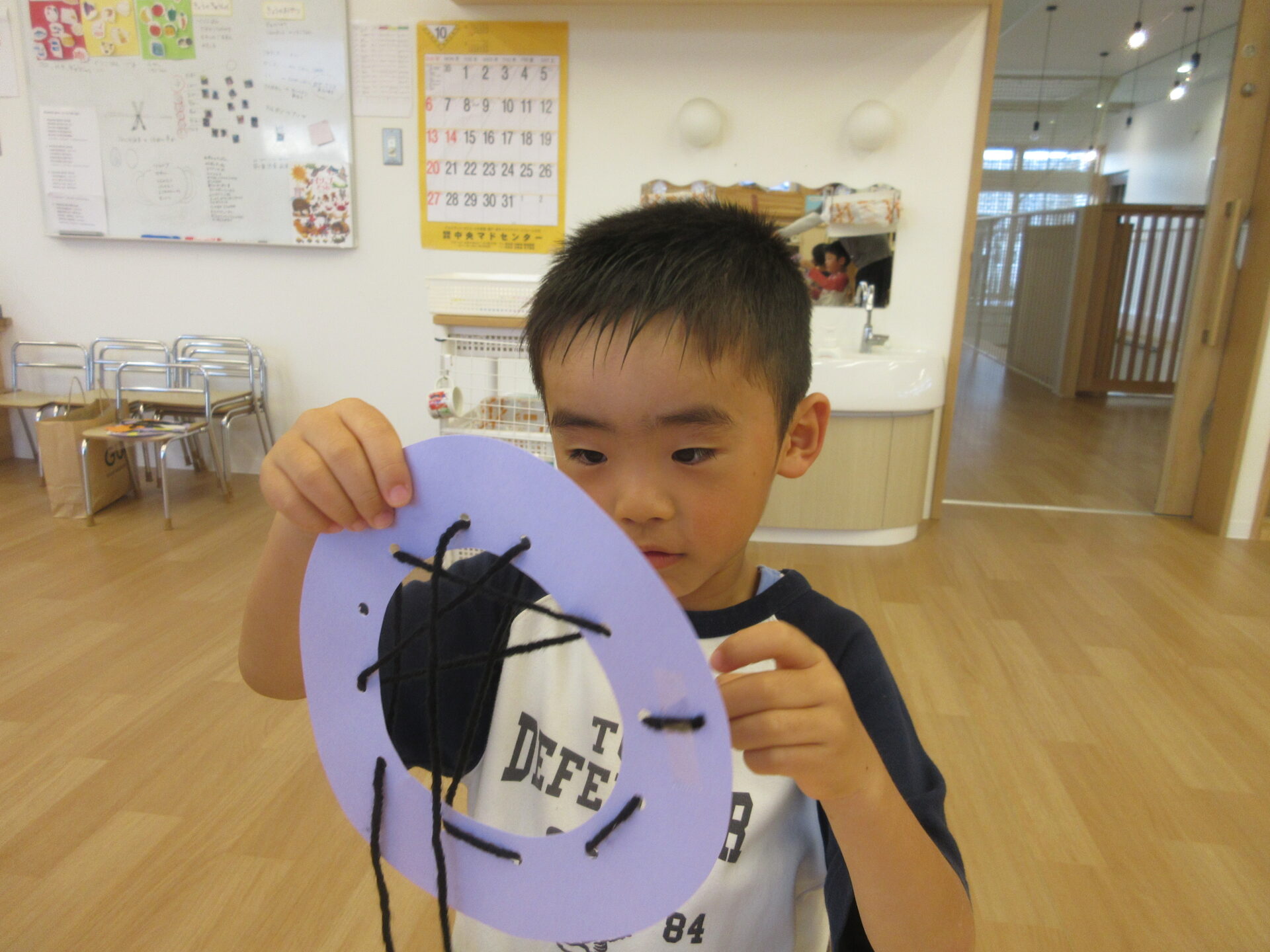 「面白そう!」と、興味津々で取り組み始めたのですが、クモの巣を表現するヒモ通しは難易度があり、5歳児のこどもたちにとって挑戦する意欲を刺激されたようで、夢中になって取り組んでいました。