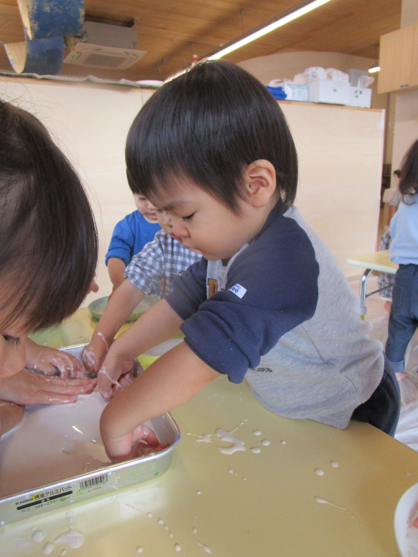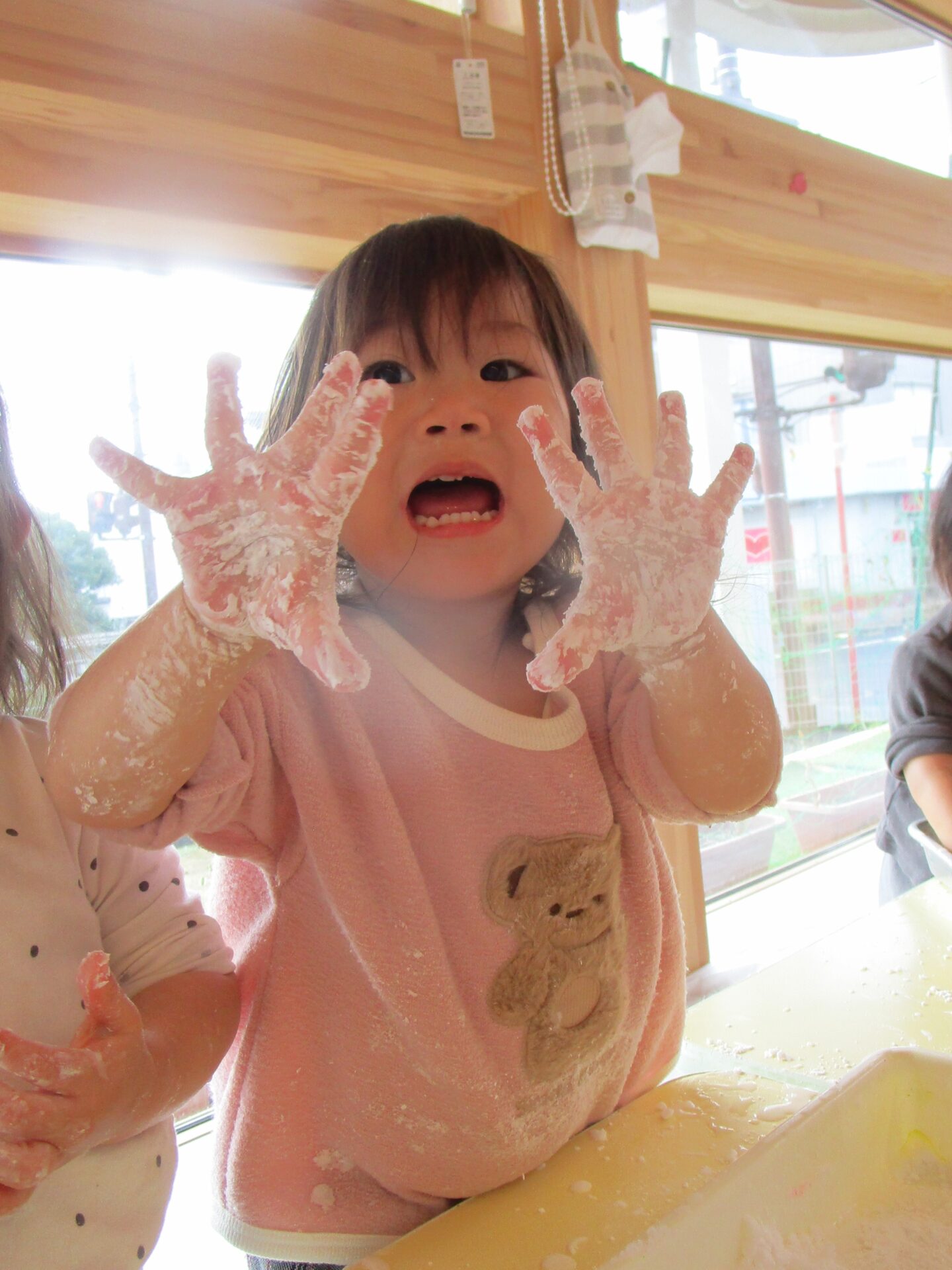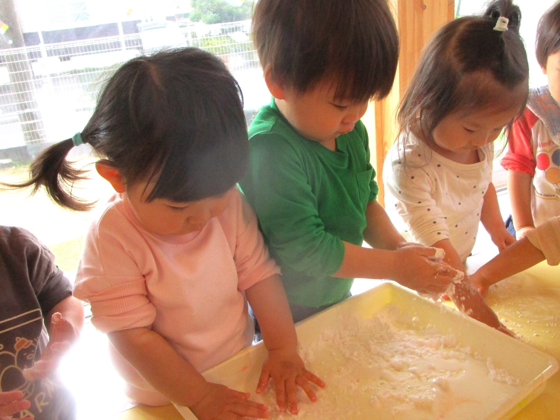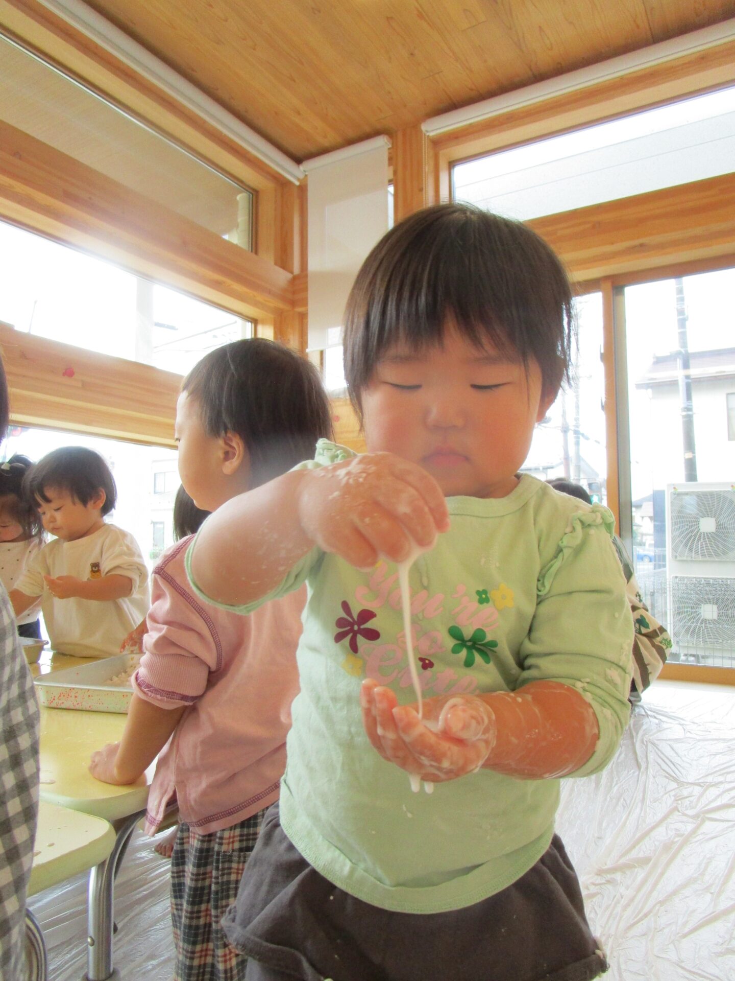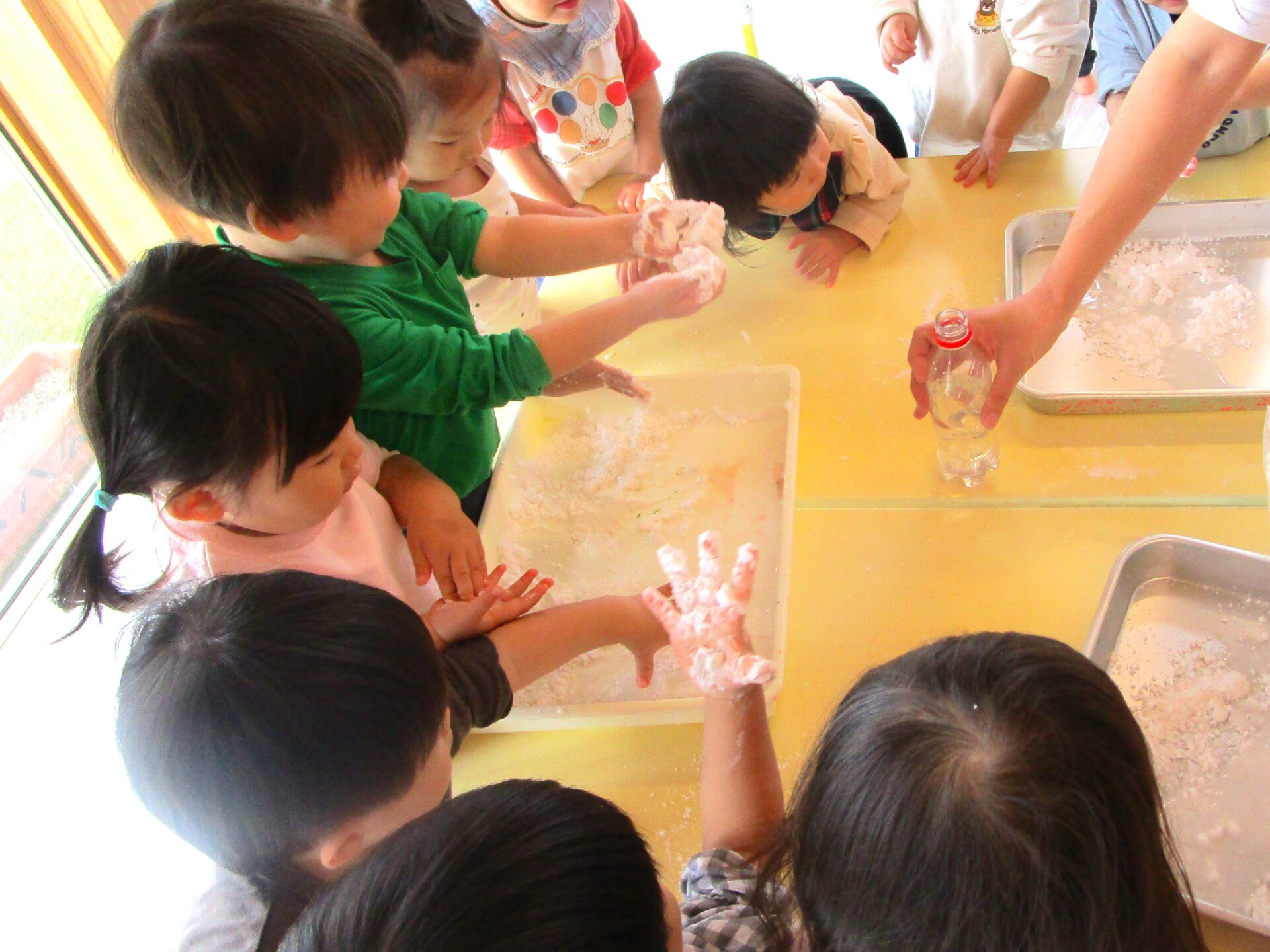 今日のブログは、だいち組(0・1歳児)のこどもたちが好きな「かたくりこ遊び」の様子です。