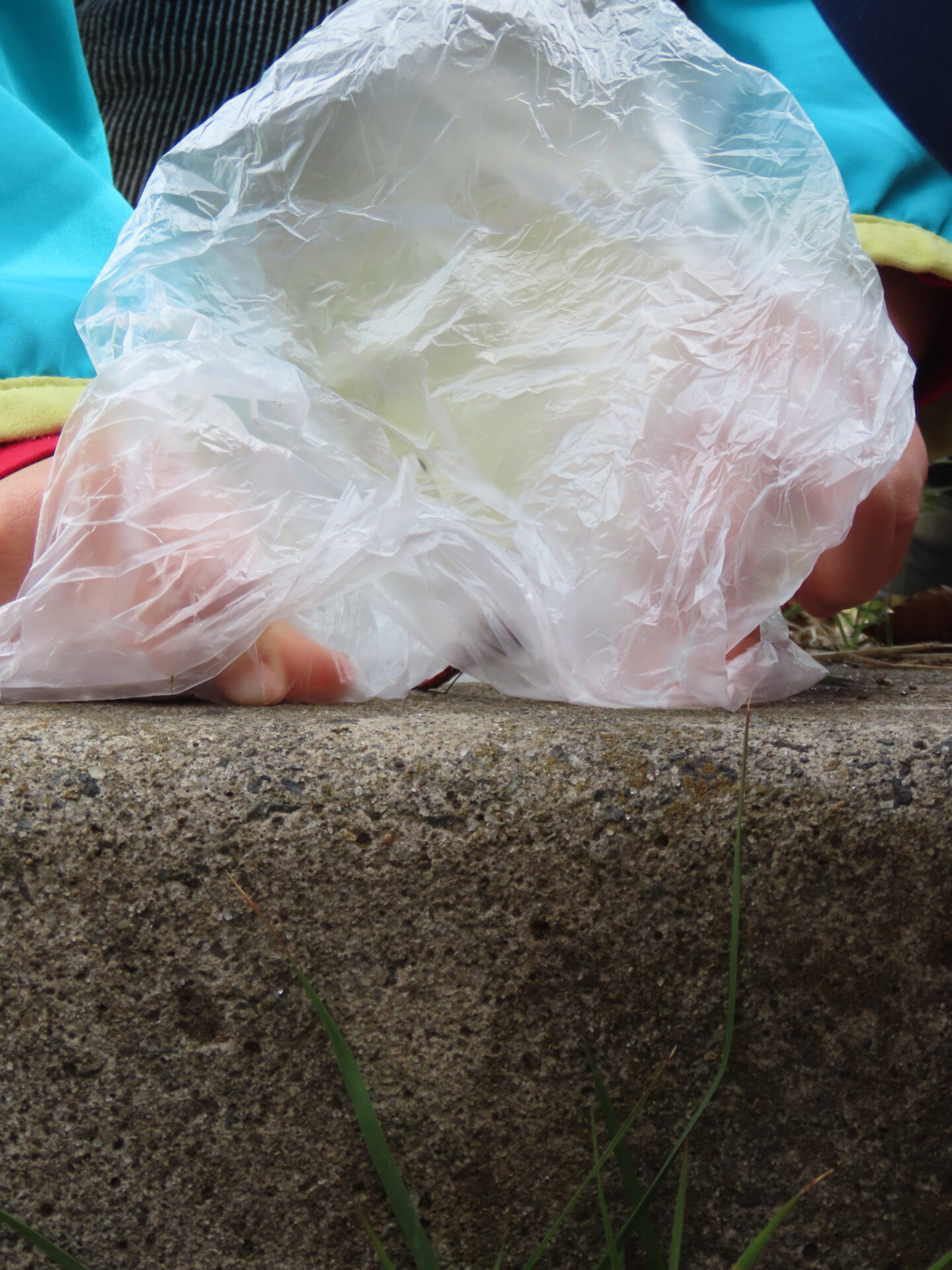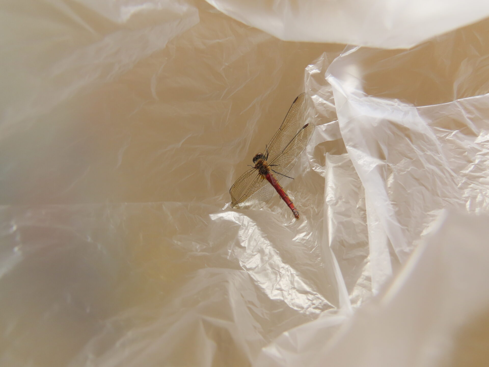 袋を使って捕まえたAさんは、器用に手で袋を調整しながら、とんぼを袋の奥へと誘導していきます。