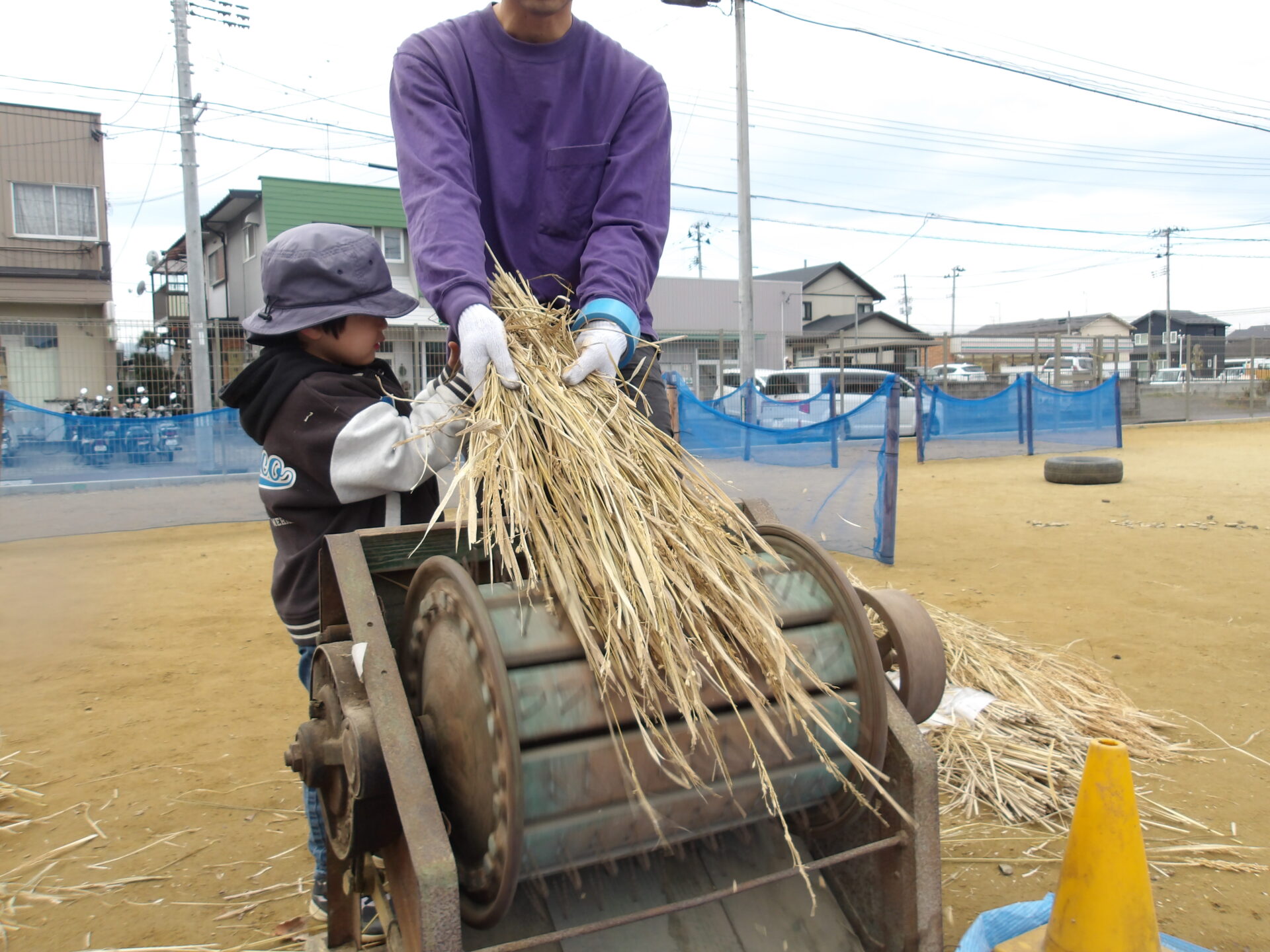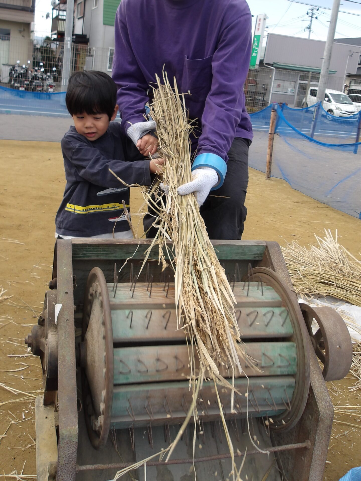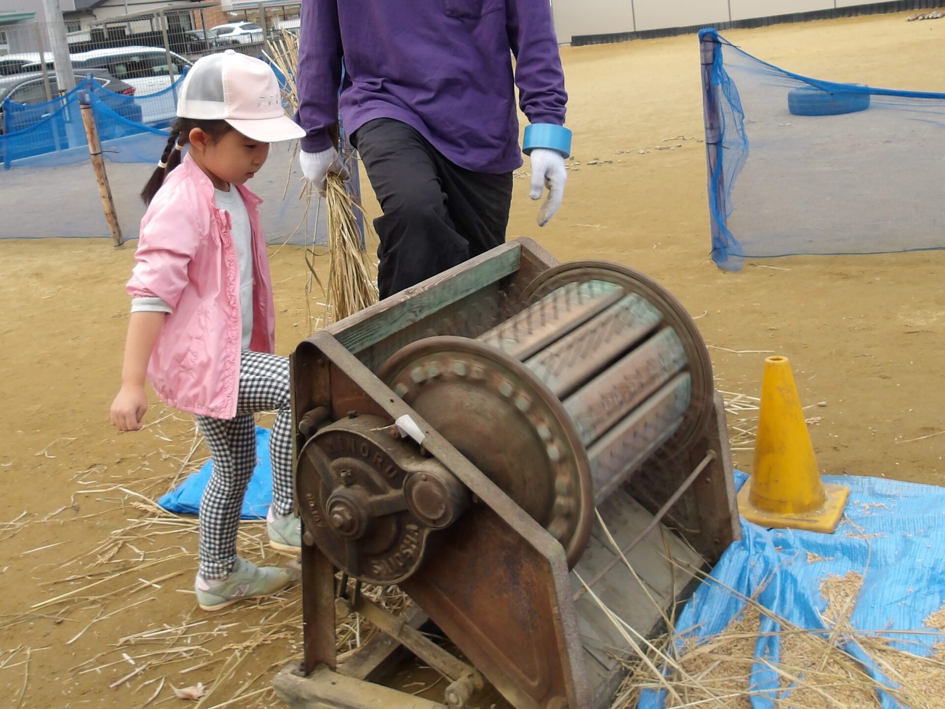 足踏み脱穀機に興味を持ったそら組(4歳児)のこどもたち。