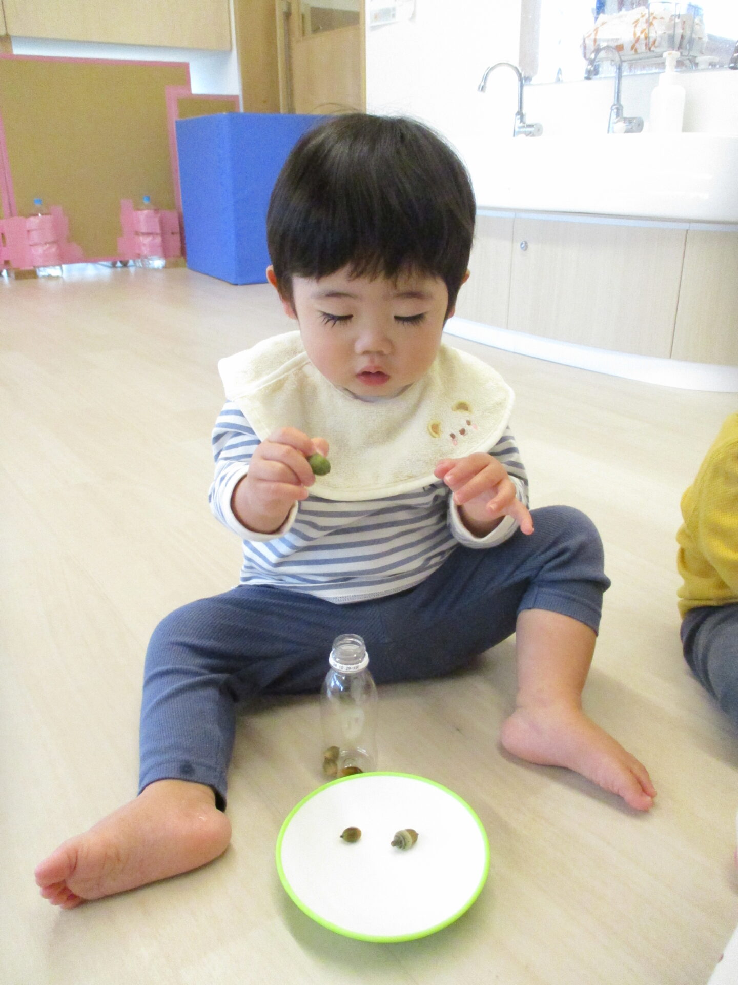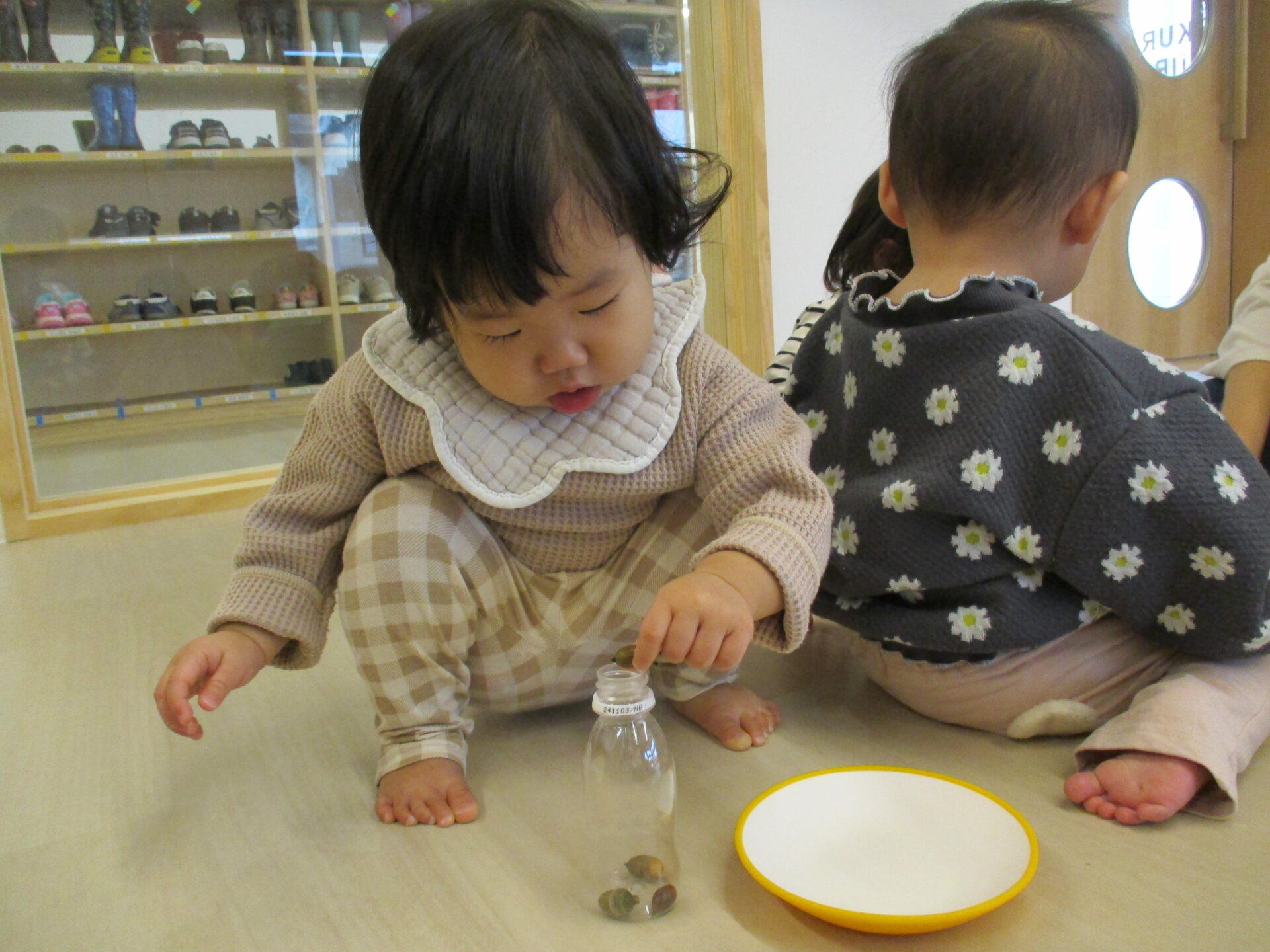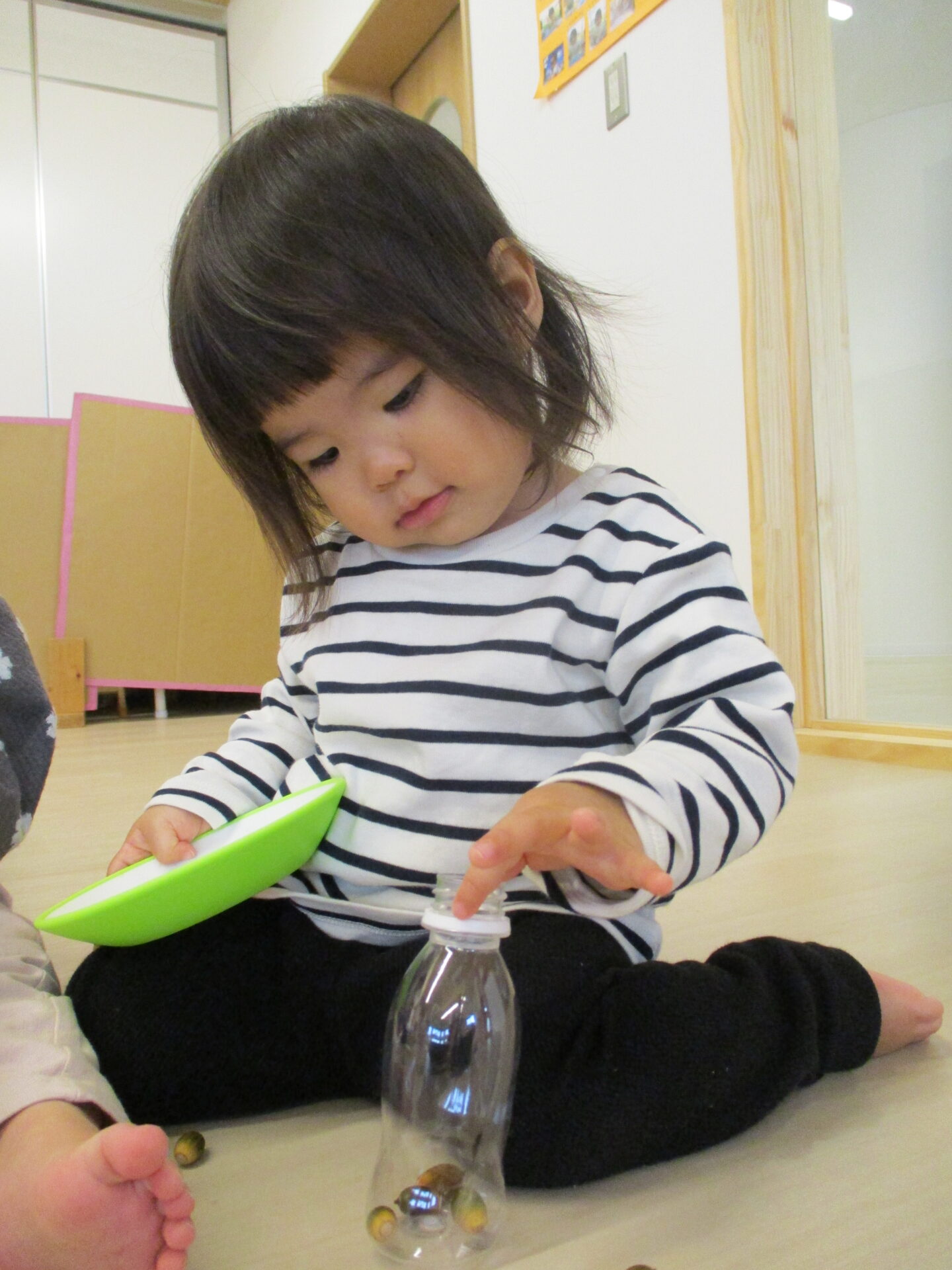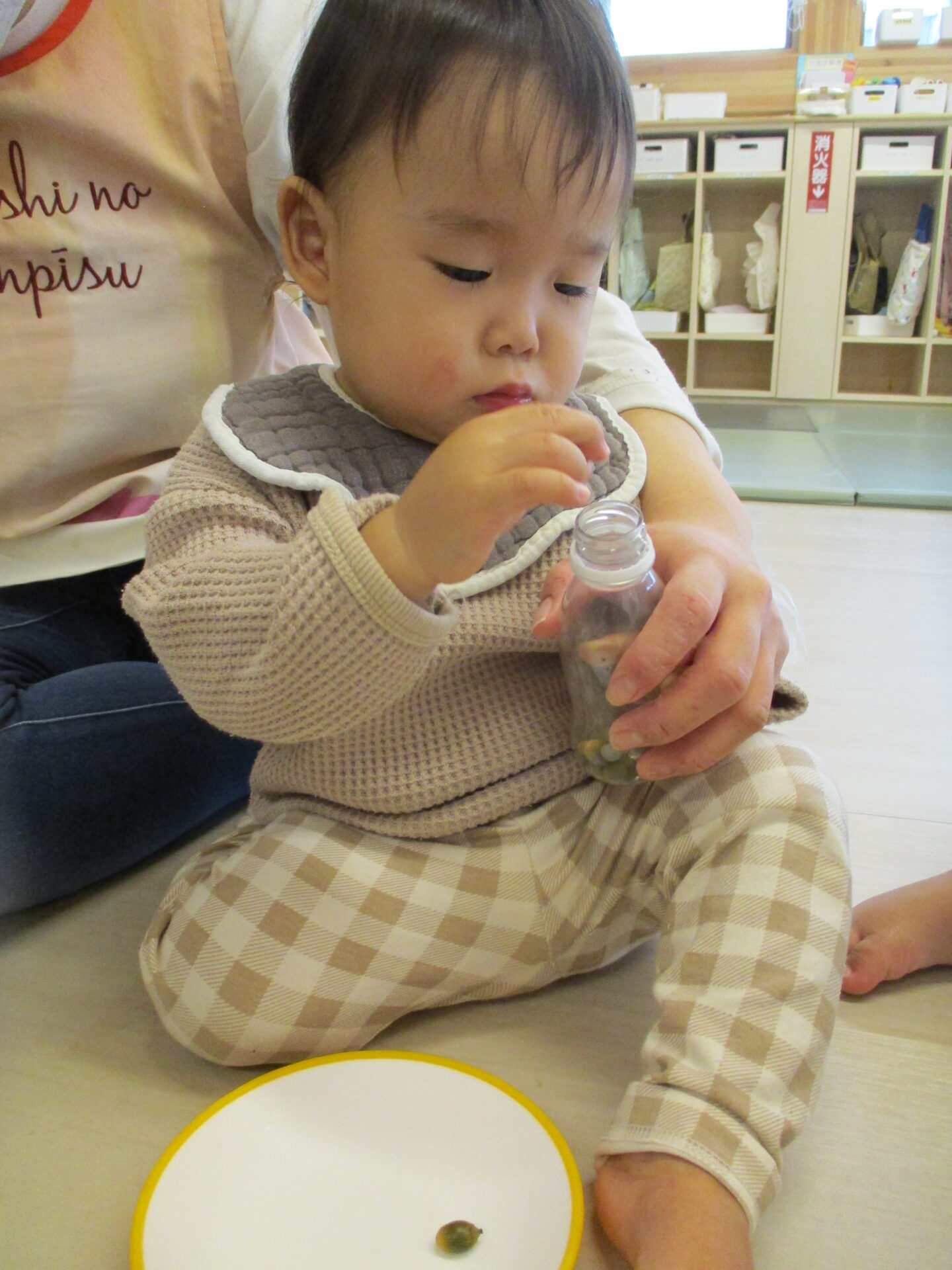 小さいどんぐりも上手につまんで入れることに夢中になっていました。