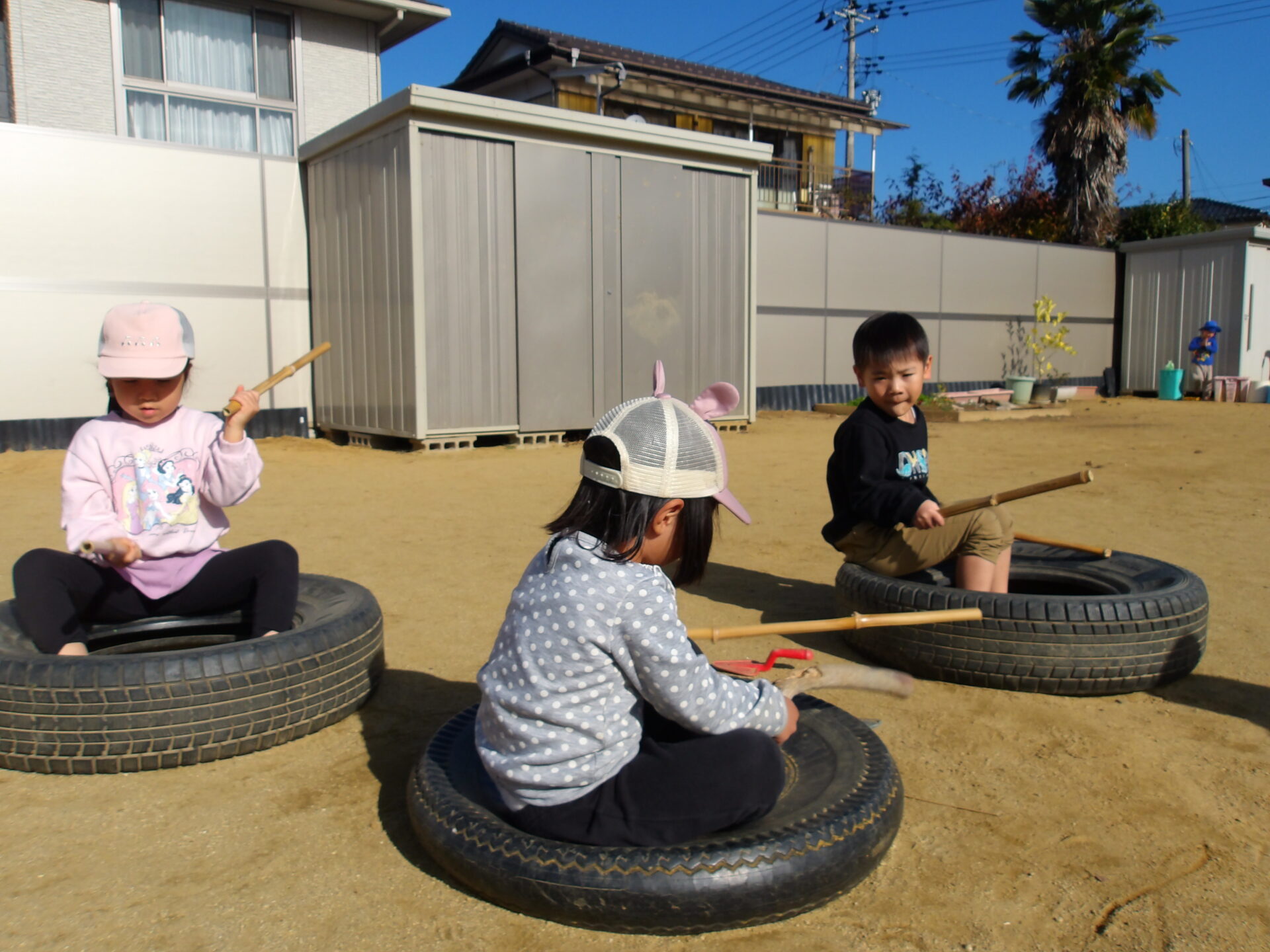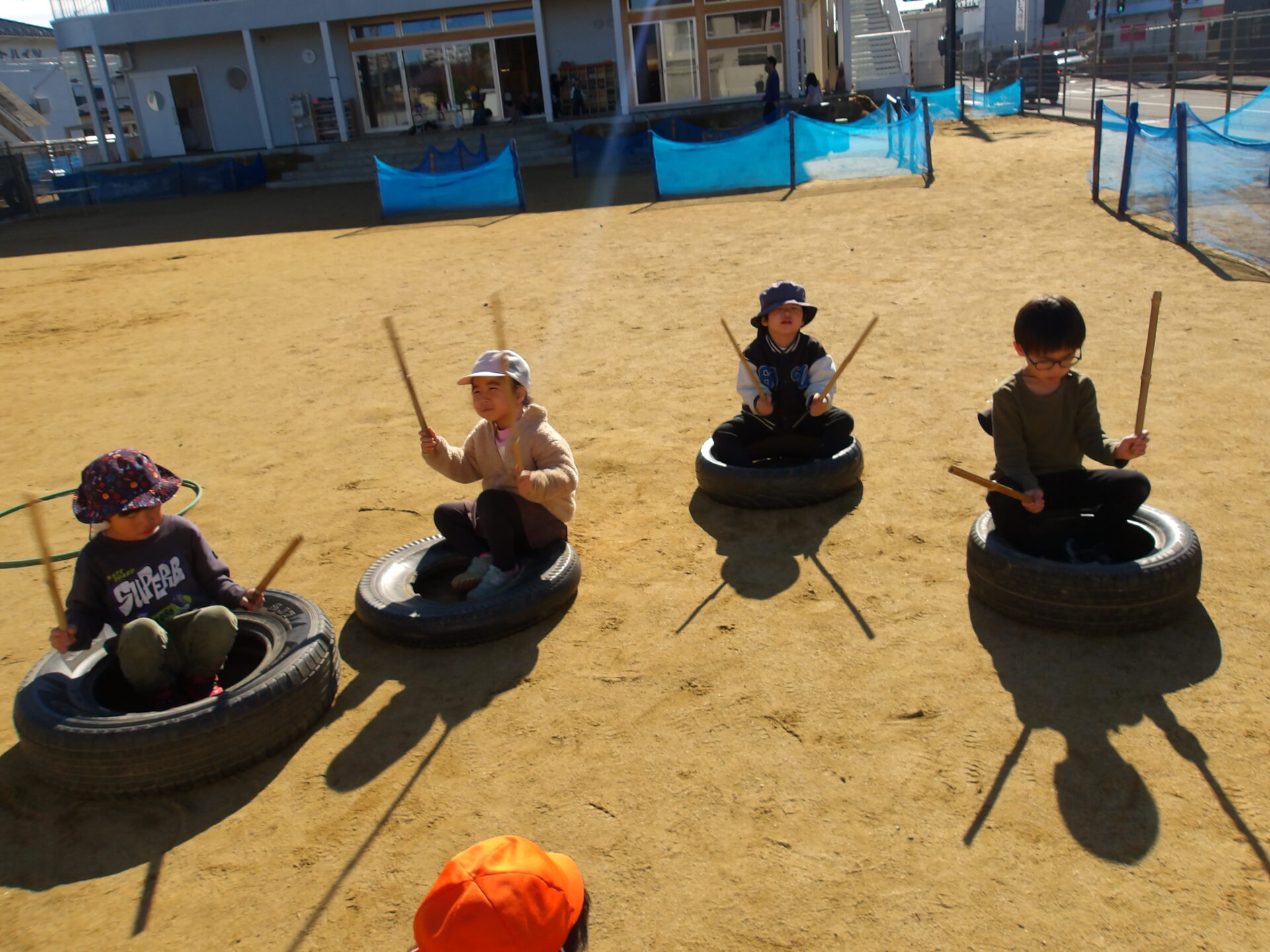 そら組(4歳児)のこどもたちが、園庭のタイヤを太鼓に見立てて遊んでいました。