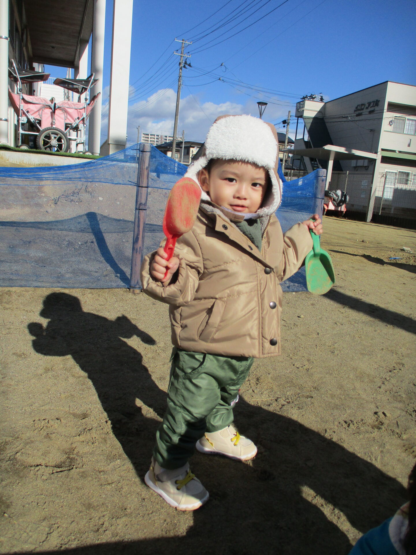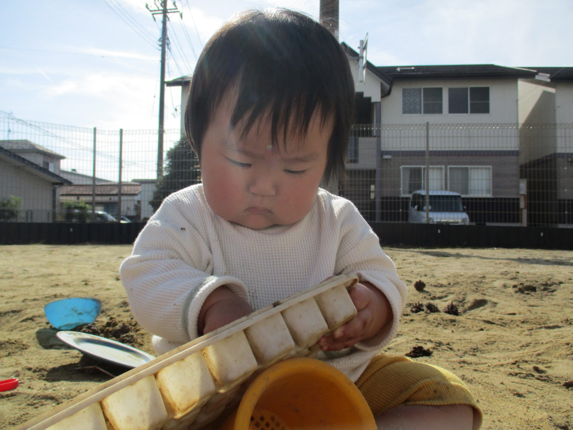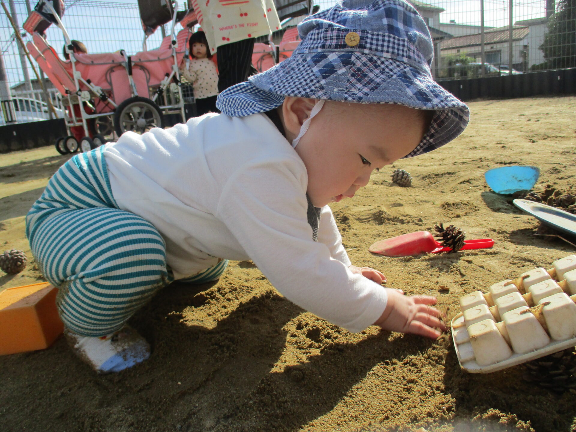 秋の暖かい日差し日のことです。うみ組(0歳児)のこどもたちと、正面玄関前の園庭に遊びに行きました。
