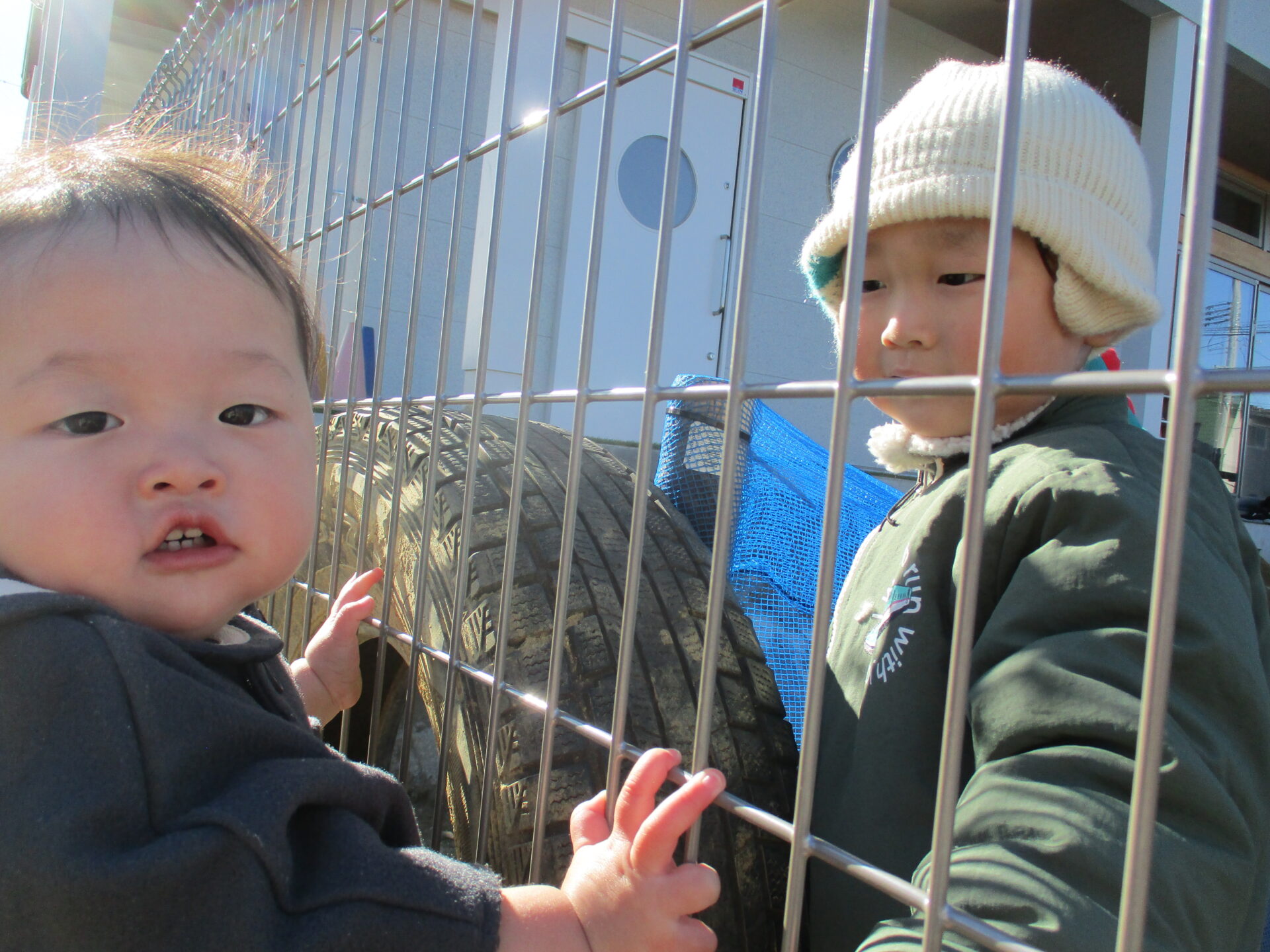 正面玄関前のスロープ下では、大きい園庭との仕切り越しに、お兄ちゃんと出会ったことを声を上げて知らせてくれました。