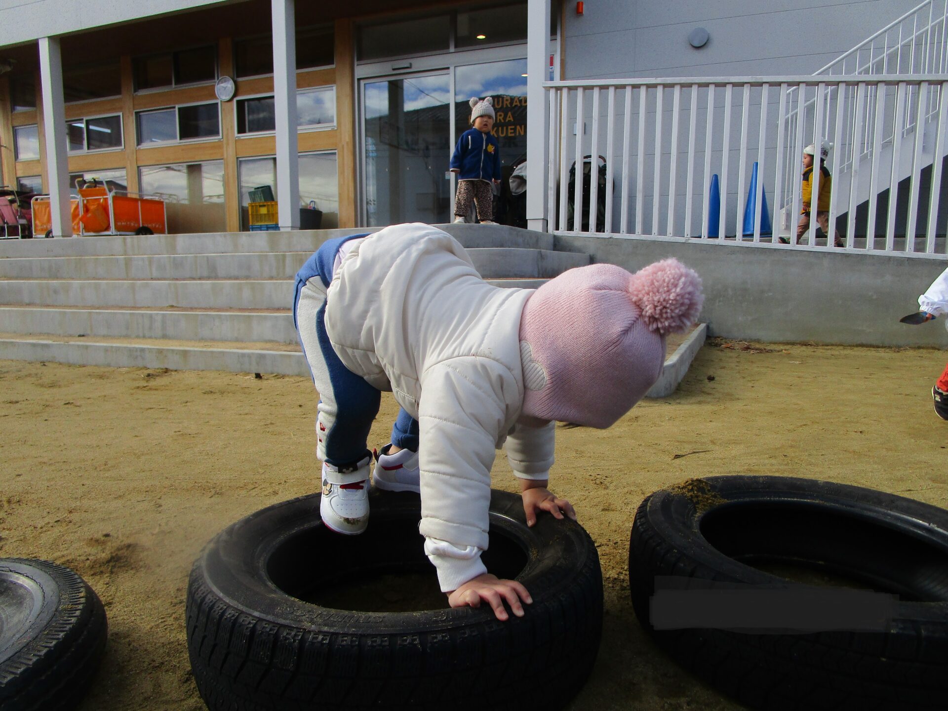 正面玄関前の0・1歳児用の園庭にタイヤを置いたところ、だいち組(1歳児)のこどもたちはタイヤの上に登ったり、中に入ったりなど、思い思いに遊び始めました。