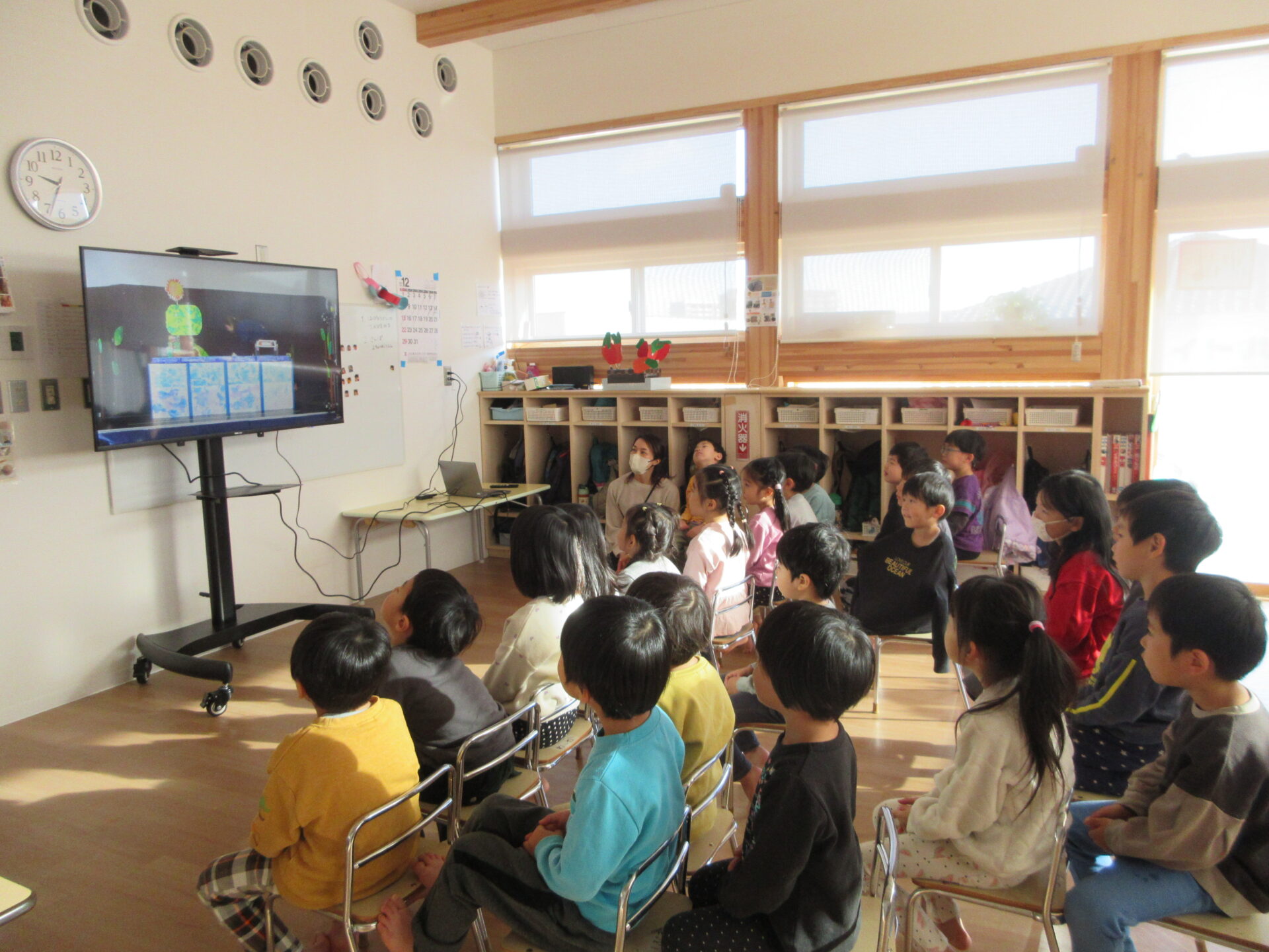 そら組(4歳児)のこどもたちが、先日の「みんなの発表会」で行った発表を「みんなで見よう!」と、動画鑑賞会を行いました。