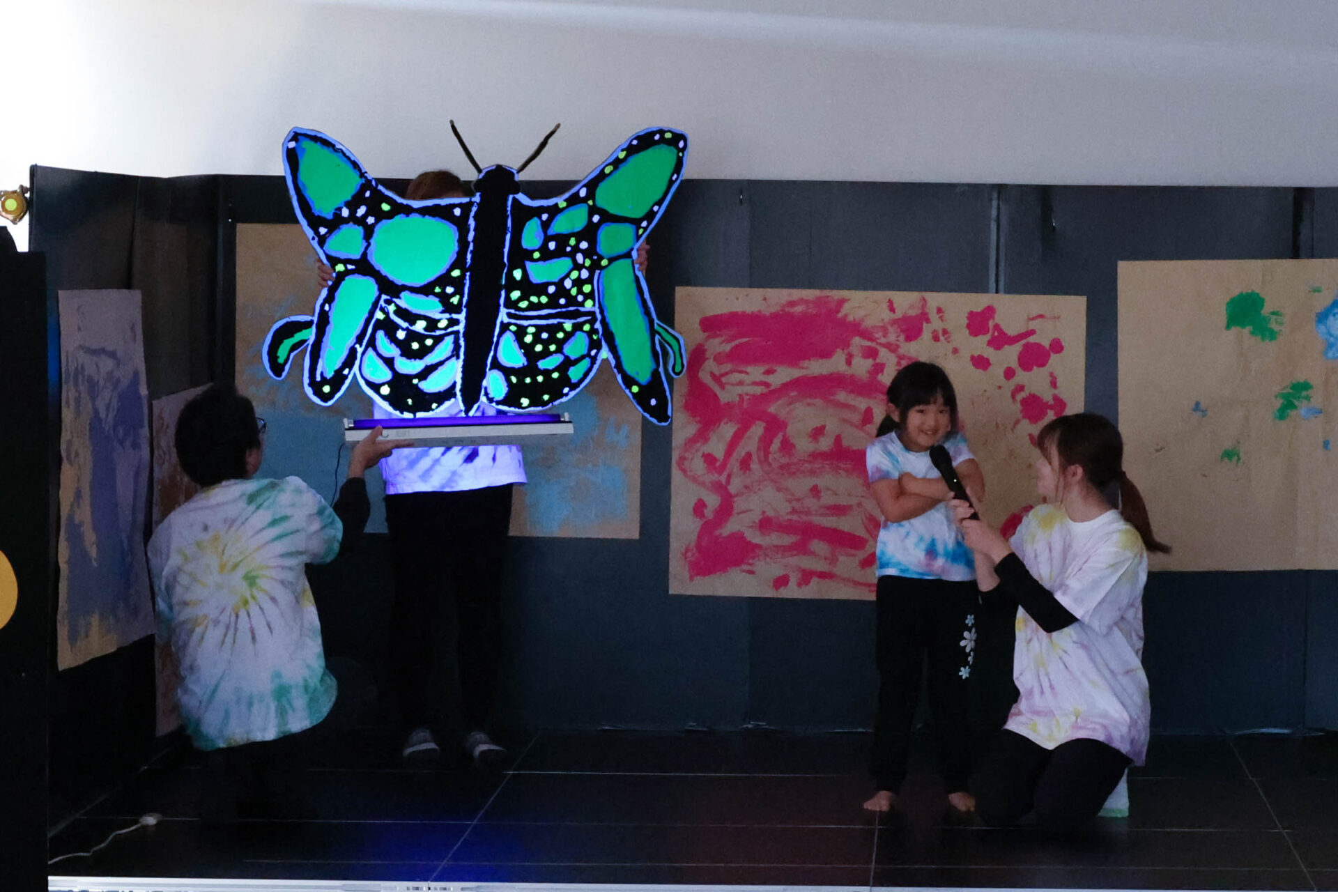光る絵の具を使って描いた「きんきらちょう」はブラックライトを照らして紹介しました。
