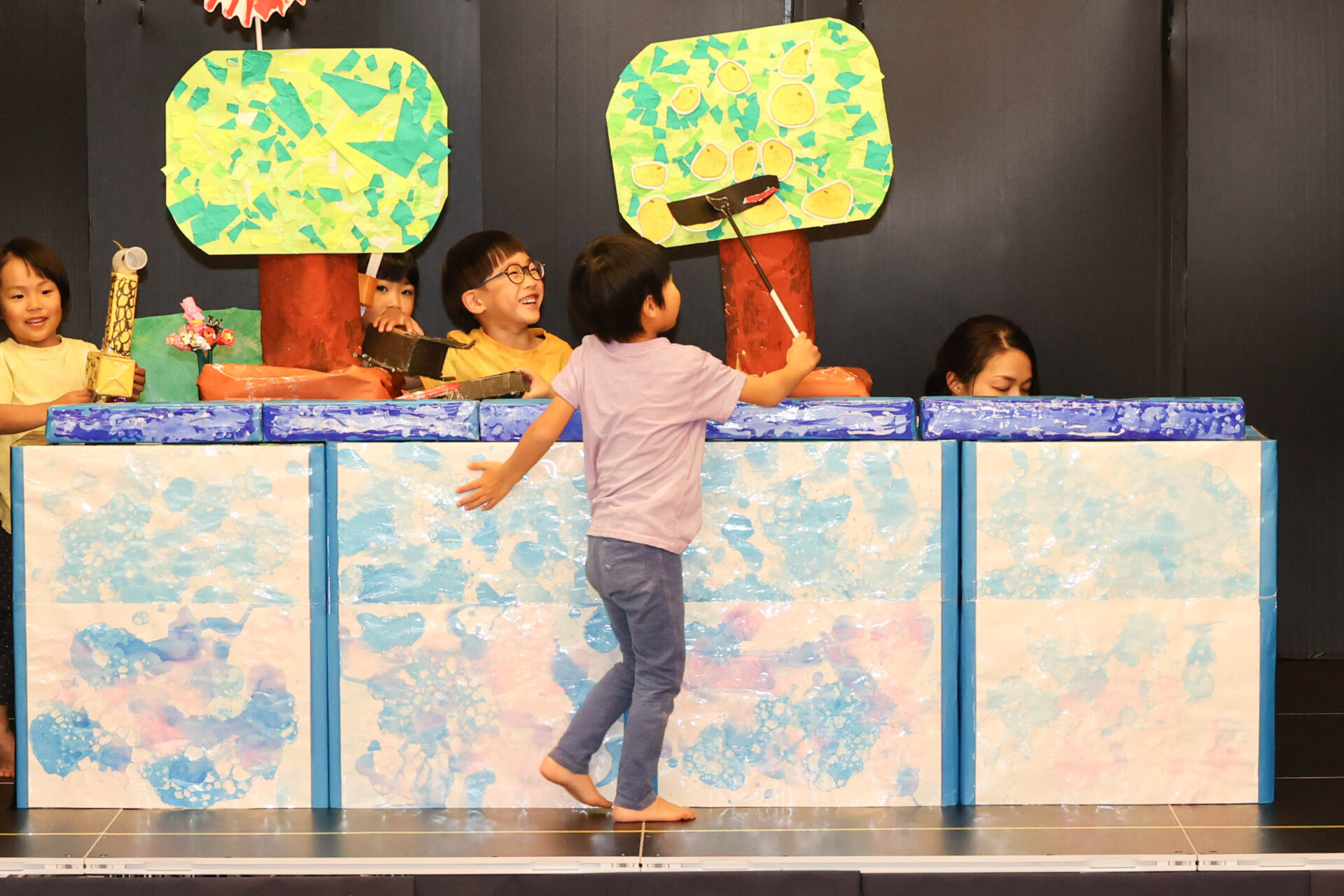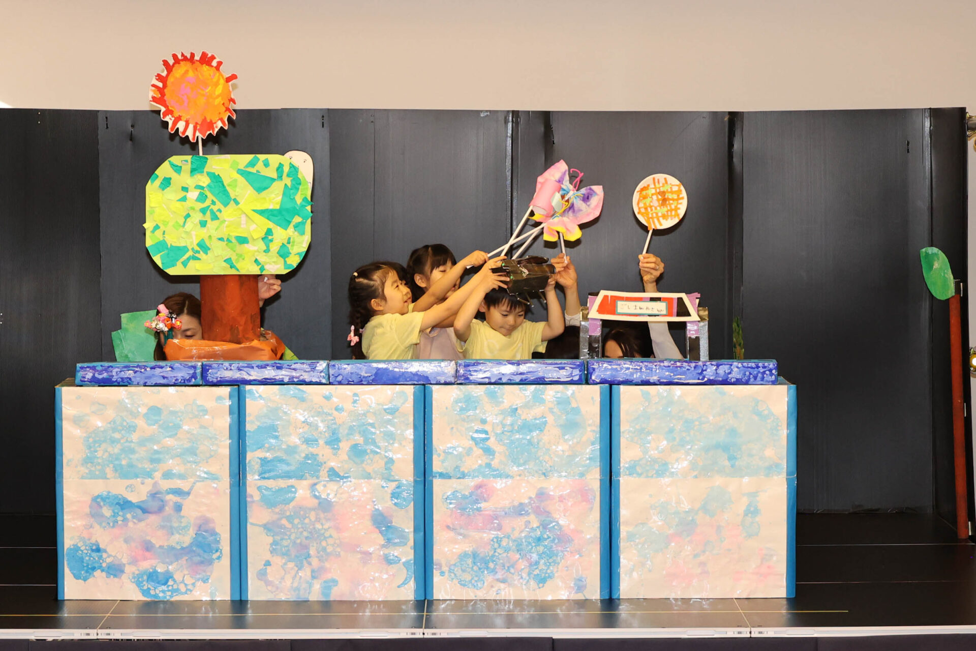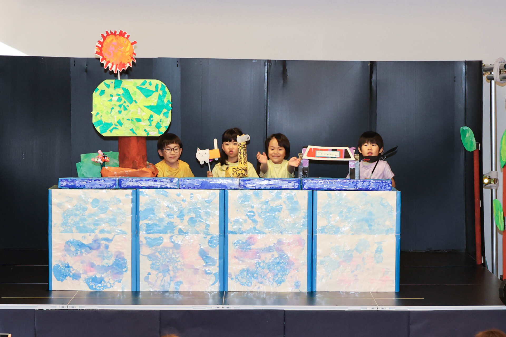 登場する生き物たちを何にするか、何で作るか、どんなセリフやお話にするのかをこどもたちと一緒に考えた内容は、今年のそら組のこどもたちらしさが表れた作品です。