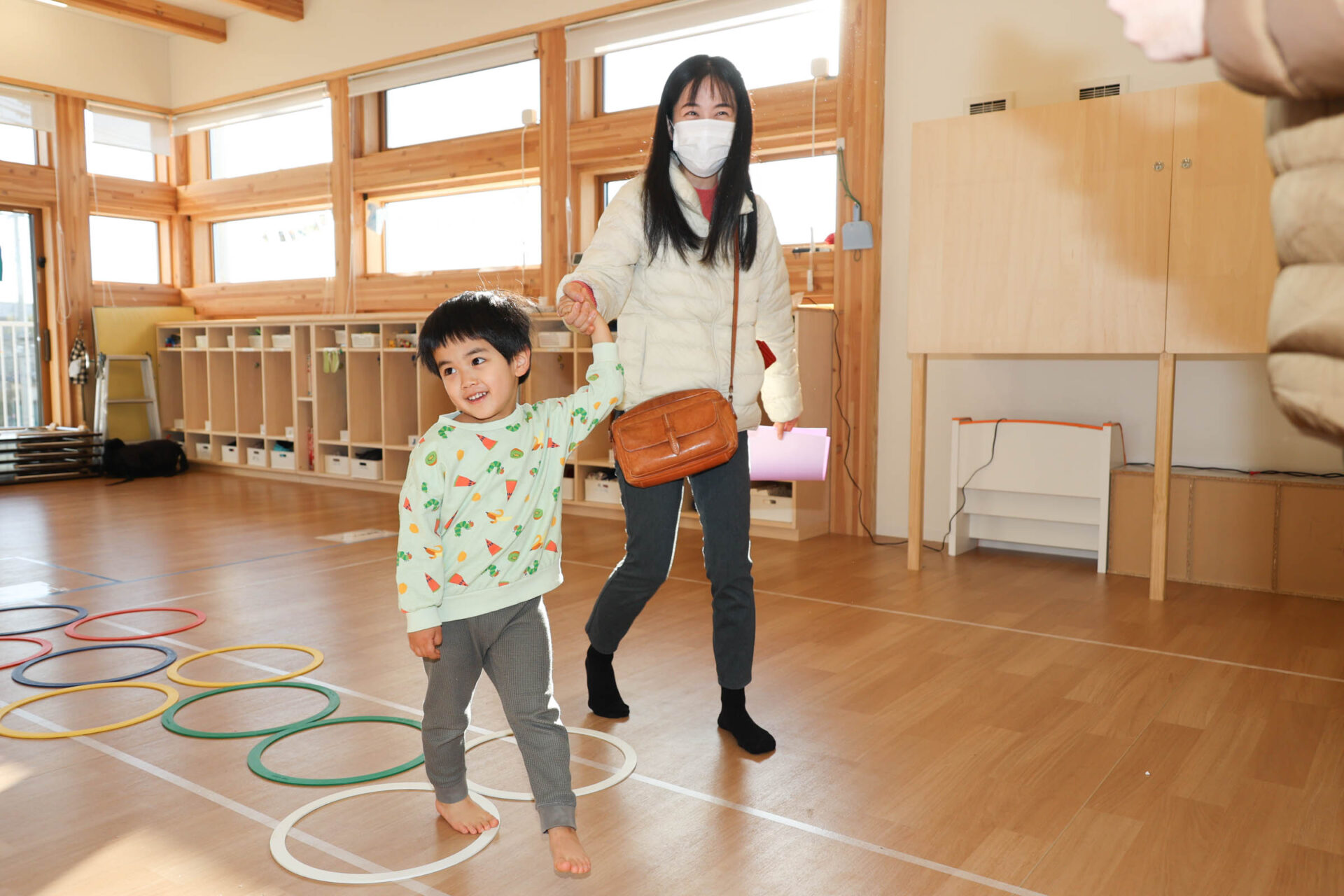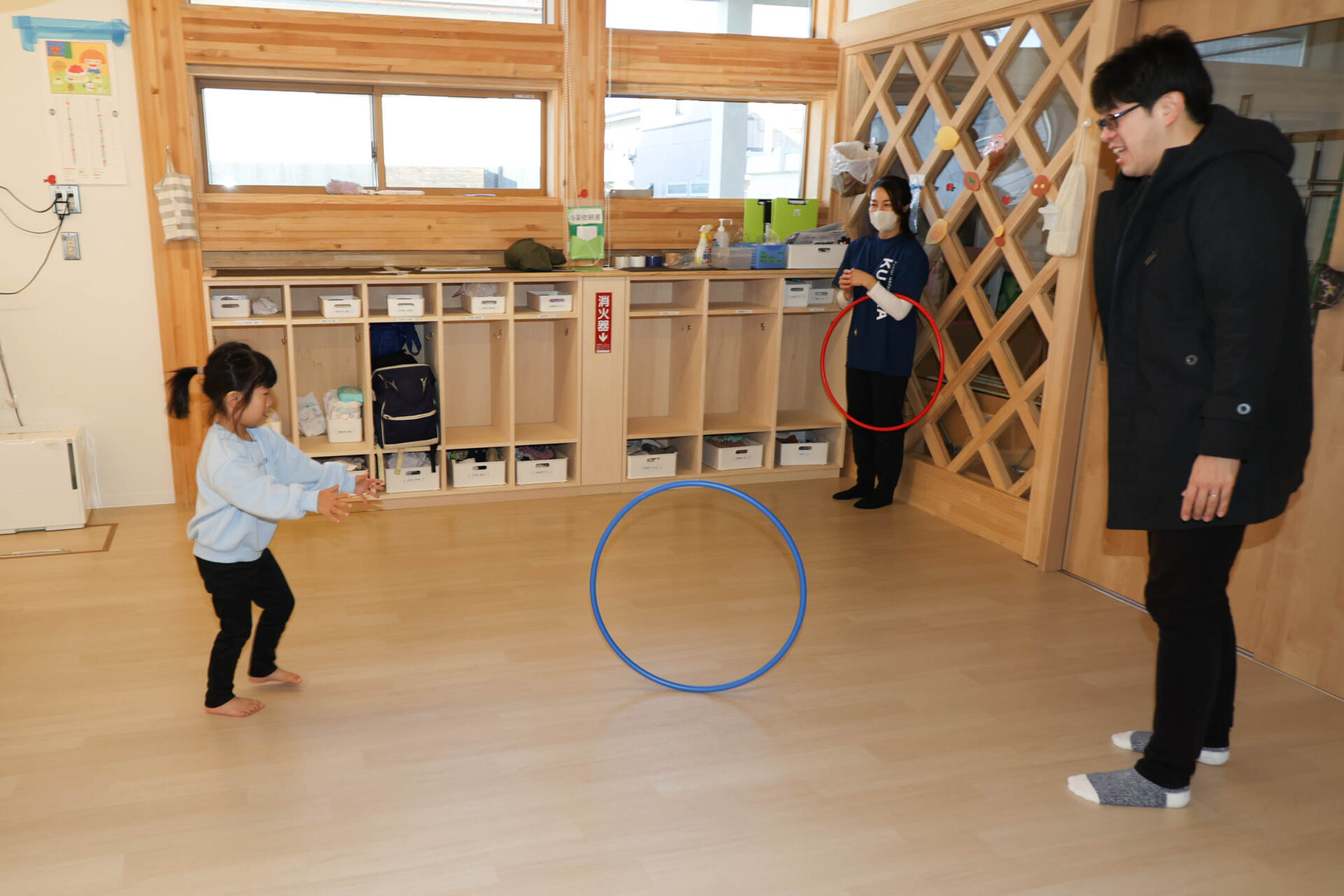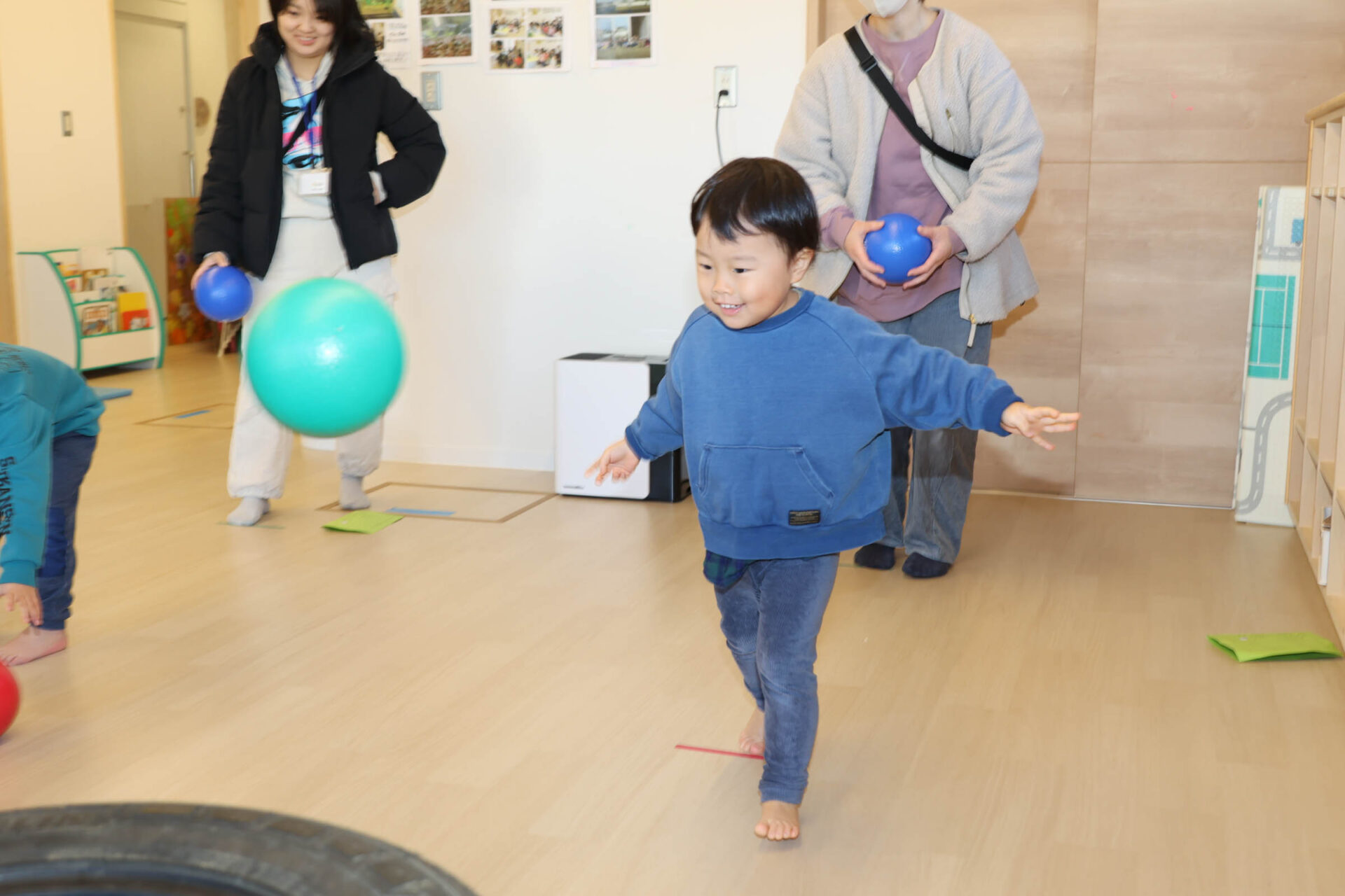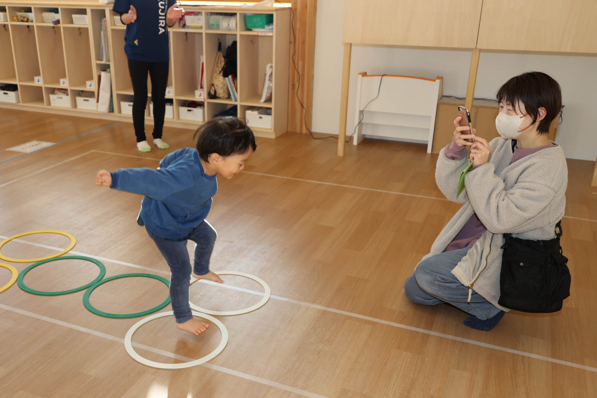 「こっち、こっち!」「これ、できるよ!」など、こどもたちがお家の方の手を引いて教えたり、出来るようになったことを自信を持ってやって見せたりなど、親子で遊びながら、園でのこどもたちの遊びを体験したり、知っていただく機会になりました。