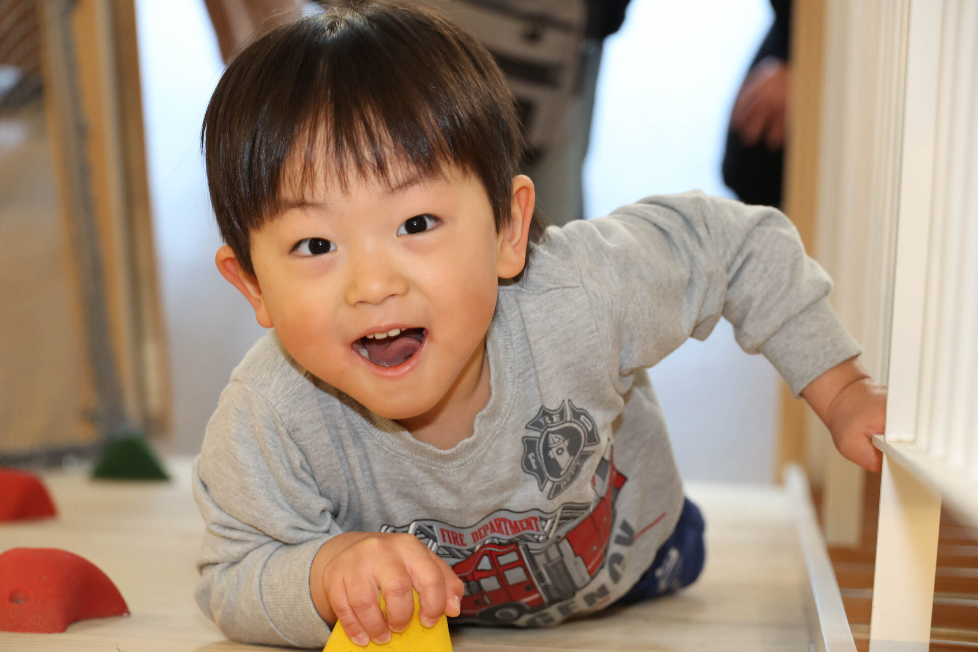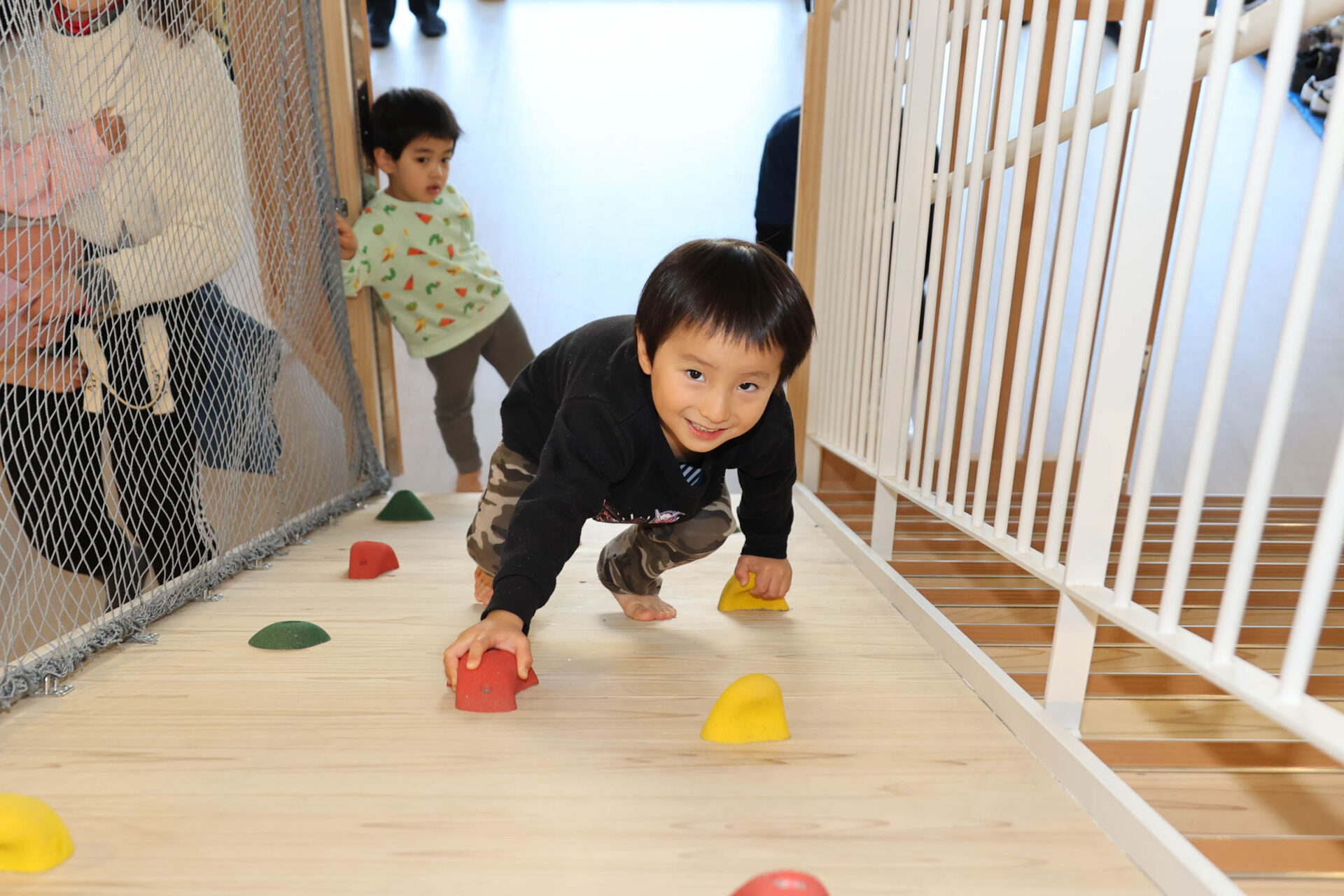 階段脇にあるボルダリングコーナーなど、園内のコーナーを親子で一緒に遊びながら、シールを集めるスタンプラリーを行いました。