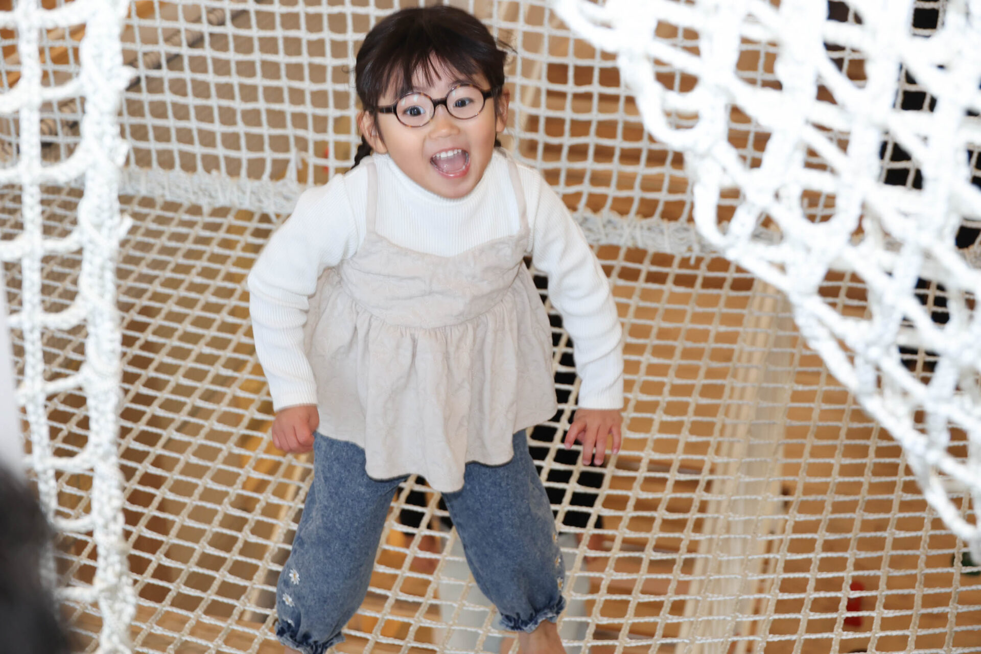 2階吹き抜けのアスレチックネットやフラフープコーナー、